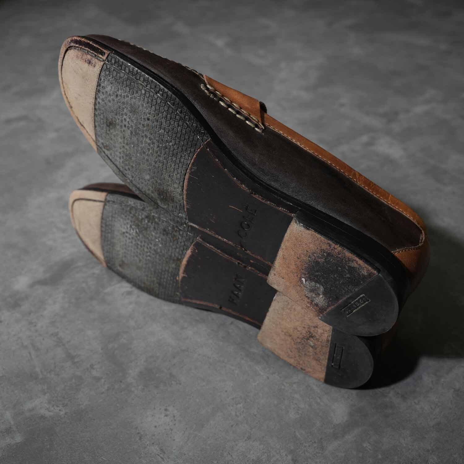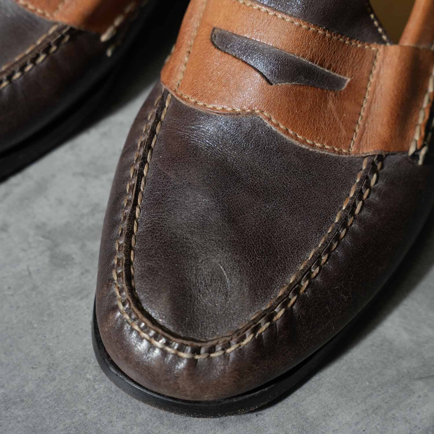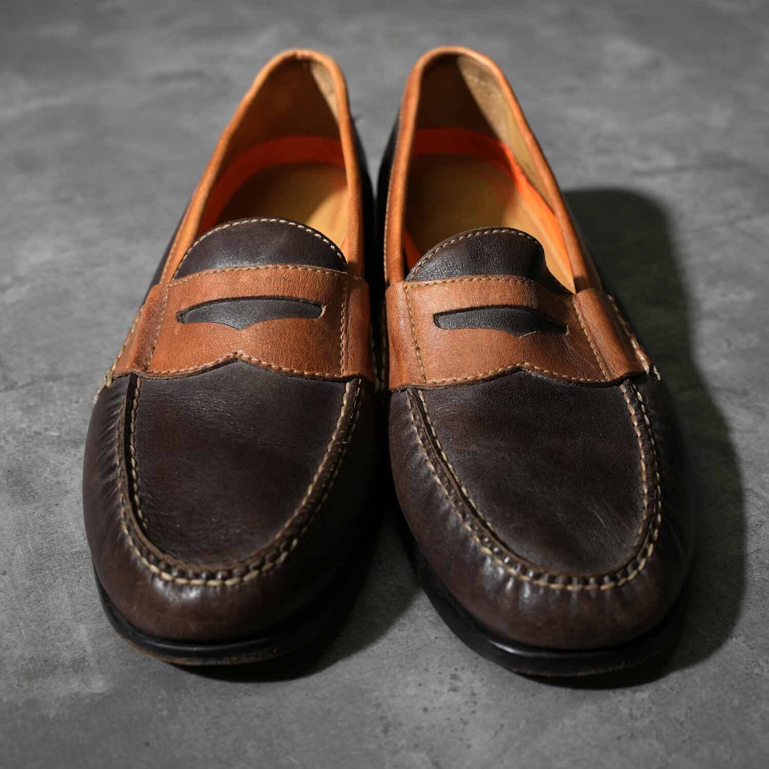 アッパーにはブラウン系レザーを使用。履き込みによる自然なシワや艶の変化が見られ、古着ならではの表情がしっかりと育った個体。ローファーらしいスマートなトゥラインと、程よくカジュアルなバランス感は、デニムやチノパンはもちろん、スラックス外しにも相性良好。