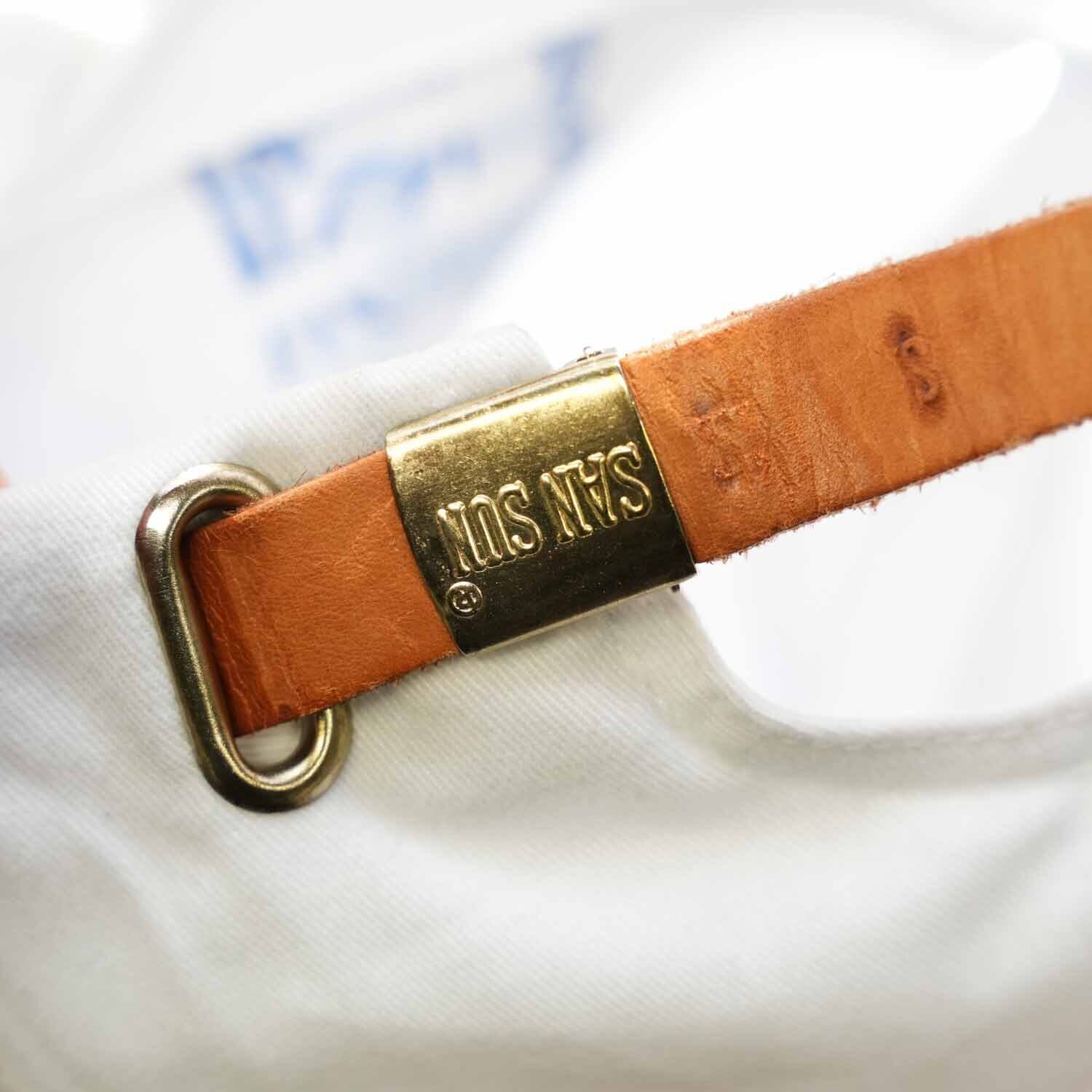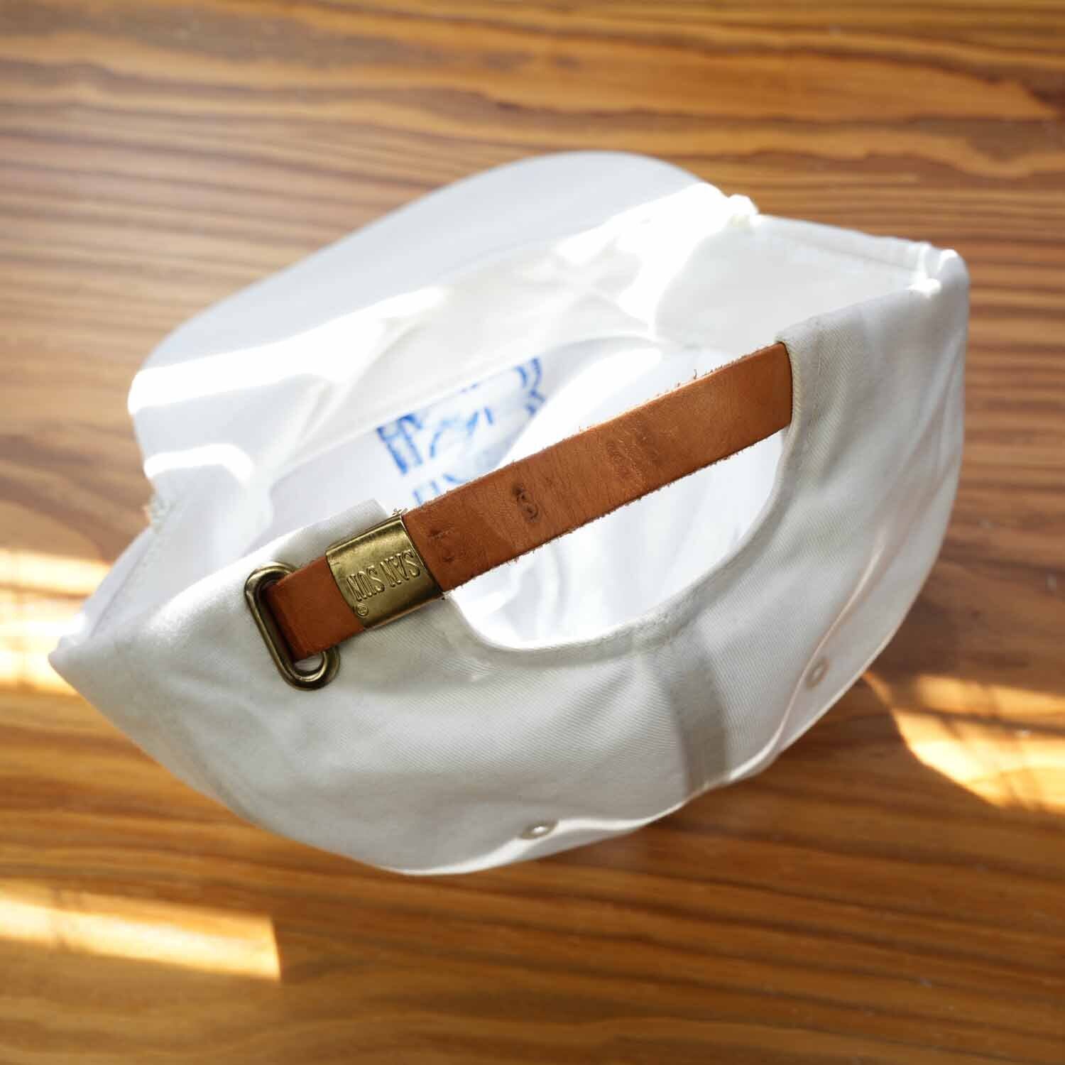 フロントパネルは程よくハリのある素材感で、型崩れしにくく、ブリム上部にはロープ(コード)デザインを採用。バックにはレザーストラップ仕様で、「SAN SUN」刻印入りの金属パーツが使われており、シンプルな中にも当時らしいディテールがしっかり残っています。