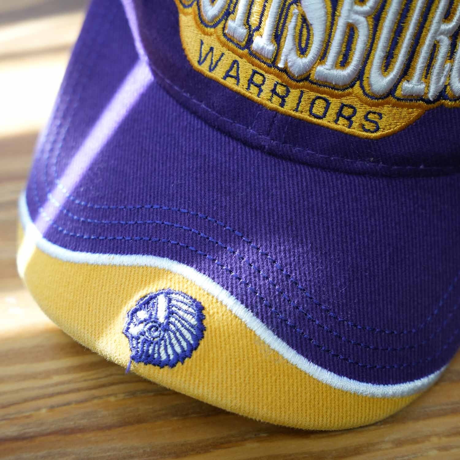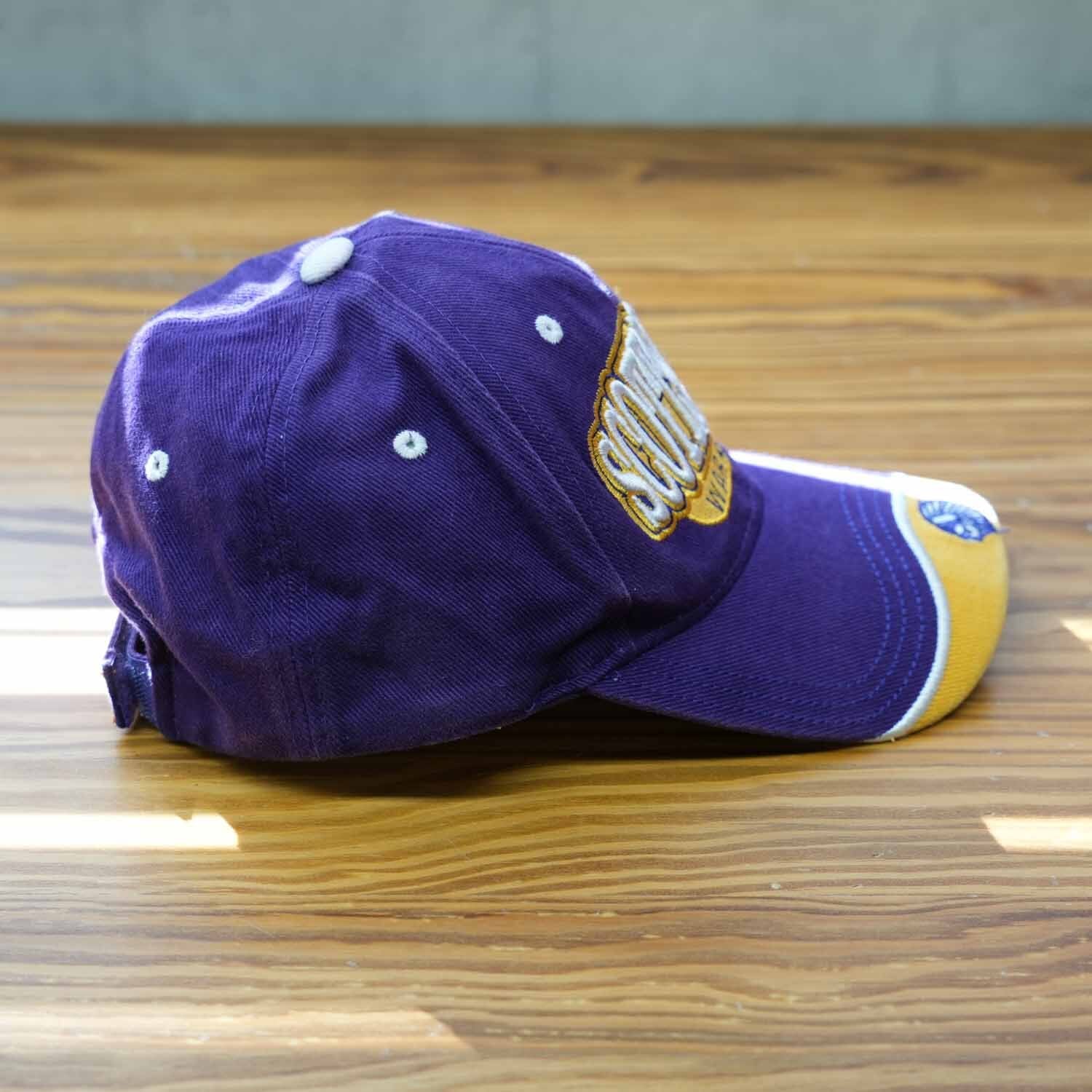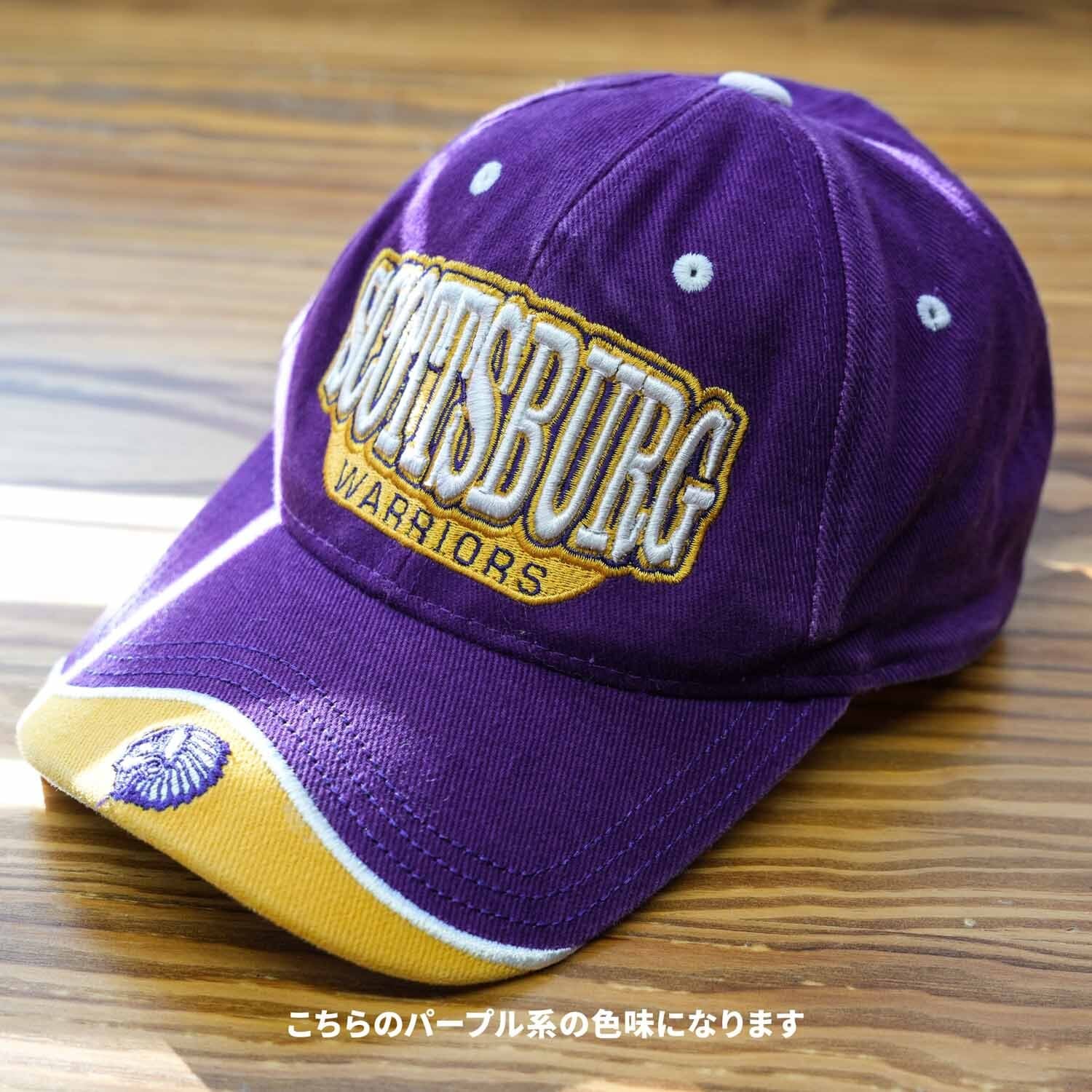 SCOTTSBURG WARRIORS(スコッツバーグ・ウォリアーズ)のロゴ刺繍が目を引く、パープルカラーのスポーツキャップ。フロントに大判のチームロゴ刺繍、ツバ先にはアイコン的な刺繍ワンポイントを配置した、アメリカンスポーツらしい存在感のある一品です。