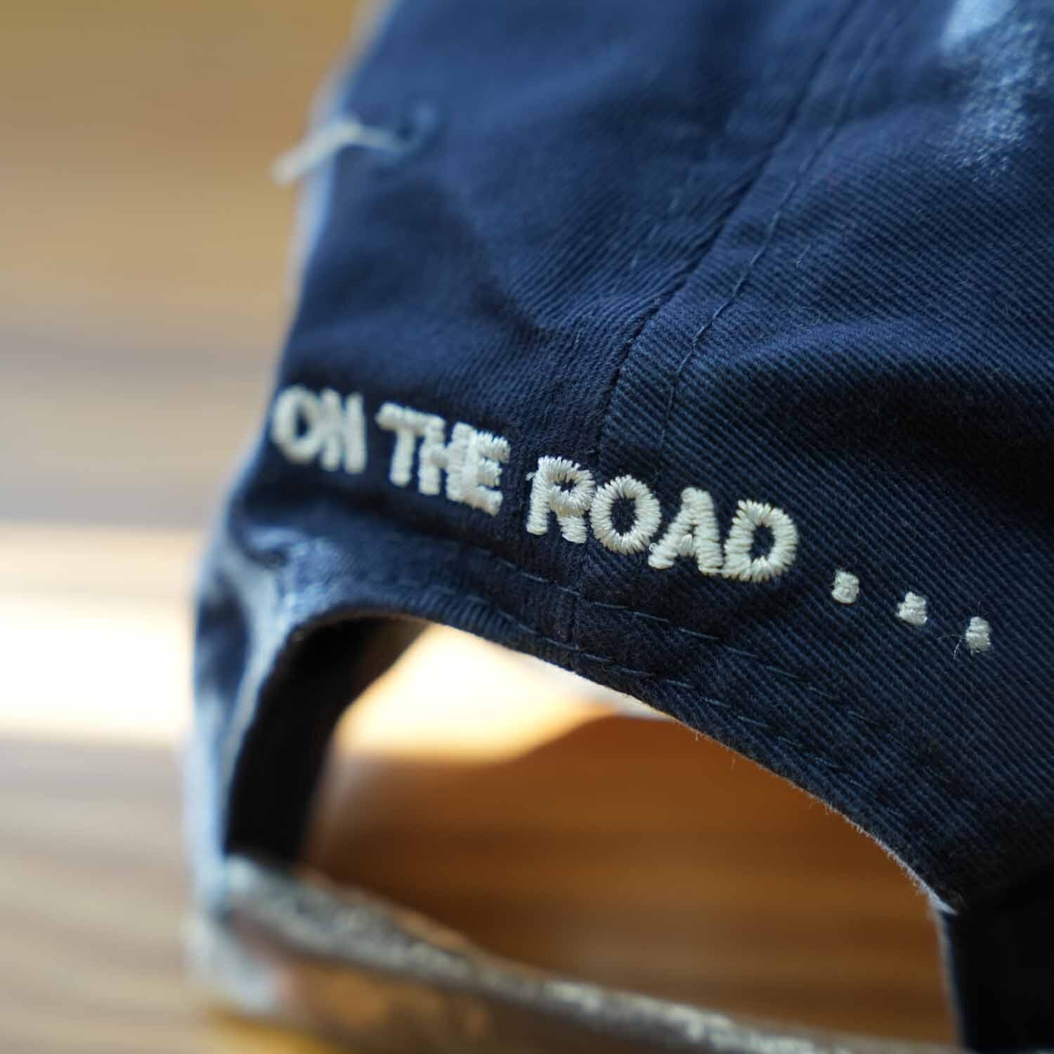 バックには「ON THE ROAD…」の刺繍、アジャスターは金属バックル仕様。