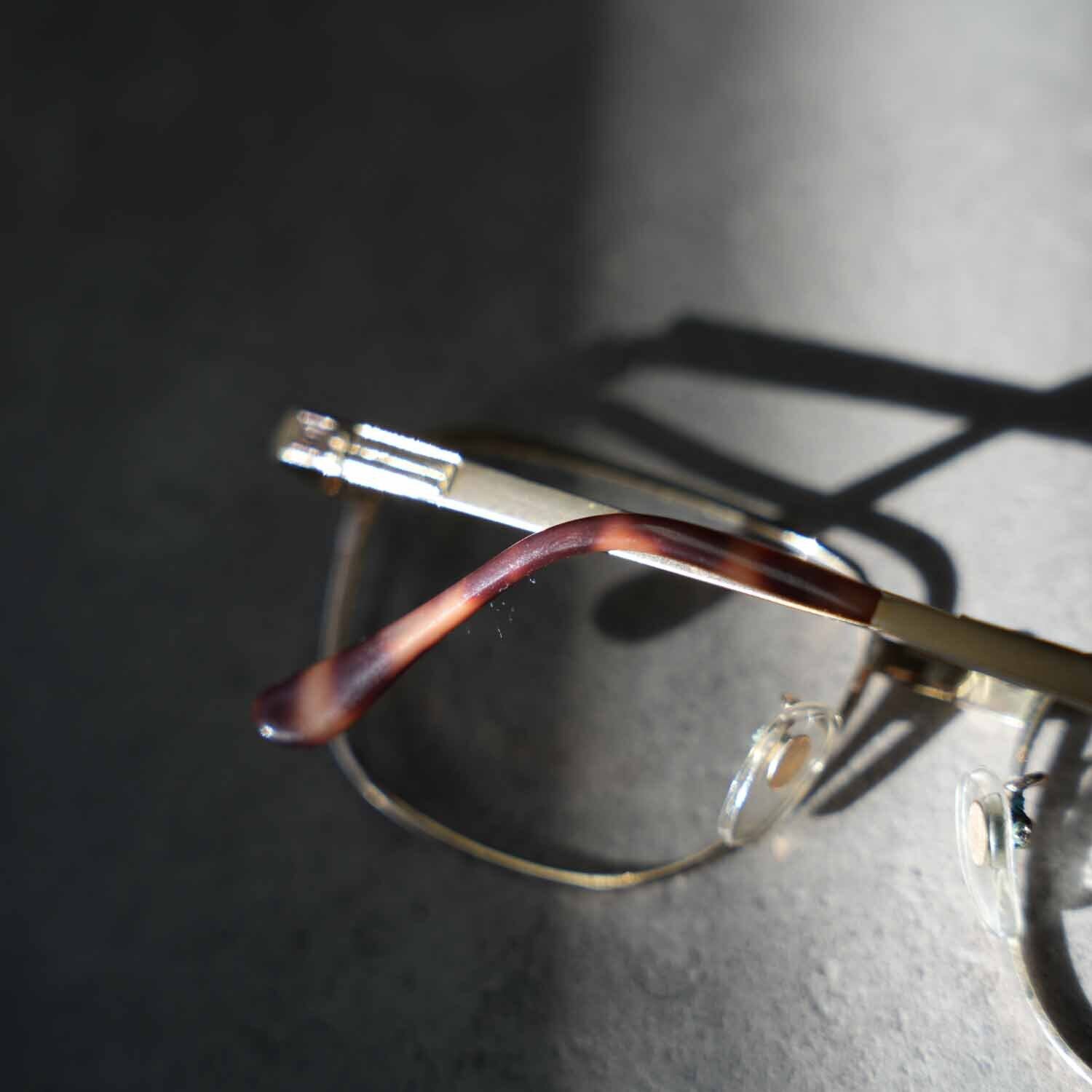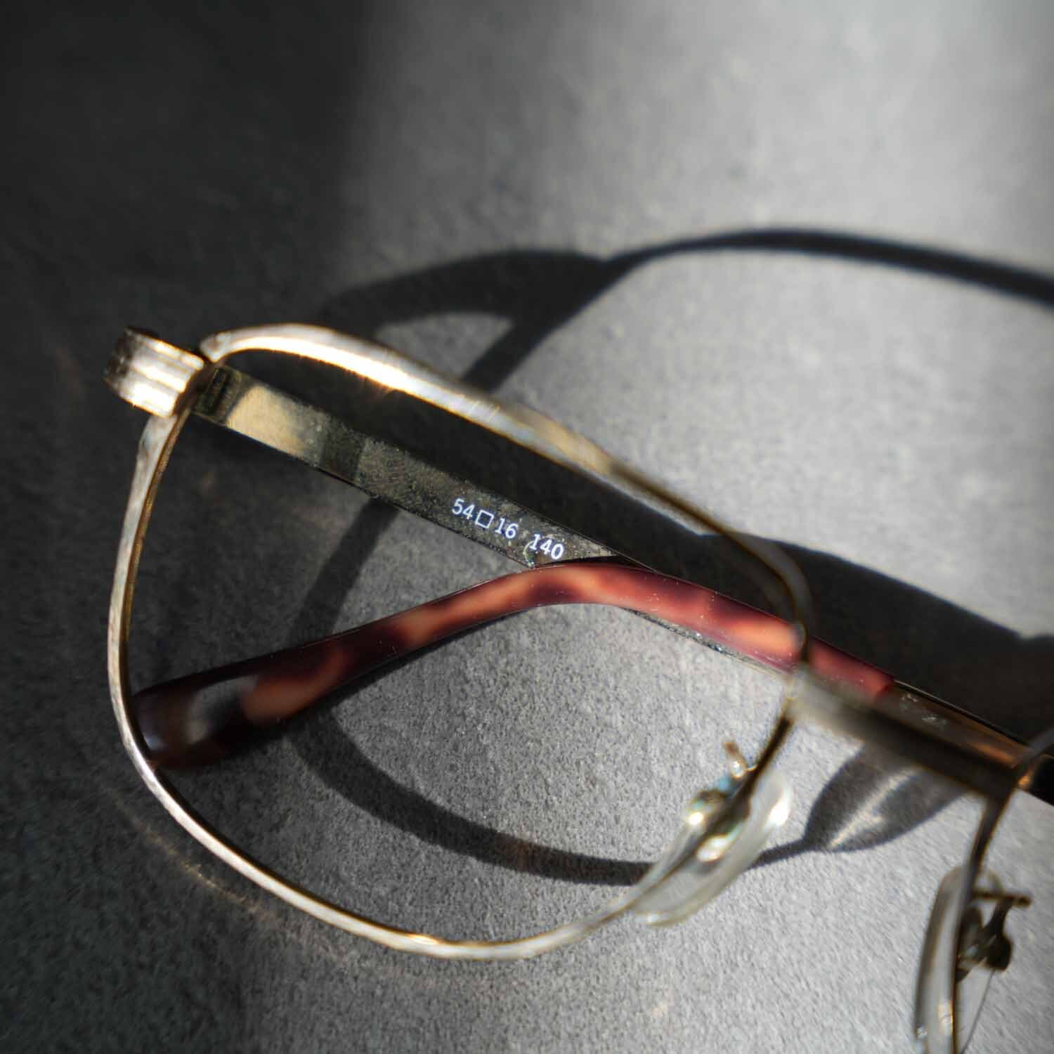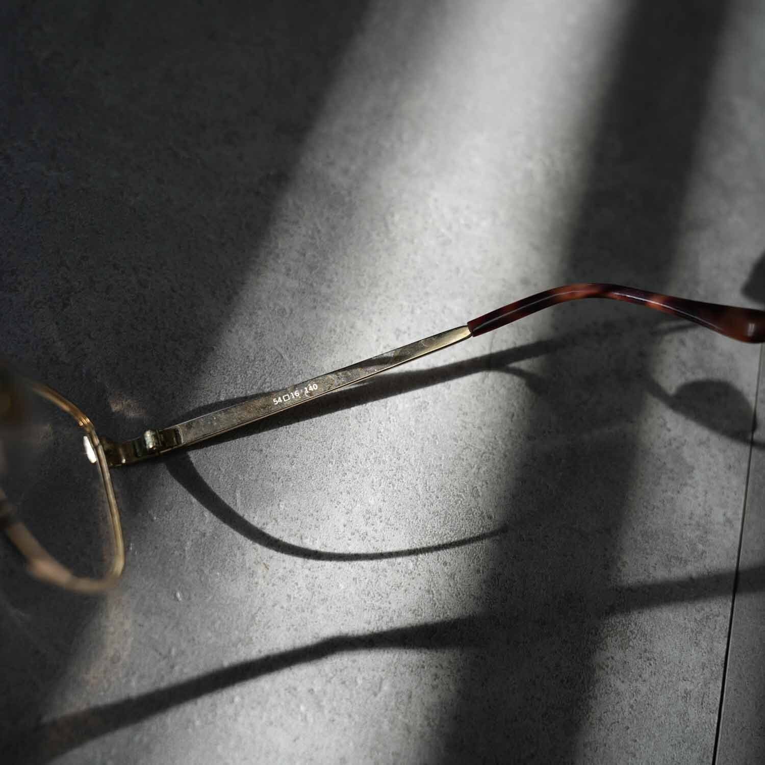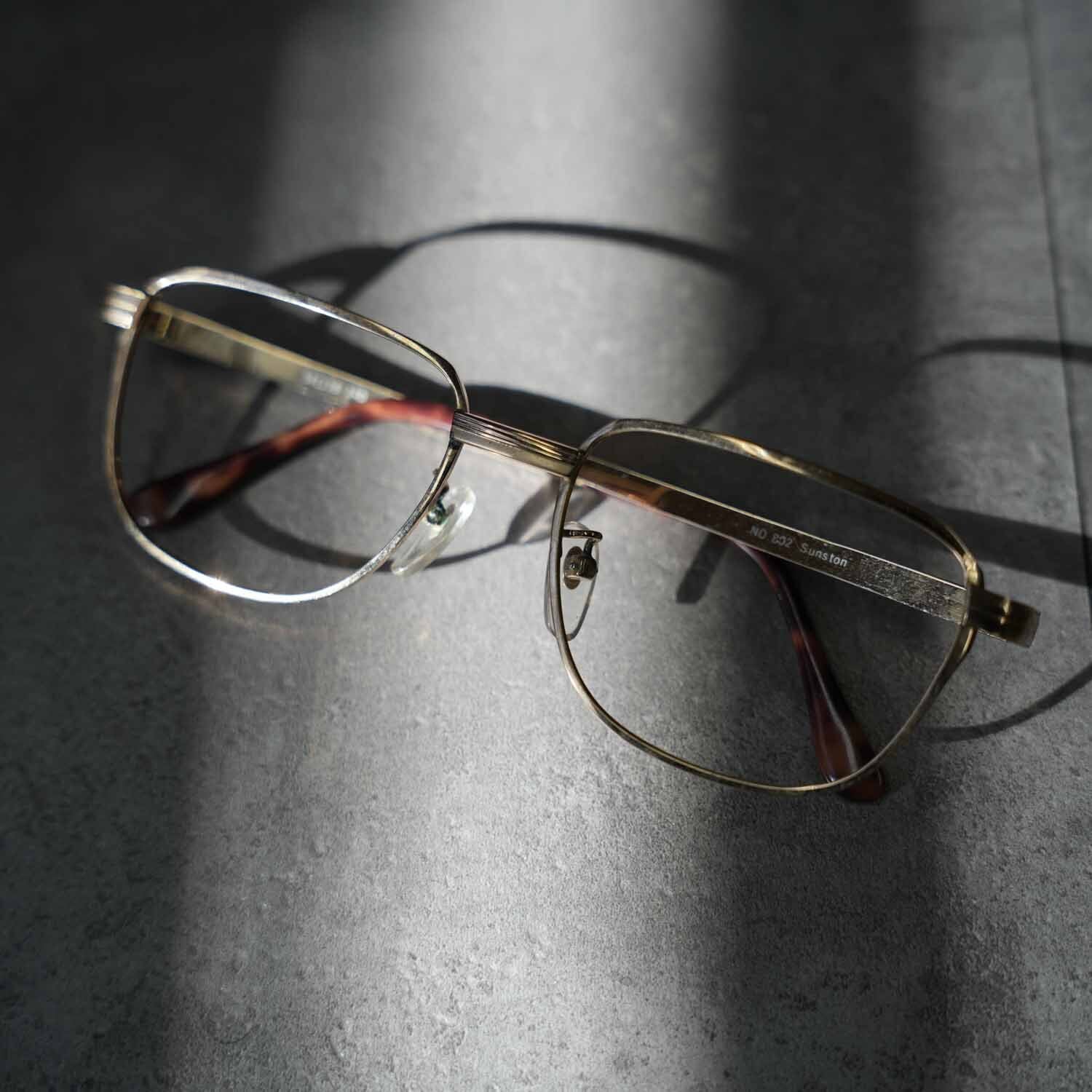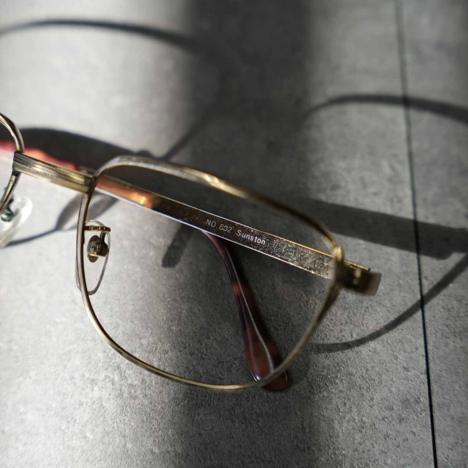 テンプル内側には「NO.802 Sunston」の刻印が入り、当時の量産品とは一線を画す、しっかりとした作りと美意識が感じられます。無駄を削ぎ落としたスクエア寄りのレンズシェイプ。華奢なゴールドメタルフレームが、顔まわりに知的で品のある印象を与えます。