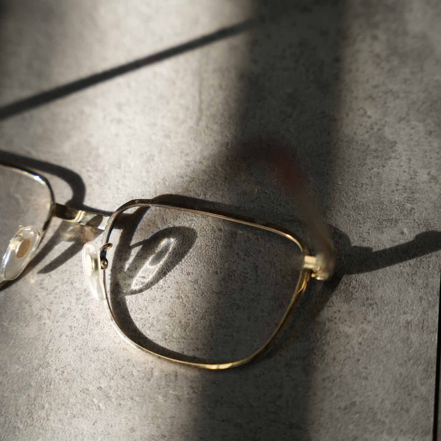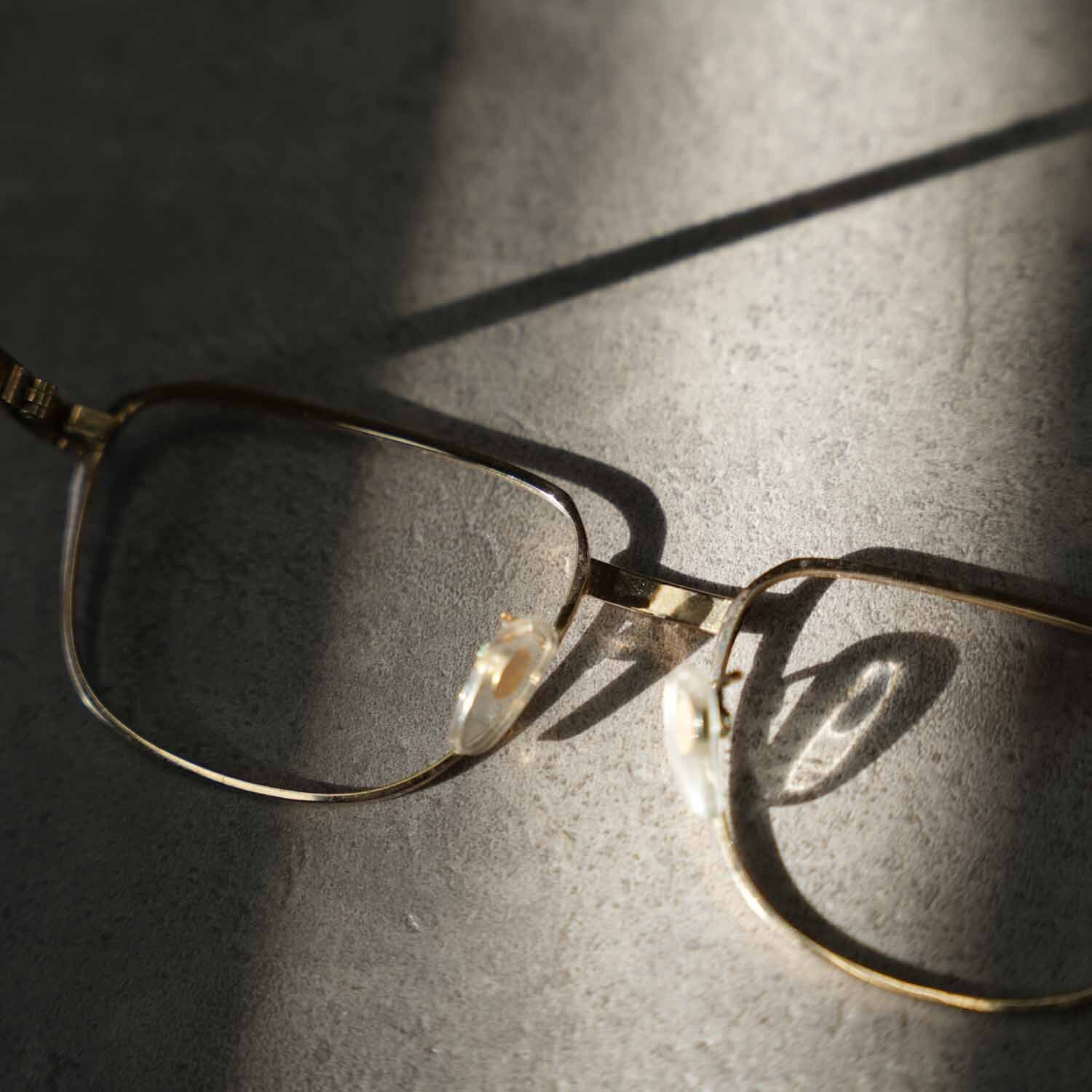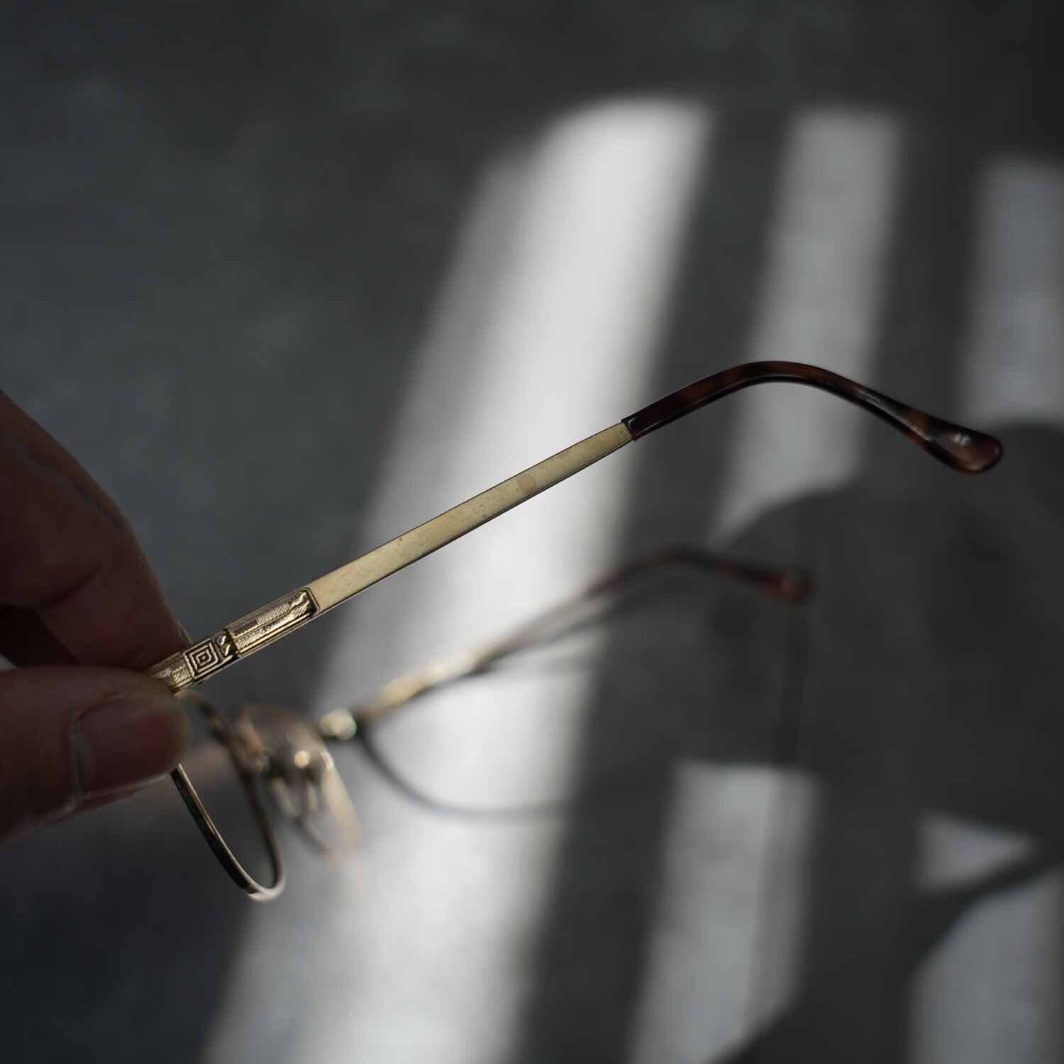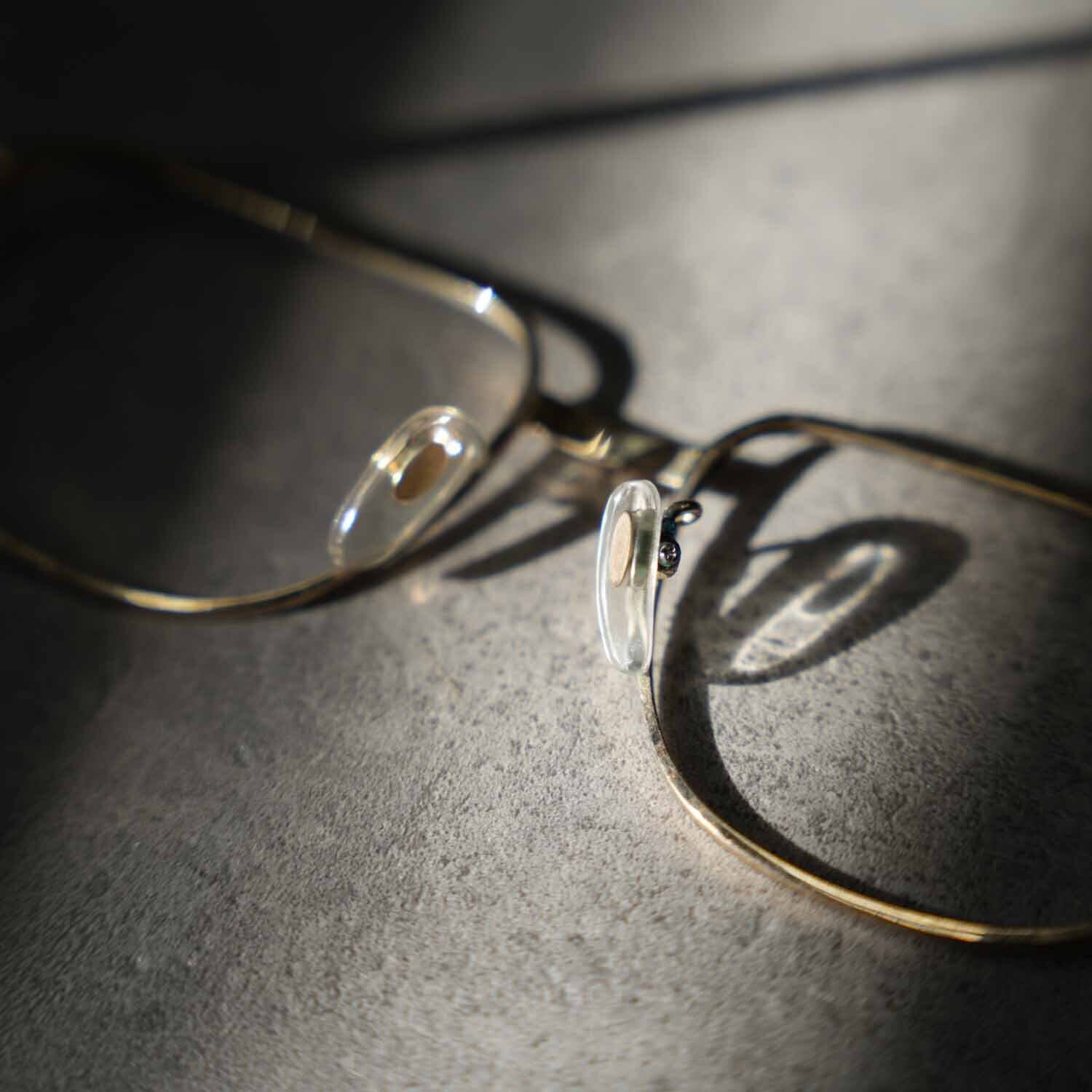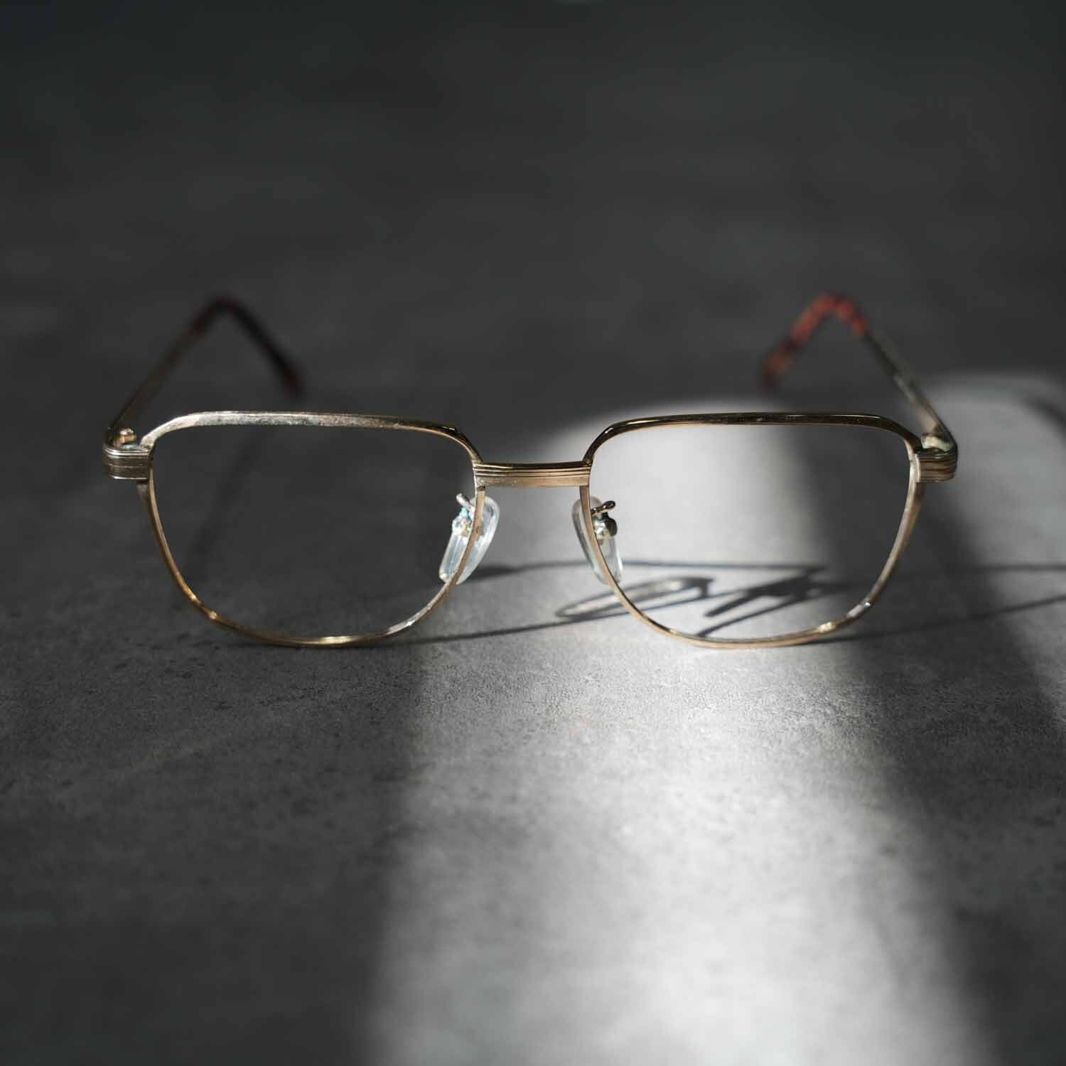テンプル内側には「NO.802 Sunston」の刻印が入り、当時の量産品とは一線を画す、しっかりとした作りと美意識が感じられます。無駄を削ぎ落としたスクエア寄りのレンズシェイプ。華奢なゴールドメタルフレームが、顔まわりに知的で品のある印象を与えます。
