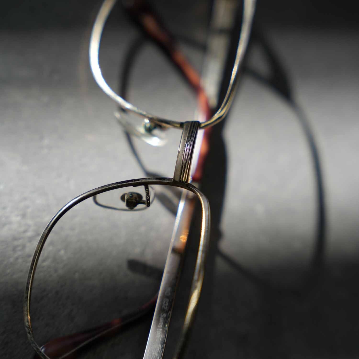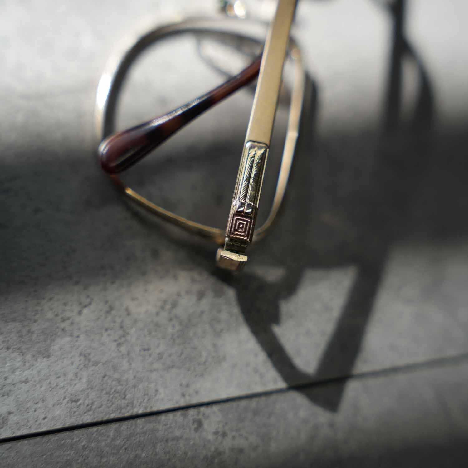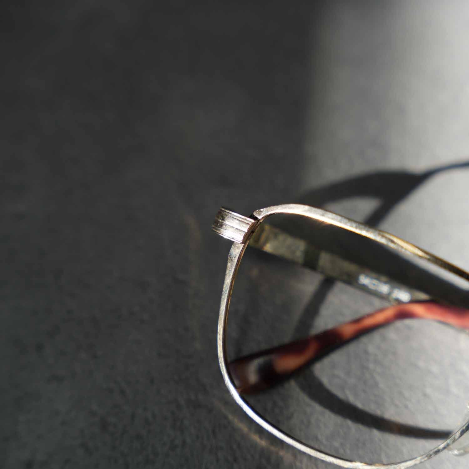 ブリッジと智(ヨロイ)部分には、60年代らしい繊細な装飾が施され、さりげない立体感を演出。テンプルエンドはブラウン系のセル素材で切り替えられ、金属フレーム特有の硬さを程よく中和。クラシックと実用性を両立した、当時の日本職人らしい設計です。