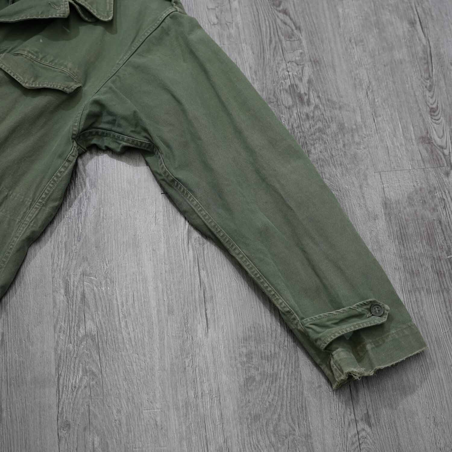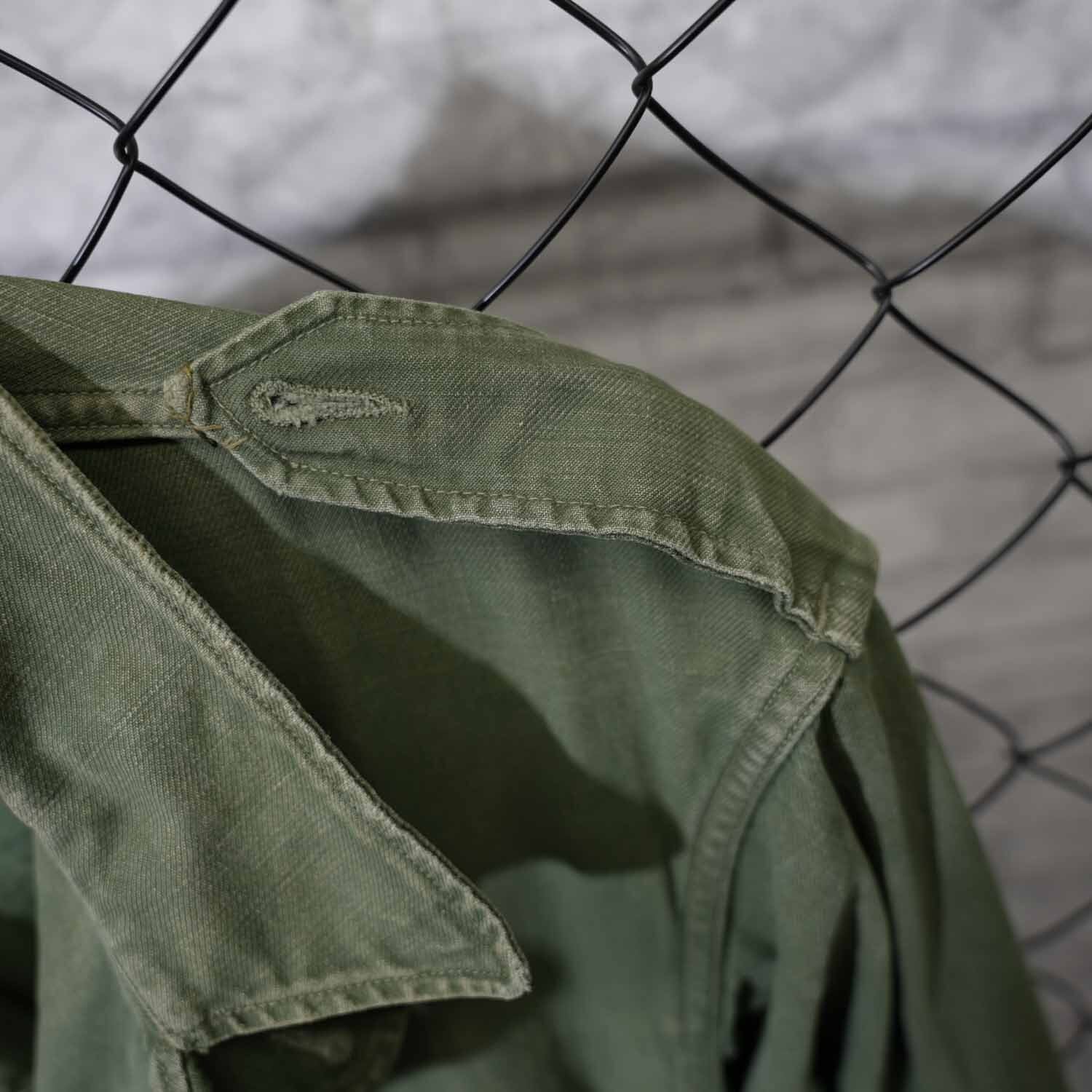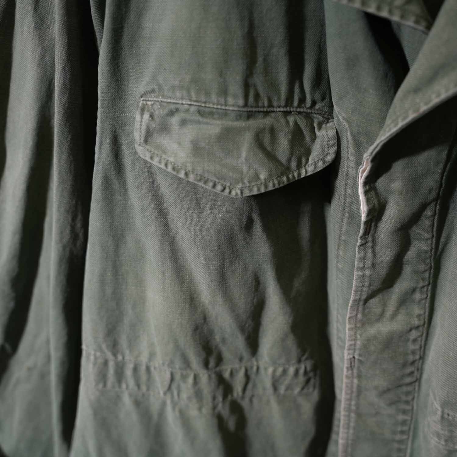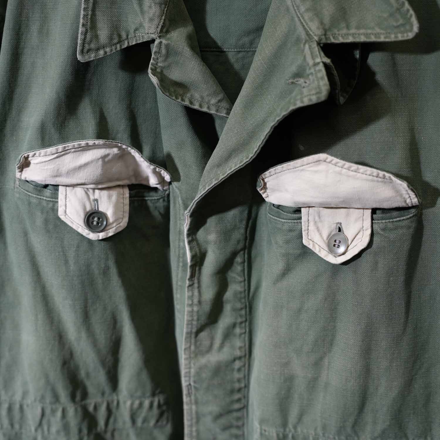 生地はコットン100%表記。使い込まれた風合いから、当時の実用品ならではのタフさと、長年の着用によって生まれた柔らかさを感じ取れます。随所に見られるアタリや色ムラも、ヴィンテージミリタリーならではの味わい。