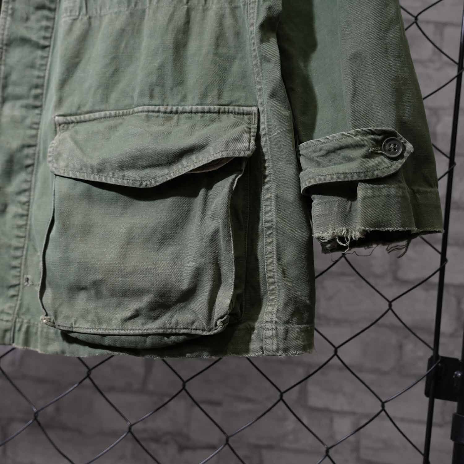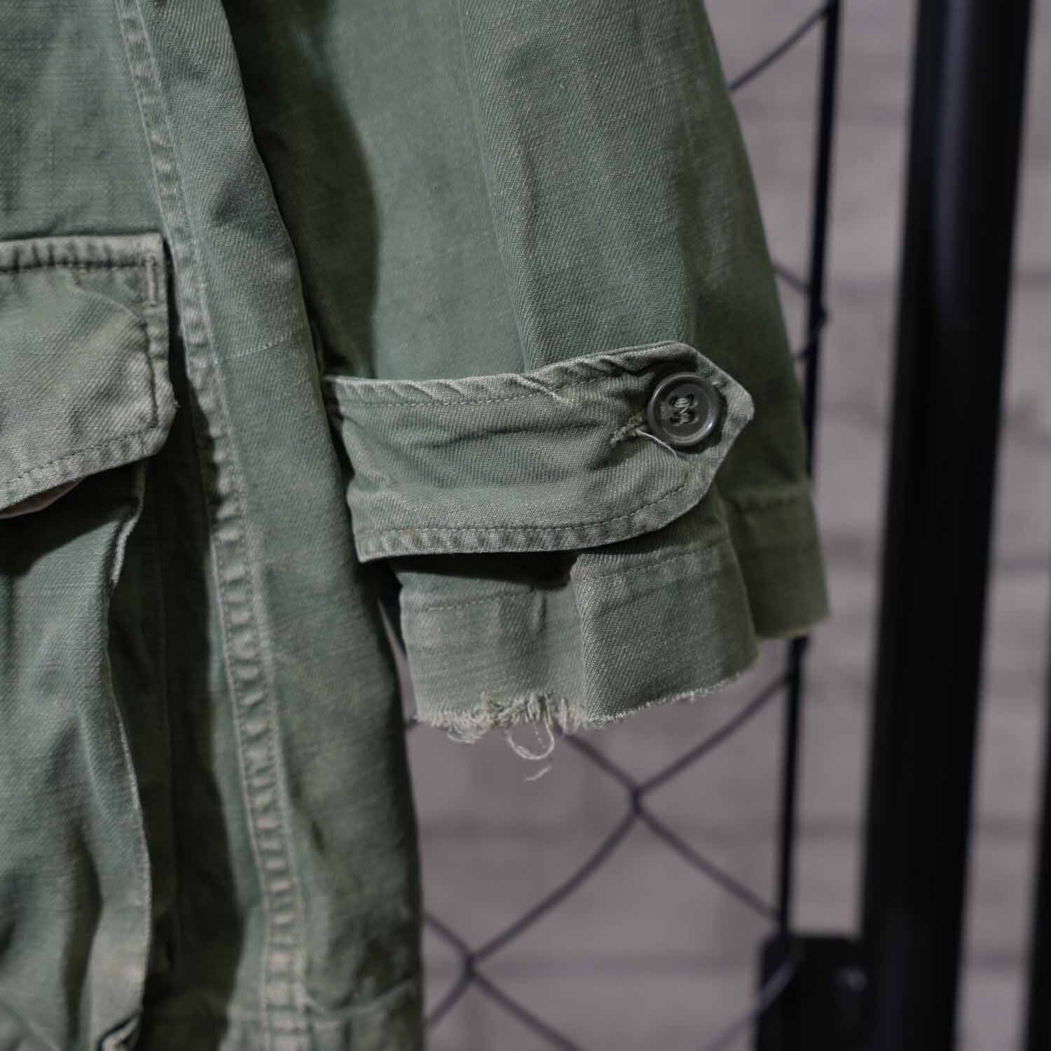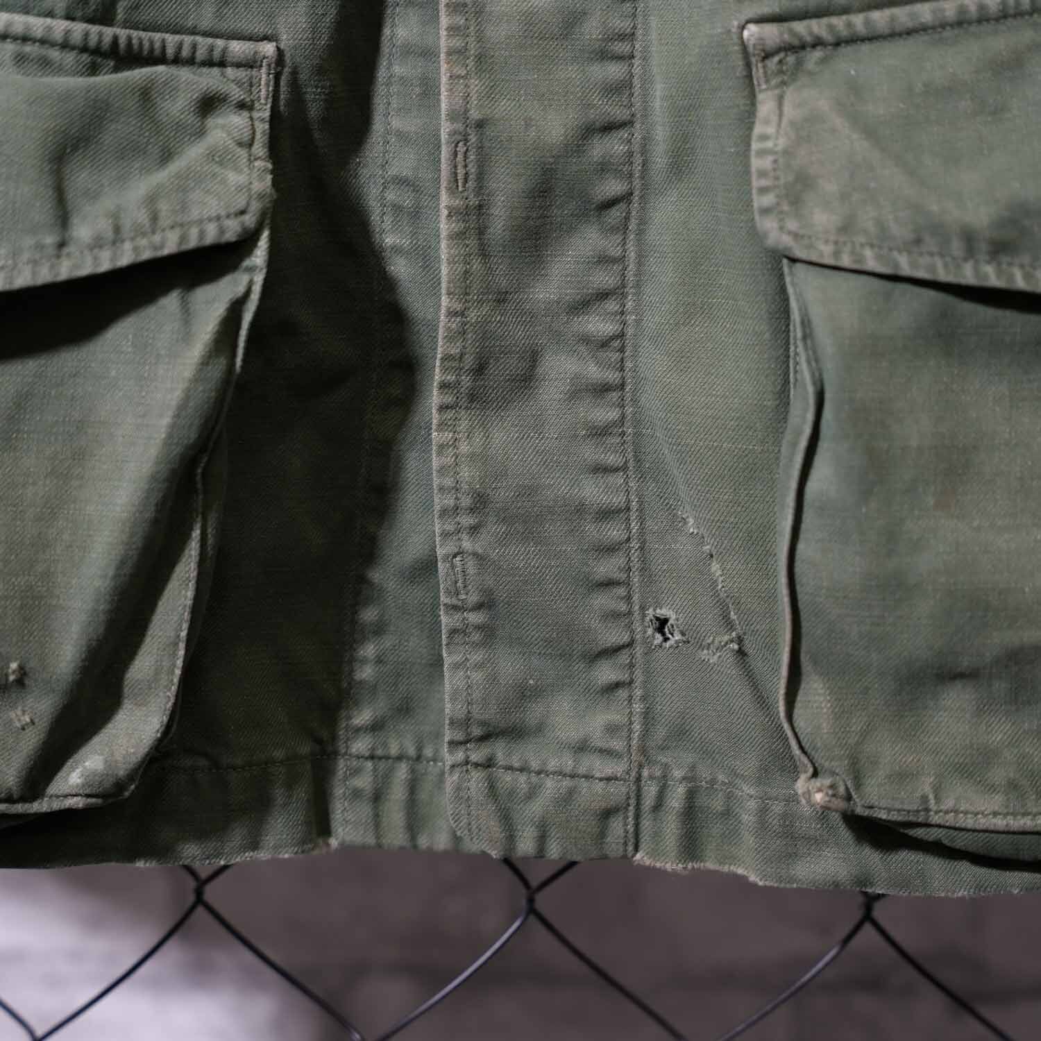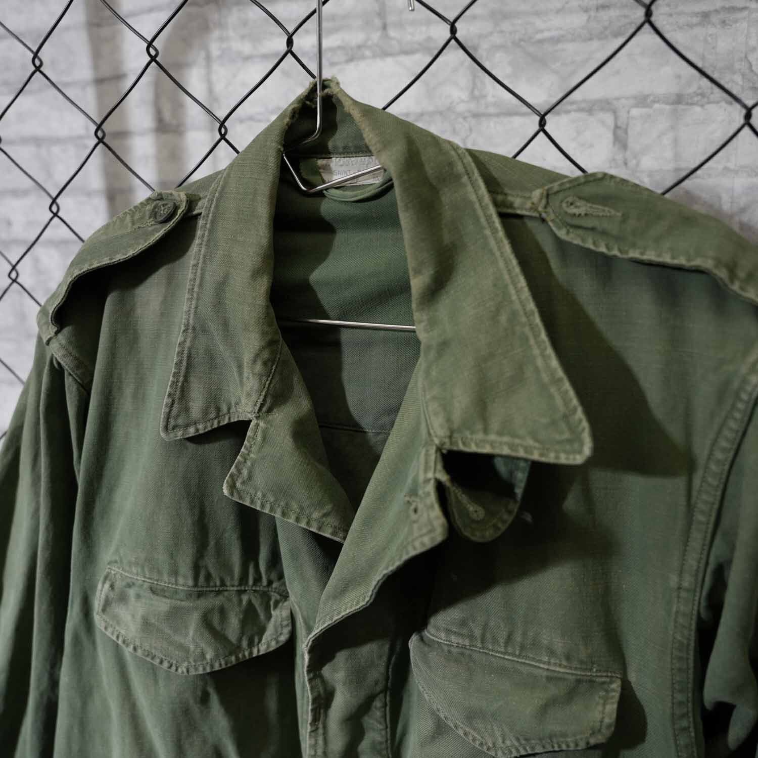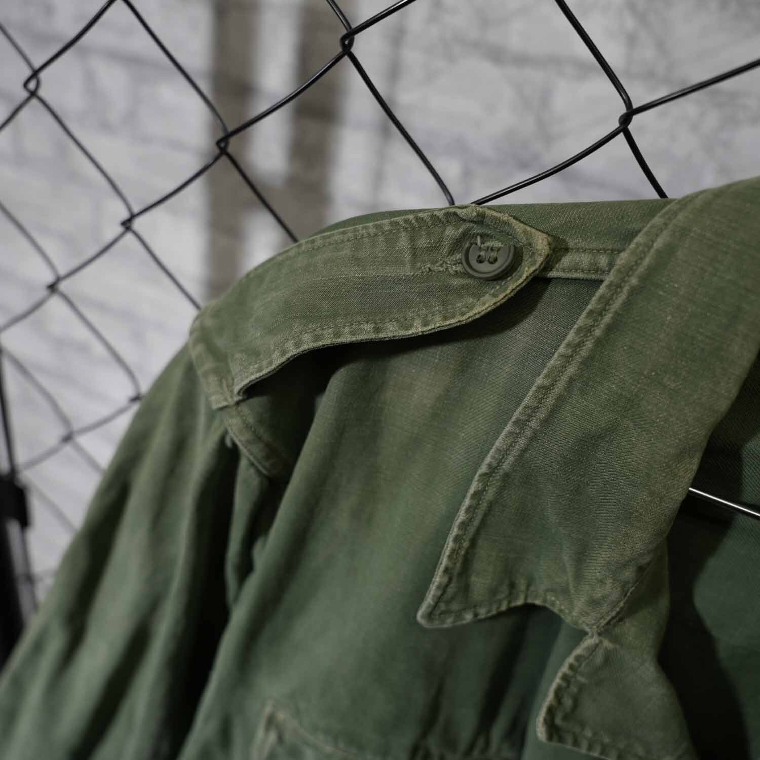 生地はコットン100%表記。使い込まれた風合いから、当時の実用品ならではのタフさと、長年の着用によって生まれた柔らかさを感じ取れます。随所に見られるアタリや色ムラも、ヴィンテージミリタリーならではの味わい。