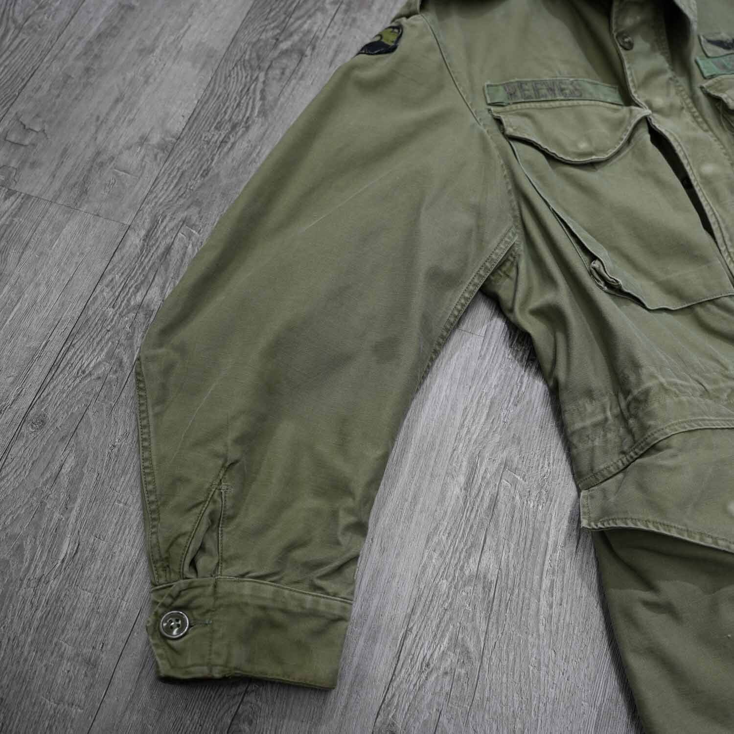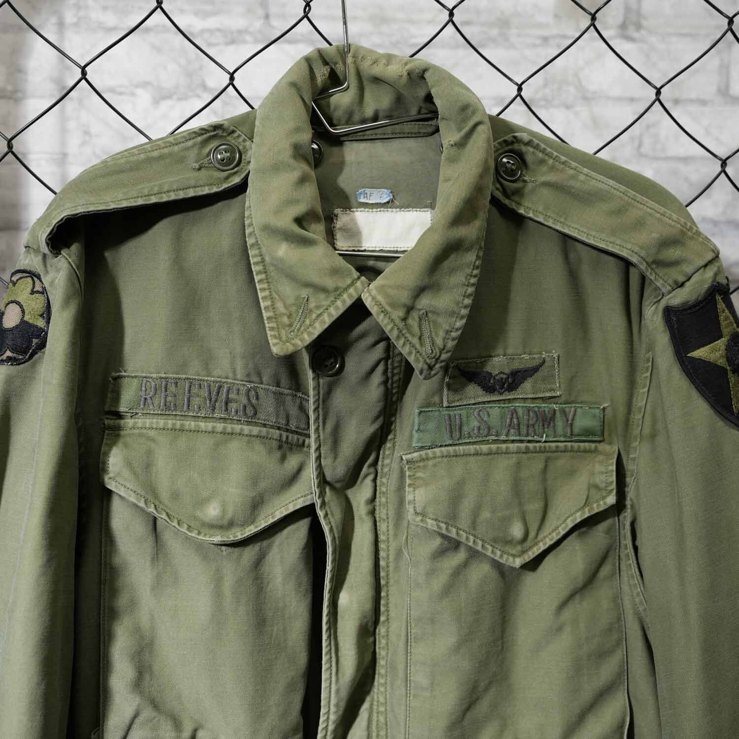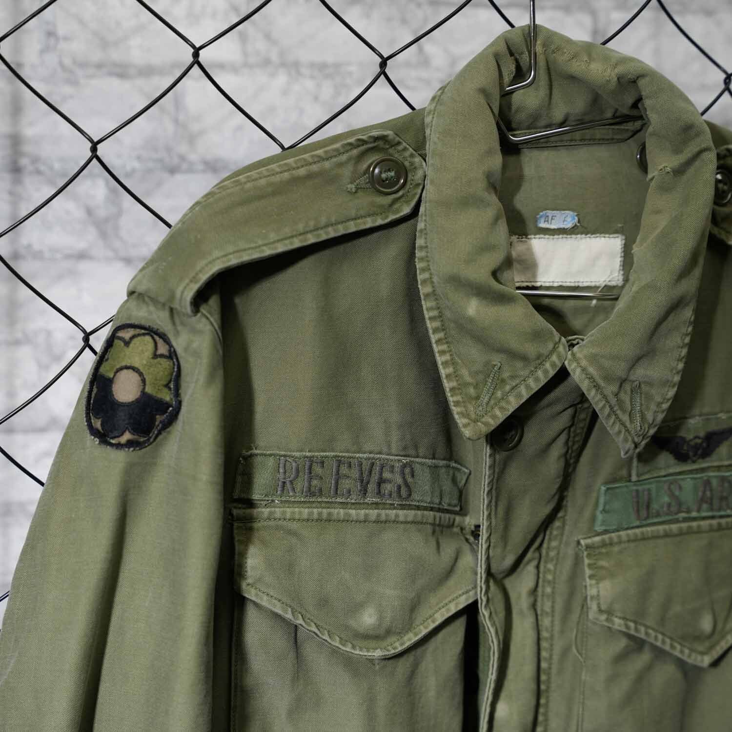 胸元にはU.S. ARMYテープと航空章、ネームテープ「REEVES」、肩には部隊パッチが残存。いずれも後年に縫い付けられた可能性はありますが、実際に兵士が着用していたことを物語るリアルな佇まいで、レプリカや未使用品では得られない説得力があります。