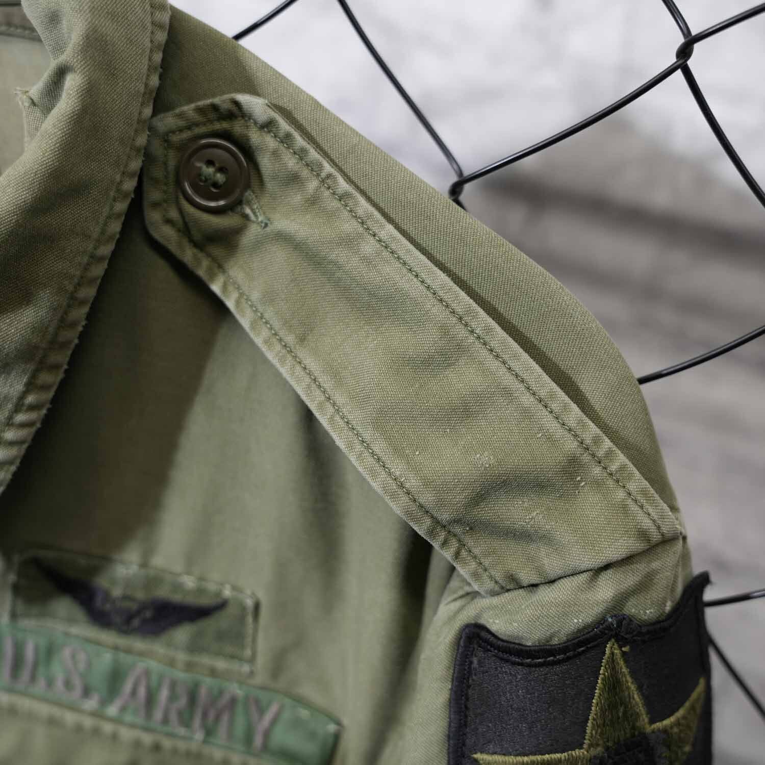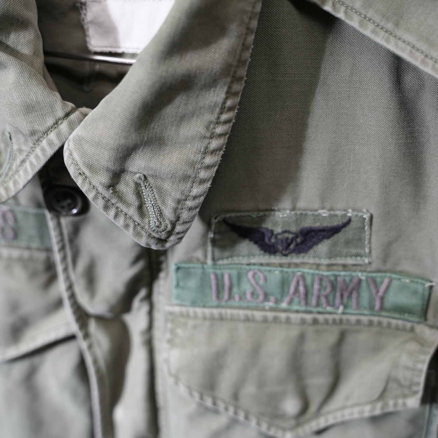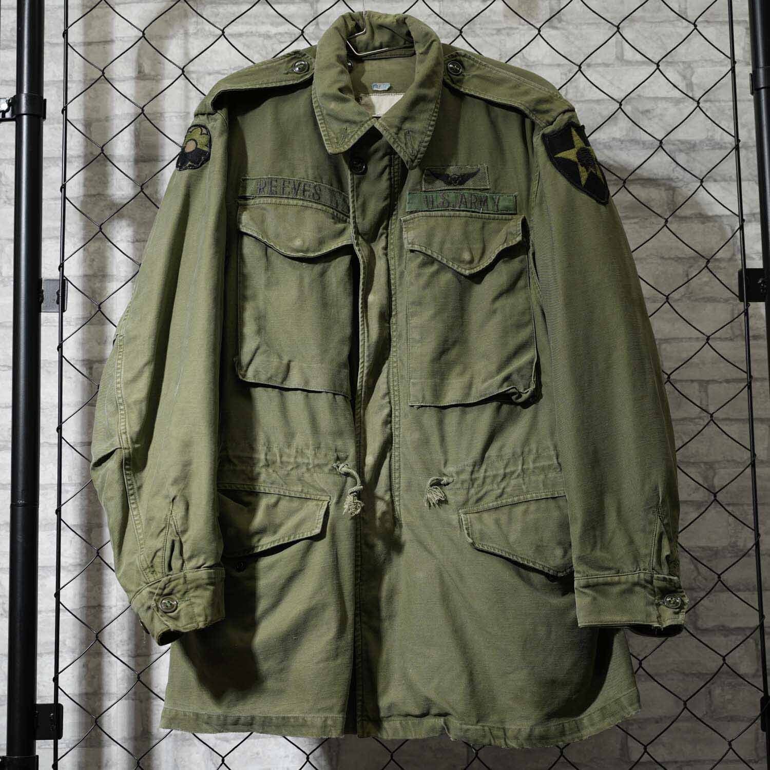 胸元にはU.S. ARMYテープと航空章、ネームテープ「REEVES」、肩には部隊パッチが残存。いずれも後年に縫い付けられた可能性はありますが、実際に兵士が着用していたことを物語るリアルな佇まいで、レプリカや未使用品では得られない説得力があります。