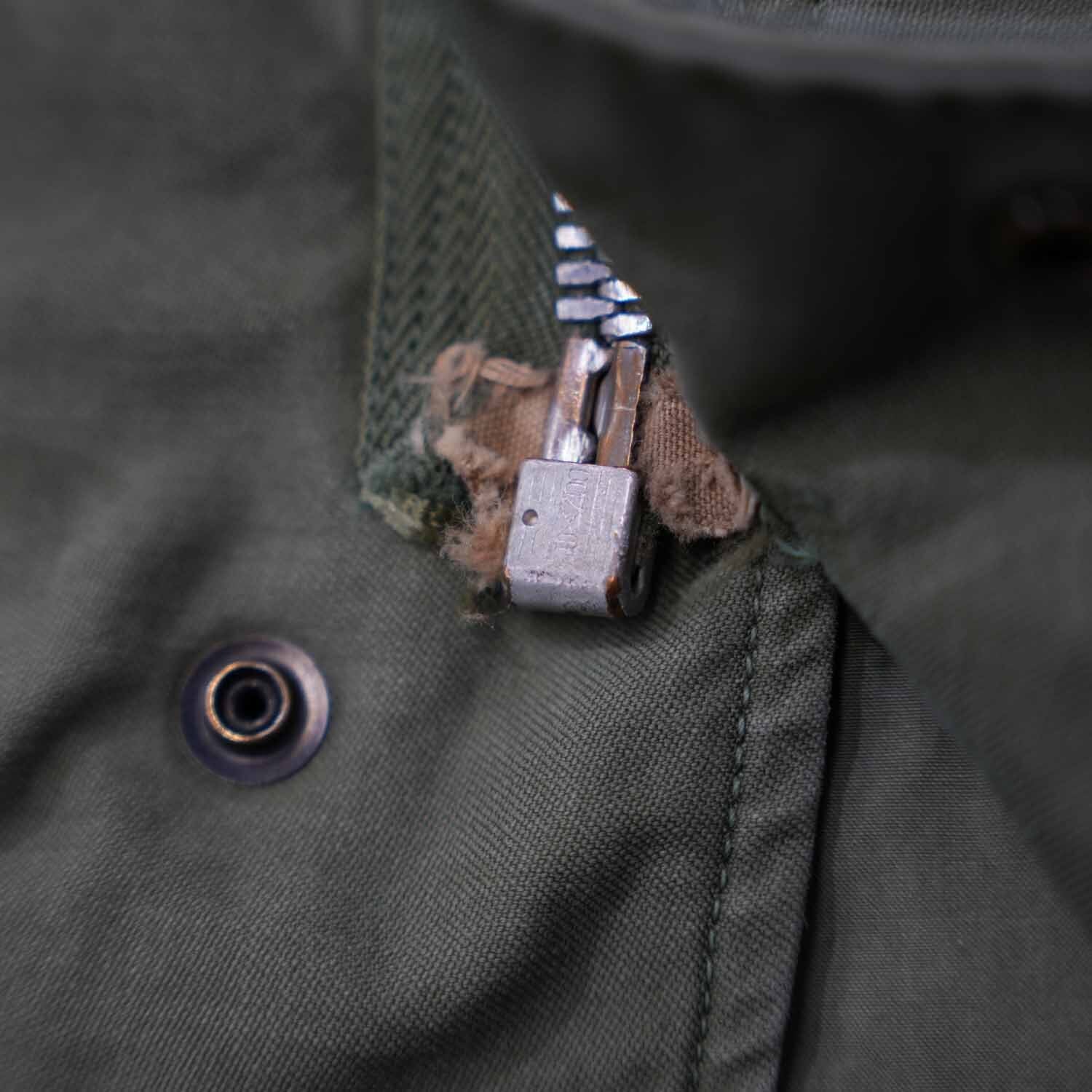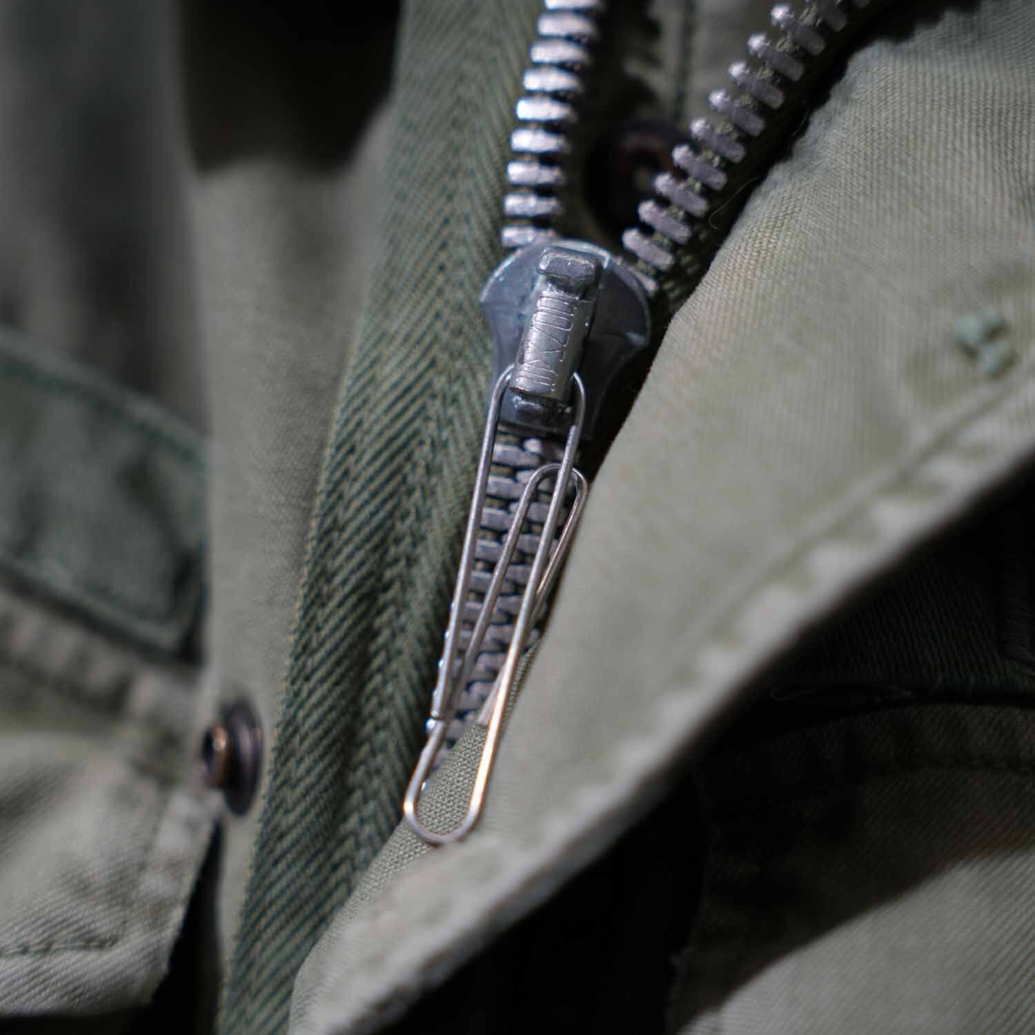 こちらの個体は、CONMAR(コンマー)ジッパーを採用した仕様。スライダー形状やワイヤープルから見ても古い年代のCONMARで、M-51の時代背景としっかり整合するディテールです。