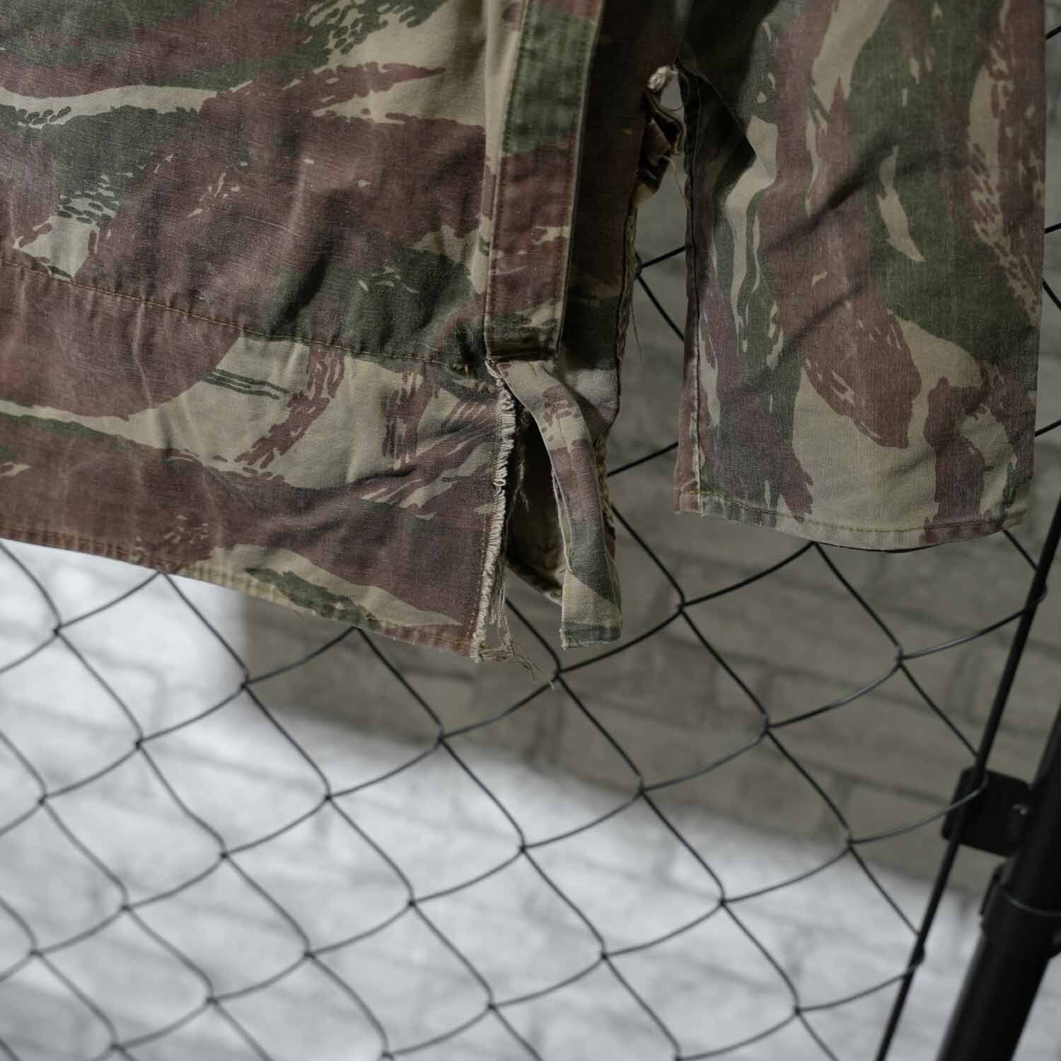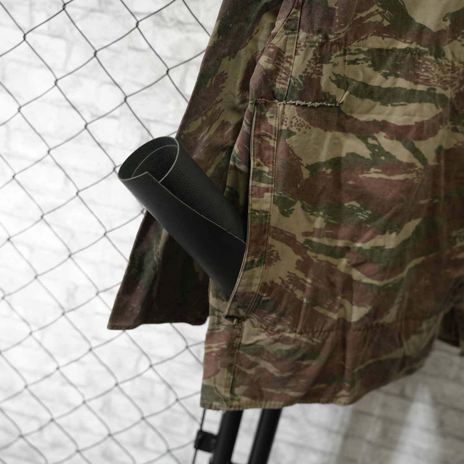 最大の特徴は、フランス軍のカモフラージュにも通じるフレンチカモ(リザード系を思わせる柄)。アメリカ軍の迷彩とは異なり、色数を抑えた有機的なパターンが、落ち着いた存在感を放ちます。