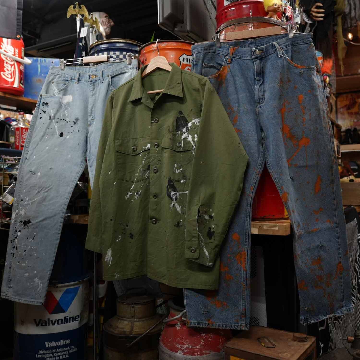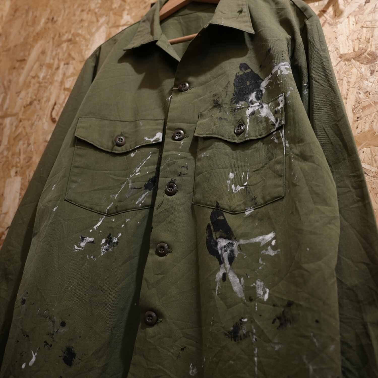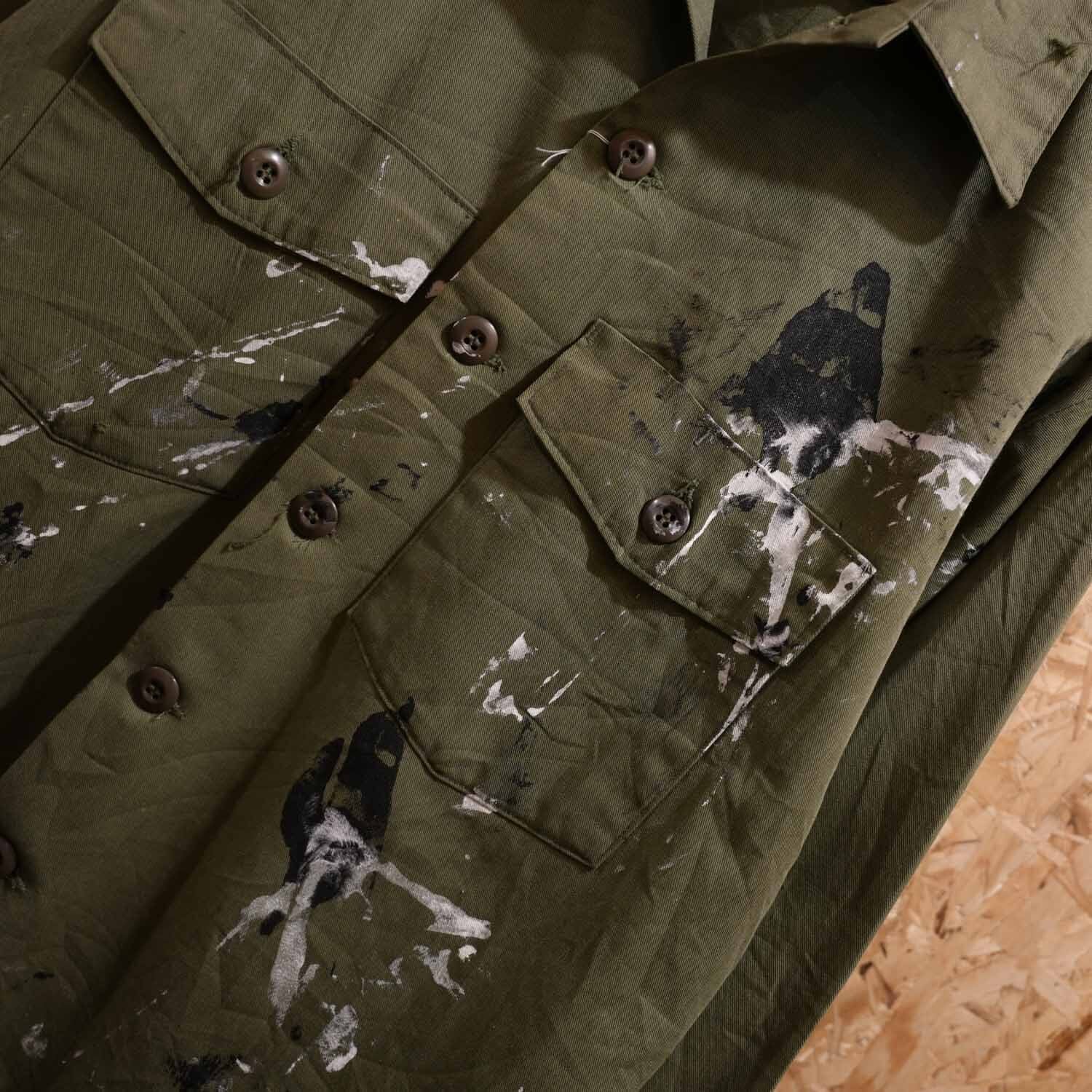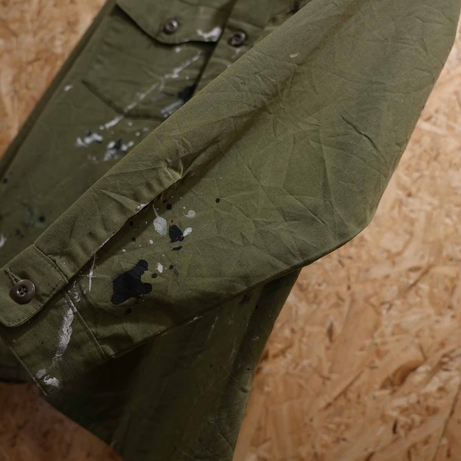 ペンキ飛び 雰囲気抜群 US ARMYモチーフ ユーティリティシャツ Lサイズ程度 アーミーグリーン 民間品 ミリタリーシャツ ワークシャツ メンズ 長袖 ユニセックス 古着【furugi-1364】