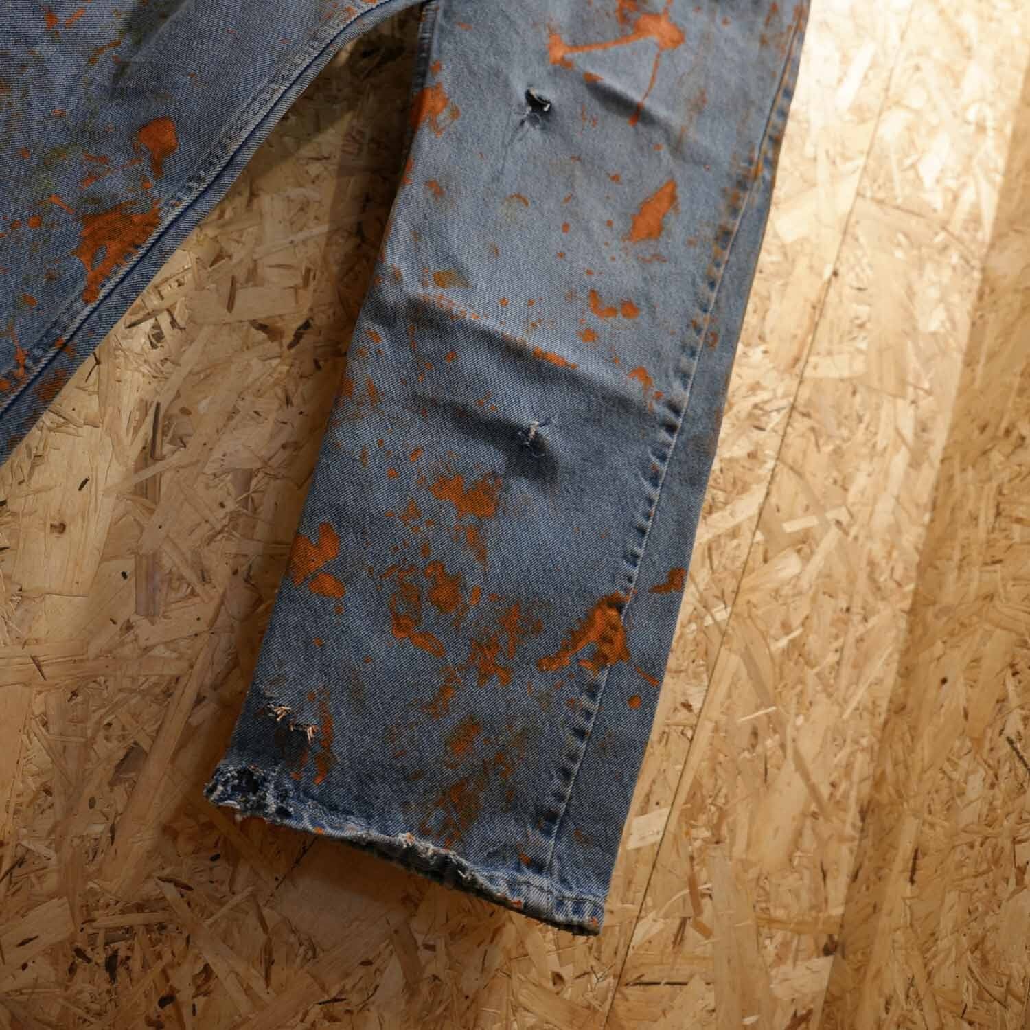 元々は「Washed Dark(濃紺)」であったボディが、歳月を経て非常に雰囲気のあるミドルブルーへとフェードしています。そこに鮮烈なオレンジのペンキを散らし、裾やポケットにはエッジの効いたクラッシュ加工を施した、唯一無二のカスタム個体。
