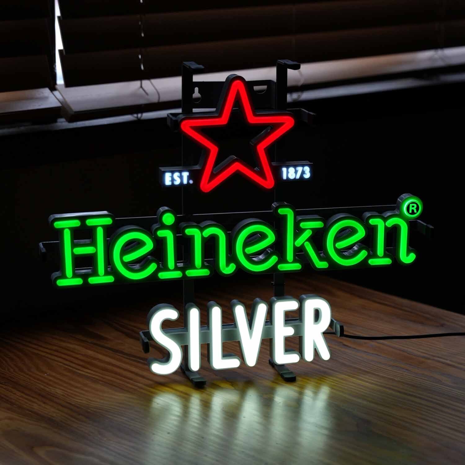 世界的ビールブランド「Heineken」の中でも、比較的新しいラインとして登場したHeineken SILVERのネオンサイン。比較的使いやすいコンパクトなサイズ感です(縦36cm × 横45cm