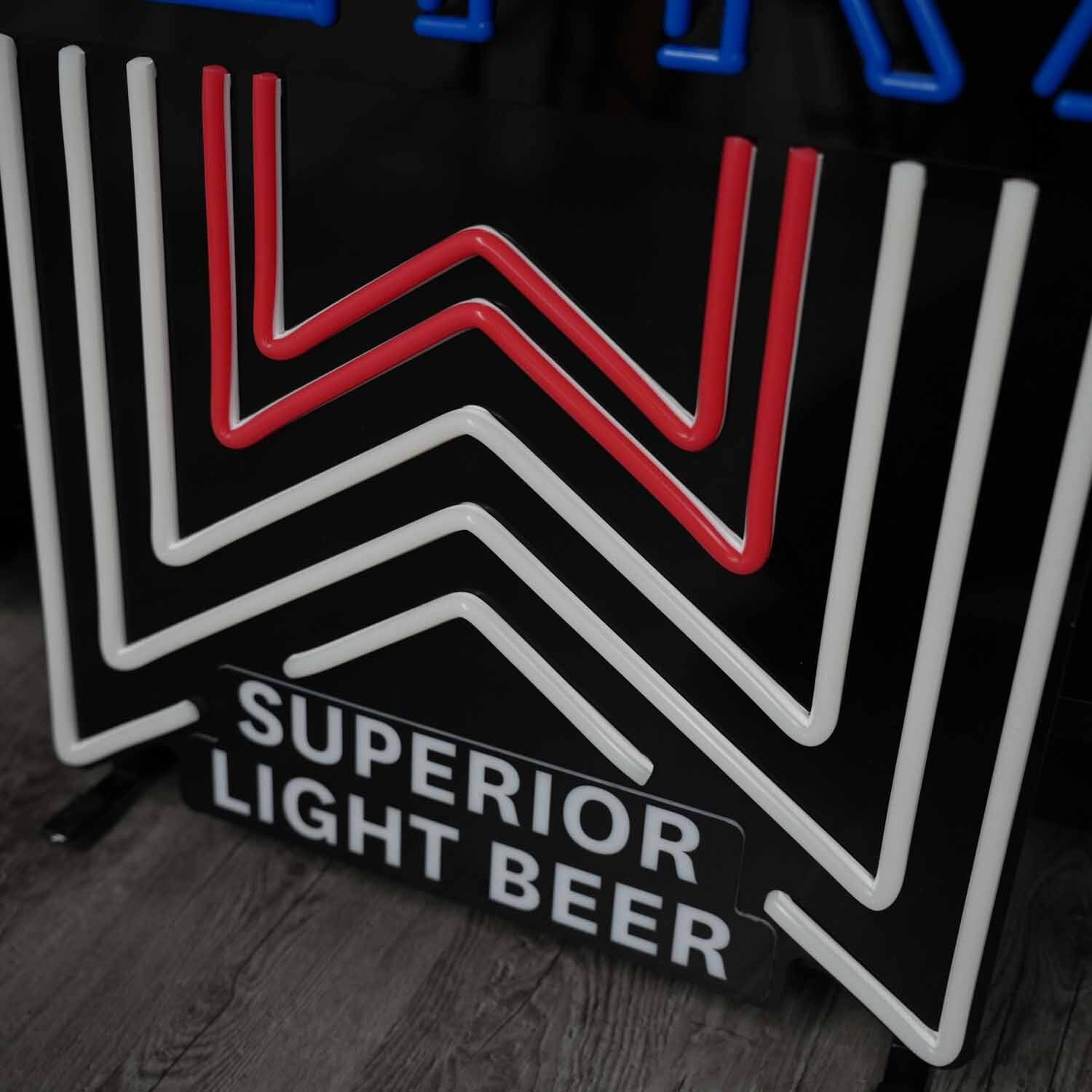 下部には「SUPERIOR LIGHT BEER」の表記を備え、現行ブランドでありながらも、90年代以降のUSバーサインを思わせるクラシックな雰囲気を漂わせます。縦型レイアウトならではの存在感は、壁面に掛けた際に特に映えるデザインです。