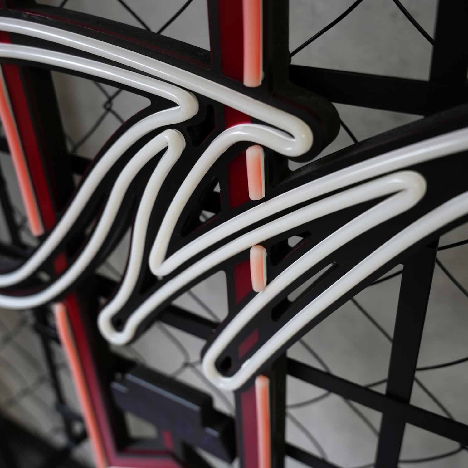 背面のレッドフレームが全体を引き締め、点灯時には壁面に奥行きのある光のレイヤーを生み出します。シンプルながら、しっかり“ネオン感”を楽しめるバランスの取れたデザインです。