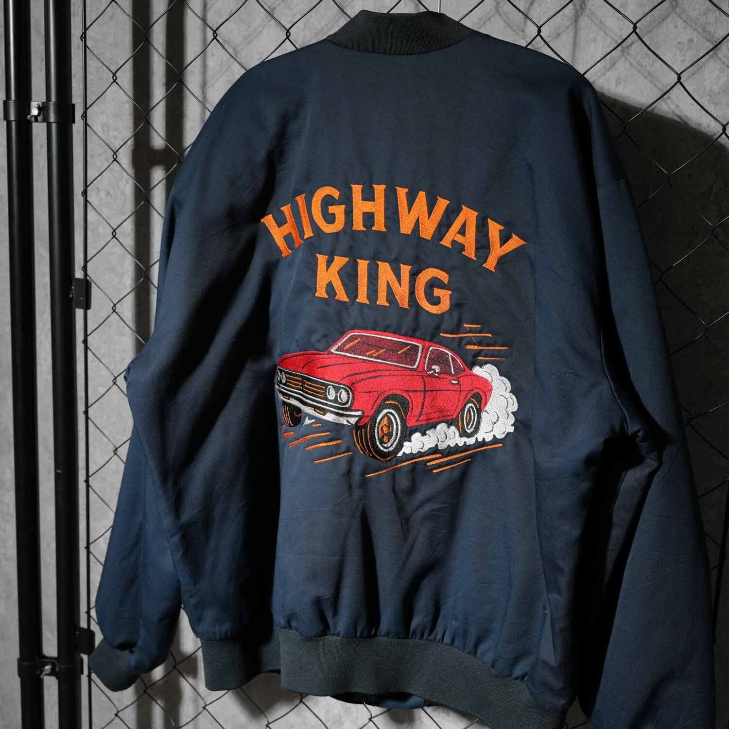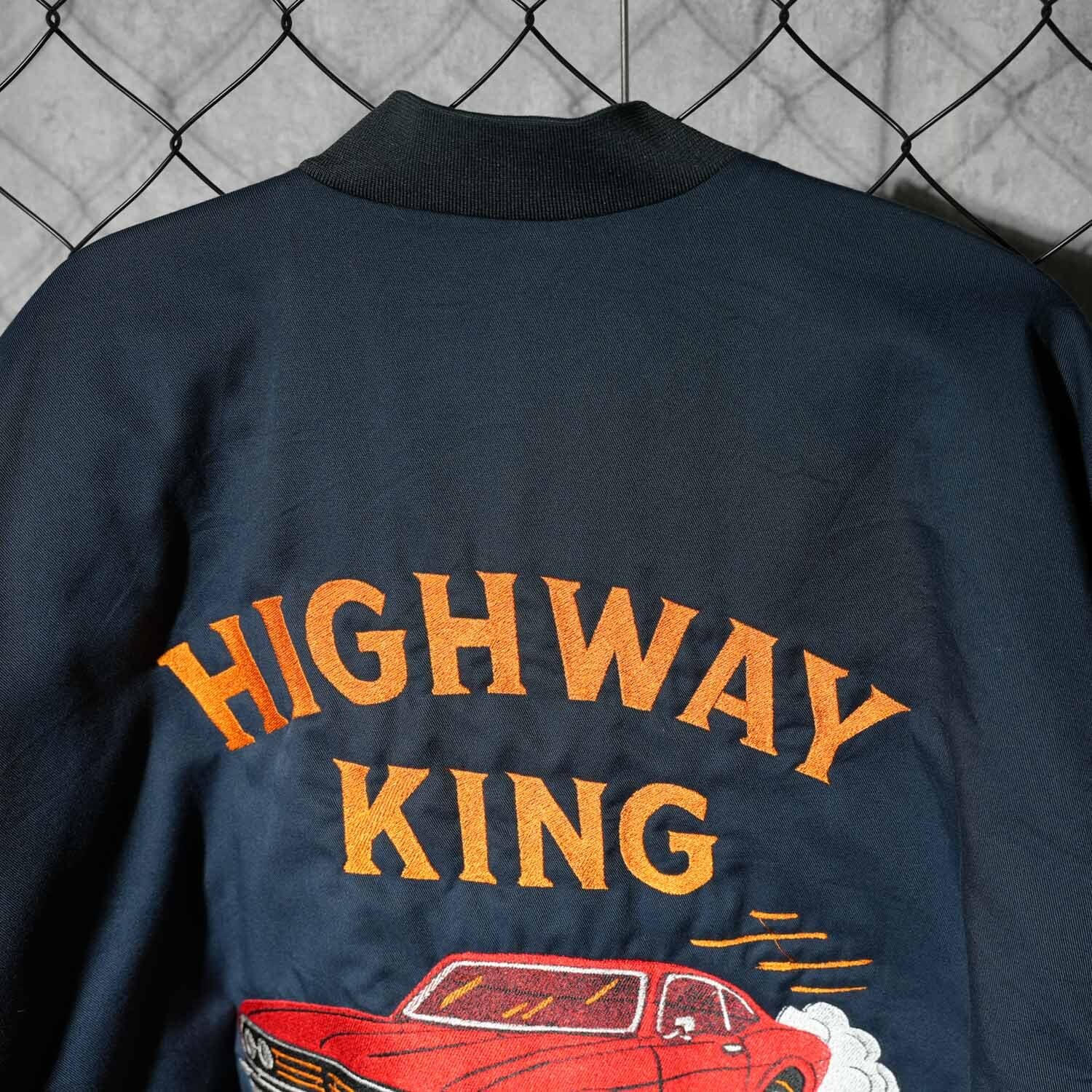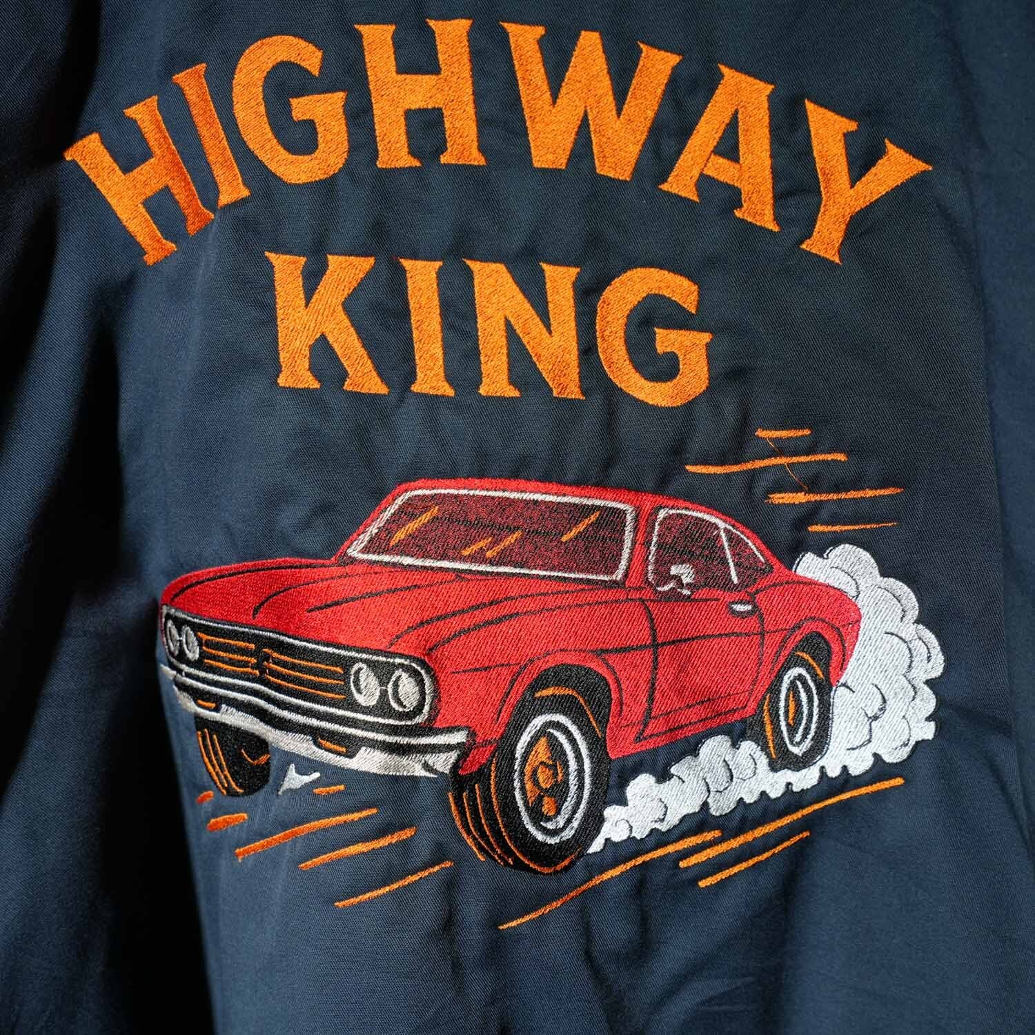 背面いっぱいに施された「HIGHWAY KING」とマッスルカーのビッグモチーフ刺繍が圧倒的な存在感を放ち、アメカジファン垂涎の一着です。