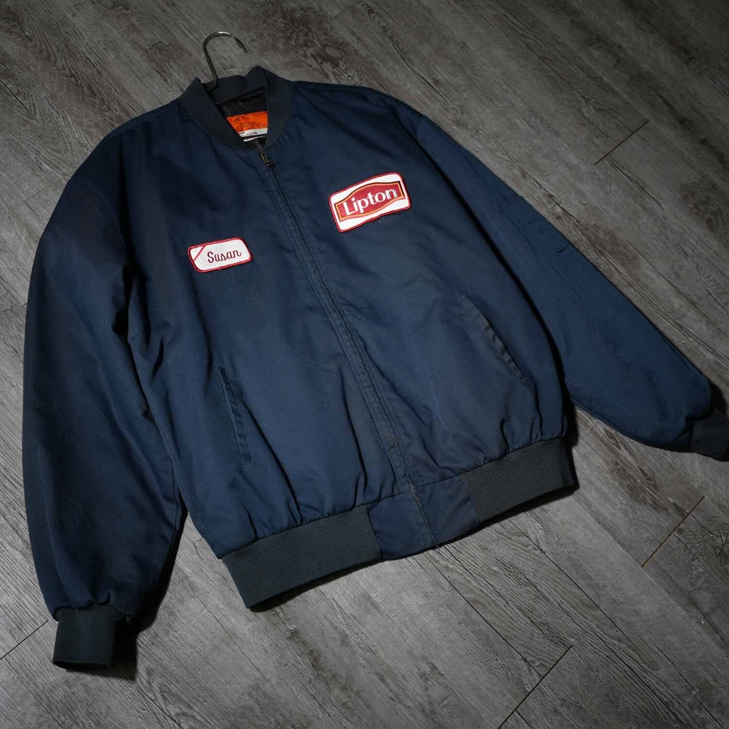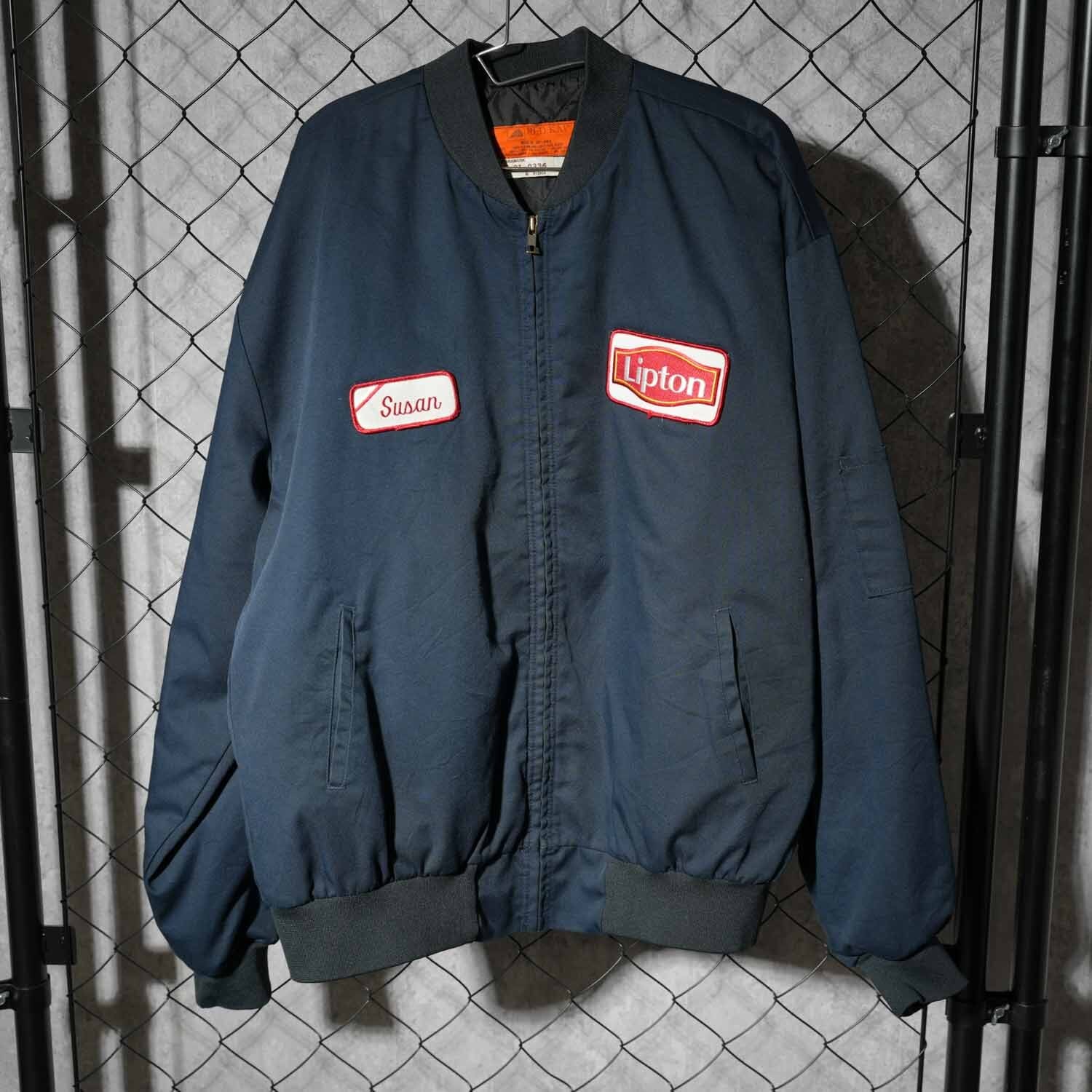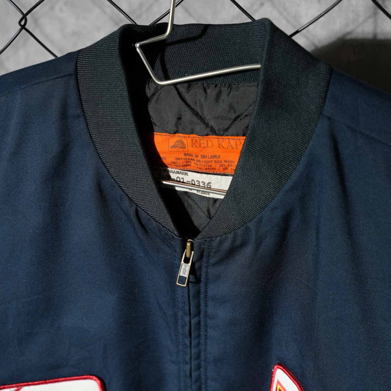 RED CAP レッドキャップ 刺繍 ワークジャケット ネイビー XLサイズ キルティングライナー HIGHWAY KING 車 アメ車 モーターサイクル Lipton ワッペン MA-1型 ヴィンテージ コットンポリエステル 企業ロゴ アメカジ 刺繍ブルゾン スーベニアジャケット スカジャン風 古着【furugi-1918】