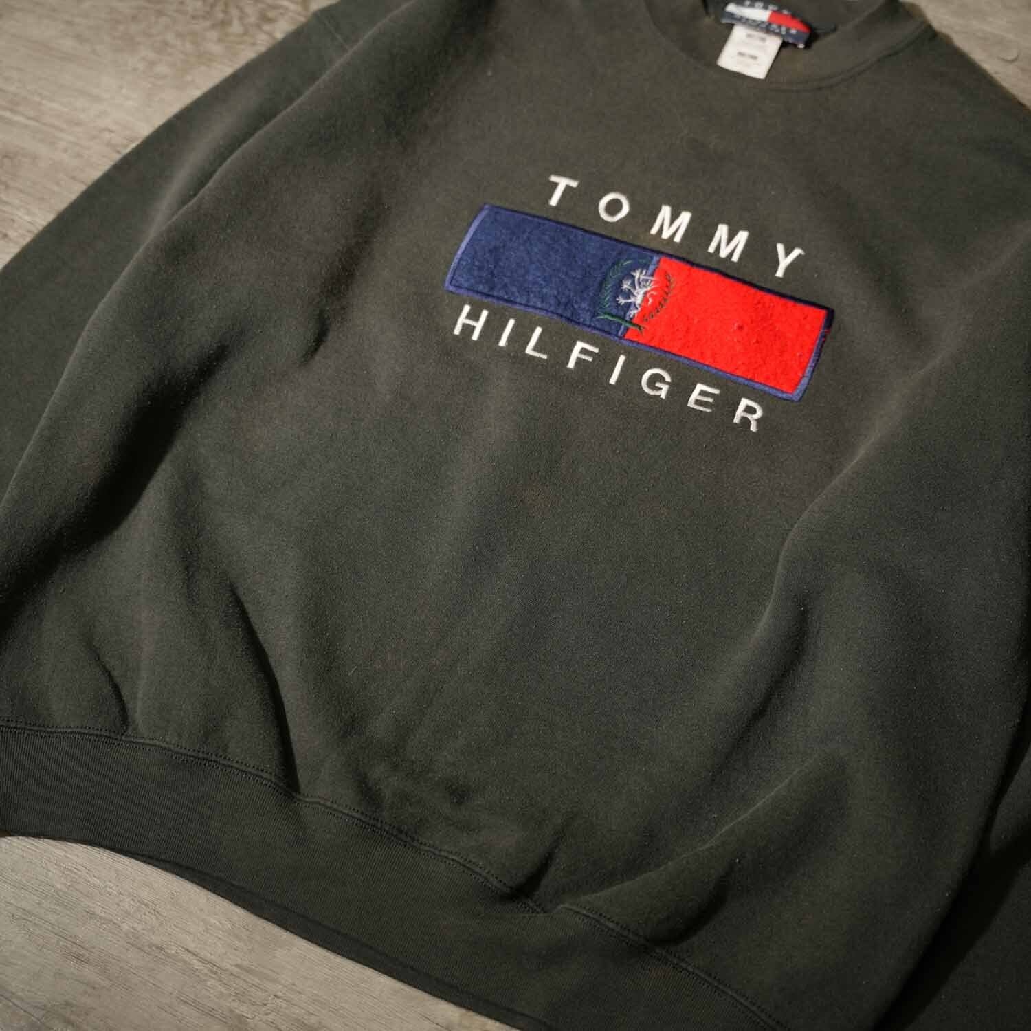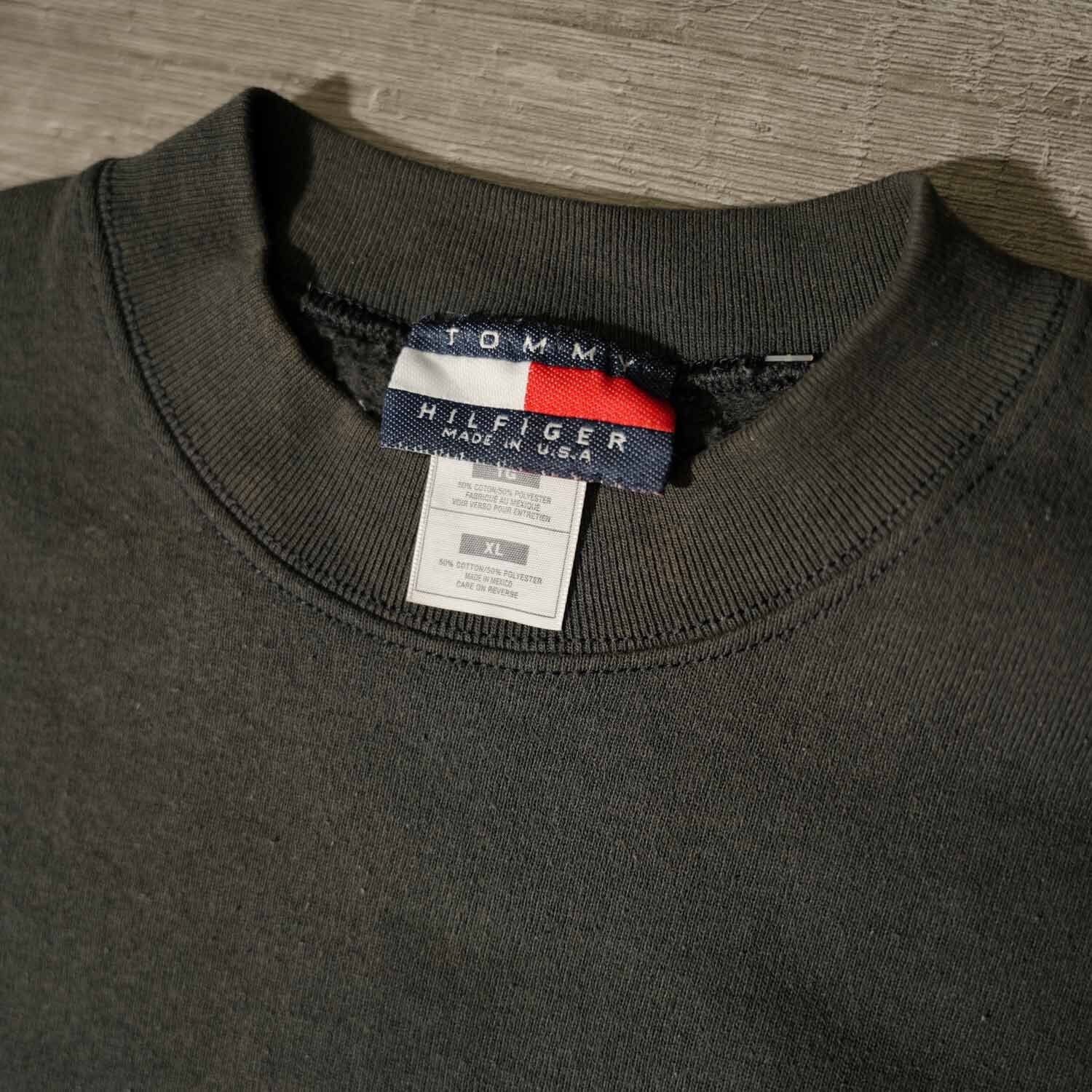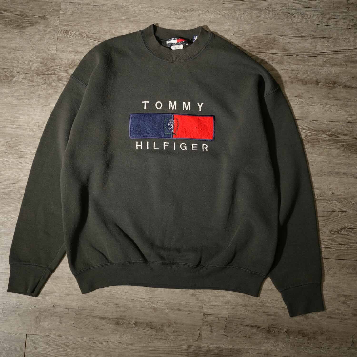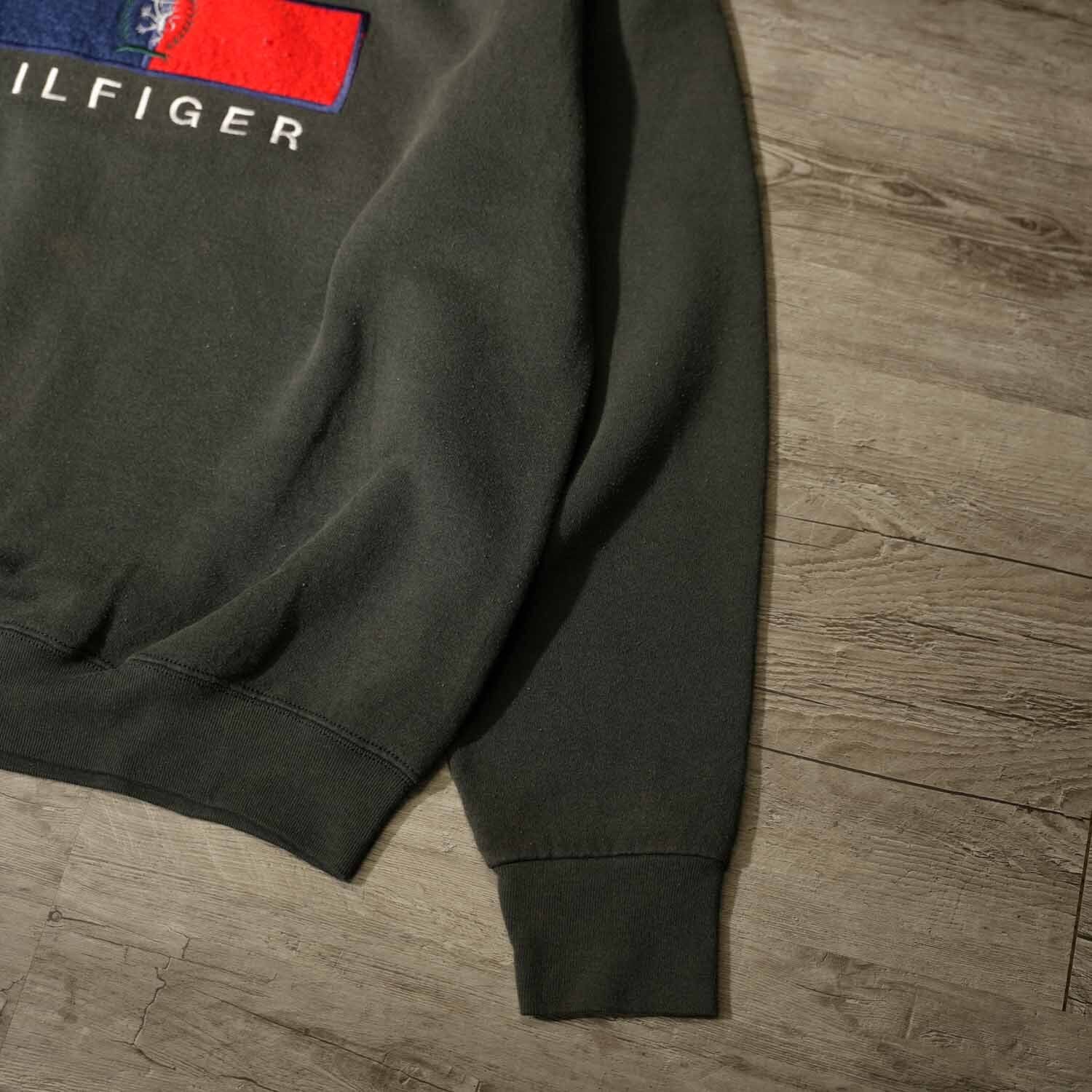 古着 90s Vintage TOMMY HILFIGER フラッグロゴ 刺繍 スウェット ボックスシルエット XL ダークグレー メキシコ製 トミーヒルフィガー ヴィンテージ【furugi-1961】