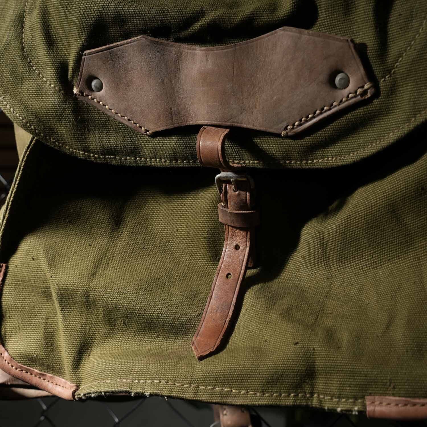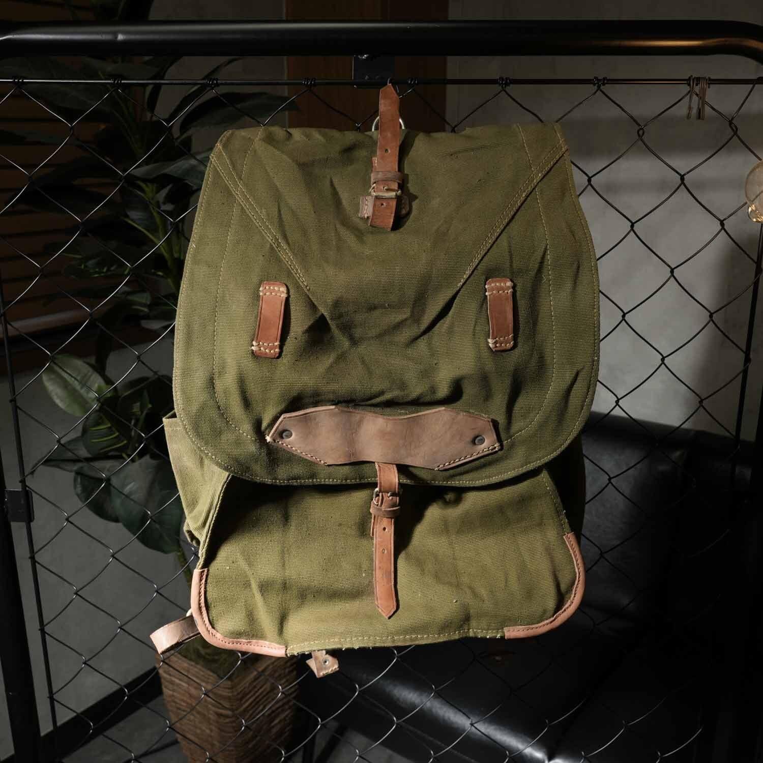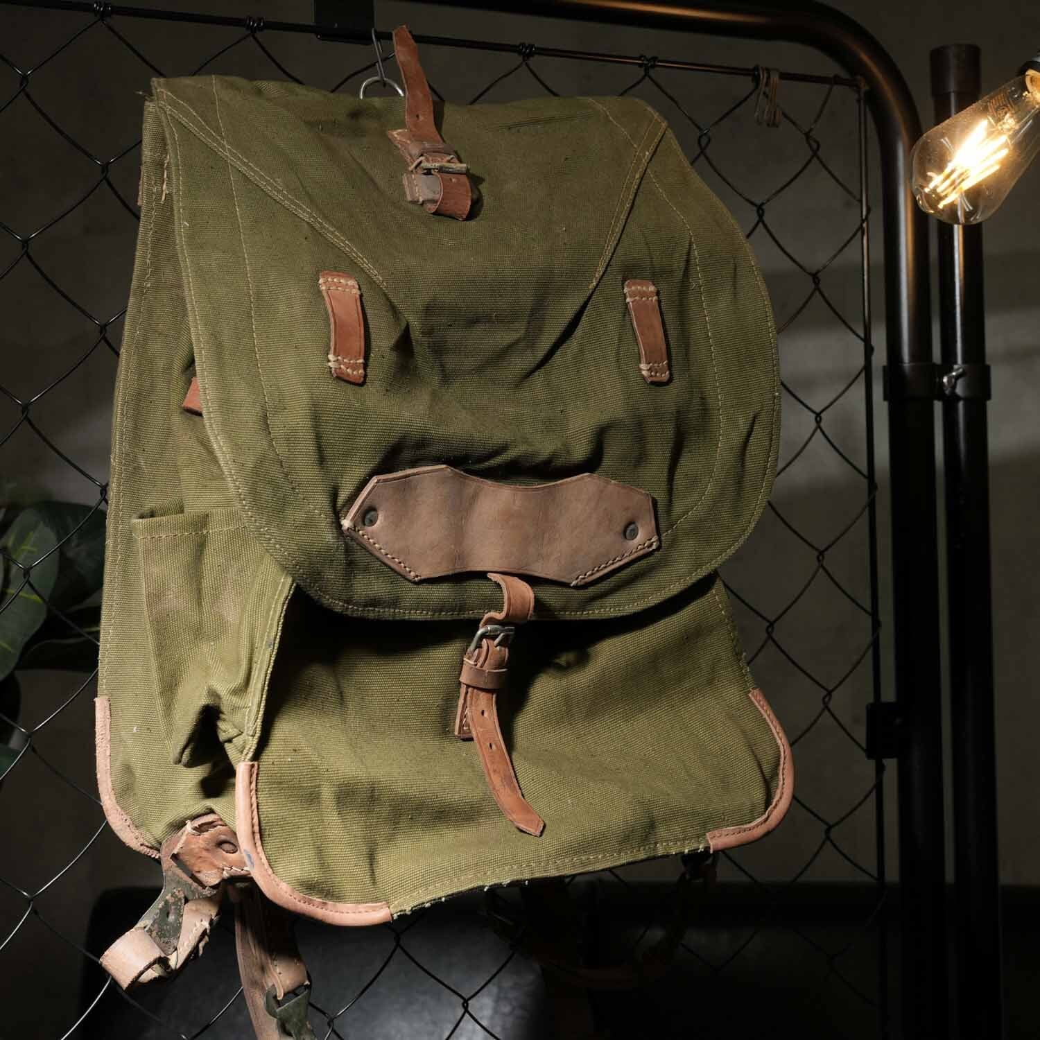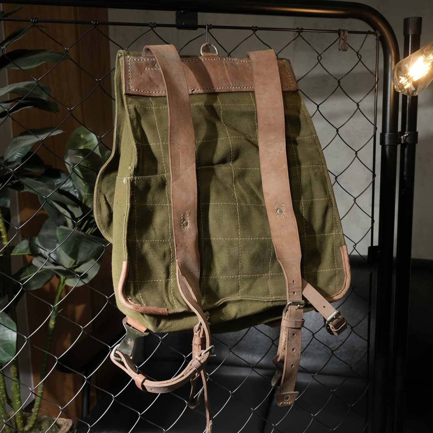 1970年代にルーマニア軍 ミリタリーリュックサックが入荷しました。オリーブドラブの厚手キャンバスとナチュラルレザーを組み合わせた質実剛健な作りは、現行品では味わえない無骨な魅力。