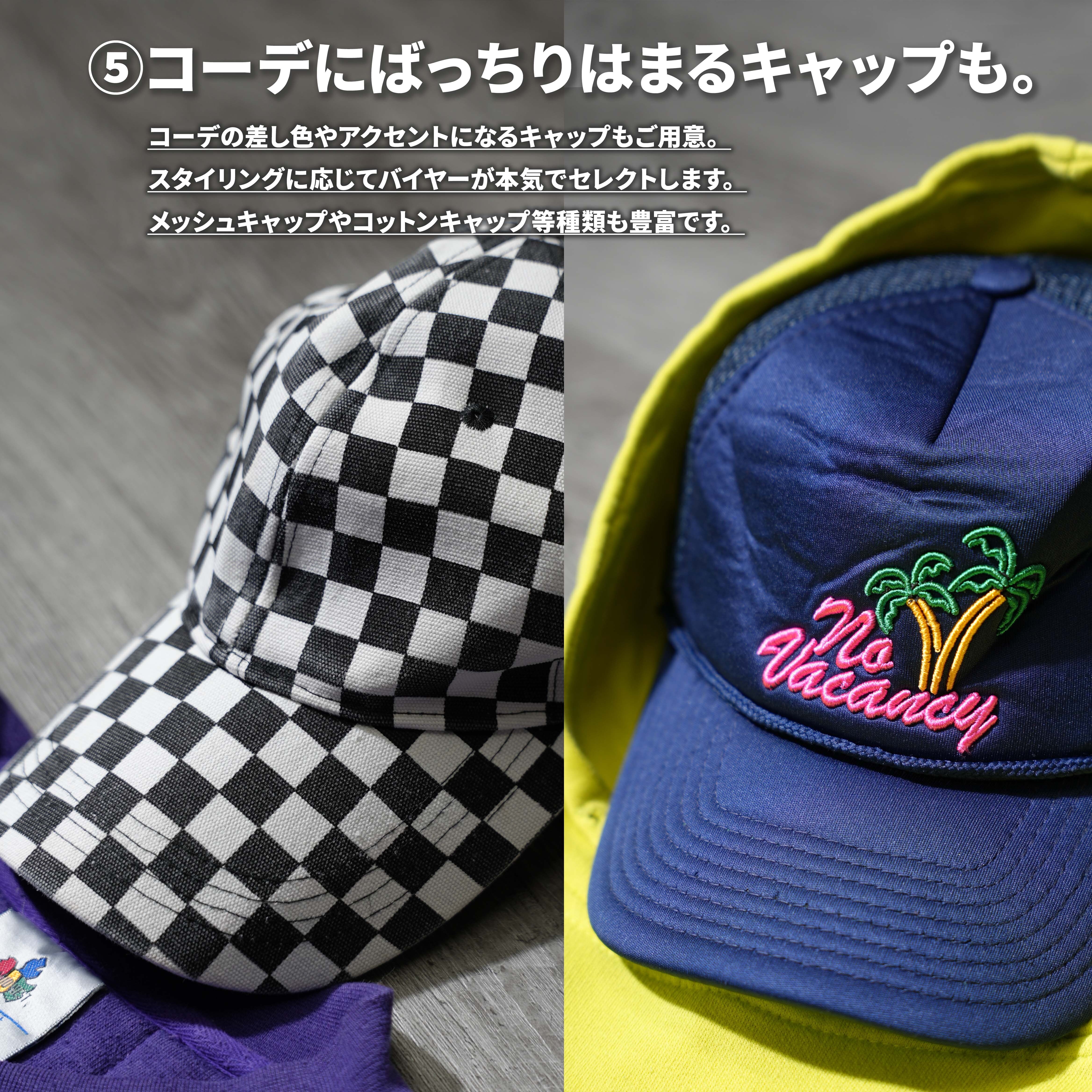 ⑤キャップ: コーデを完成させるヘッドウェア