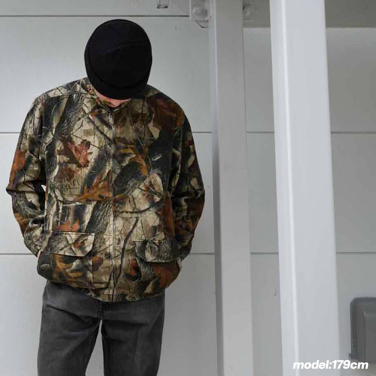 問うアイテムはハンティングウェアに定評のある"WELLS CREEK OUTFITTERS"による一着。公式の"REALTREE Hardwoods"パターンを採用した、モダンな表情を持つドリズラータイプのジャケットです。
