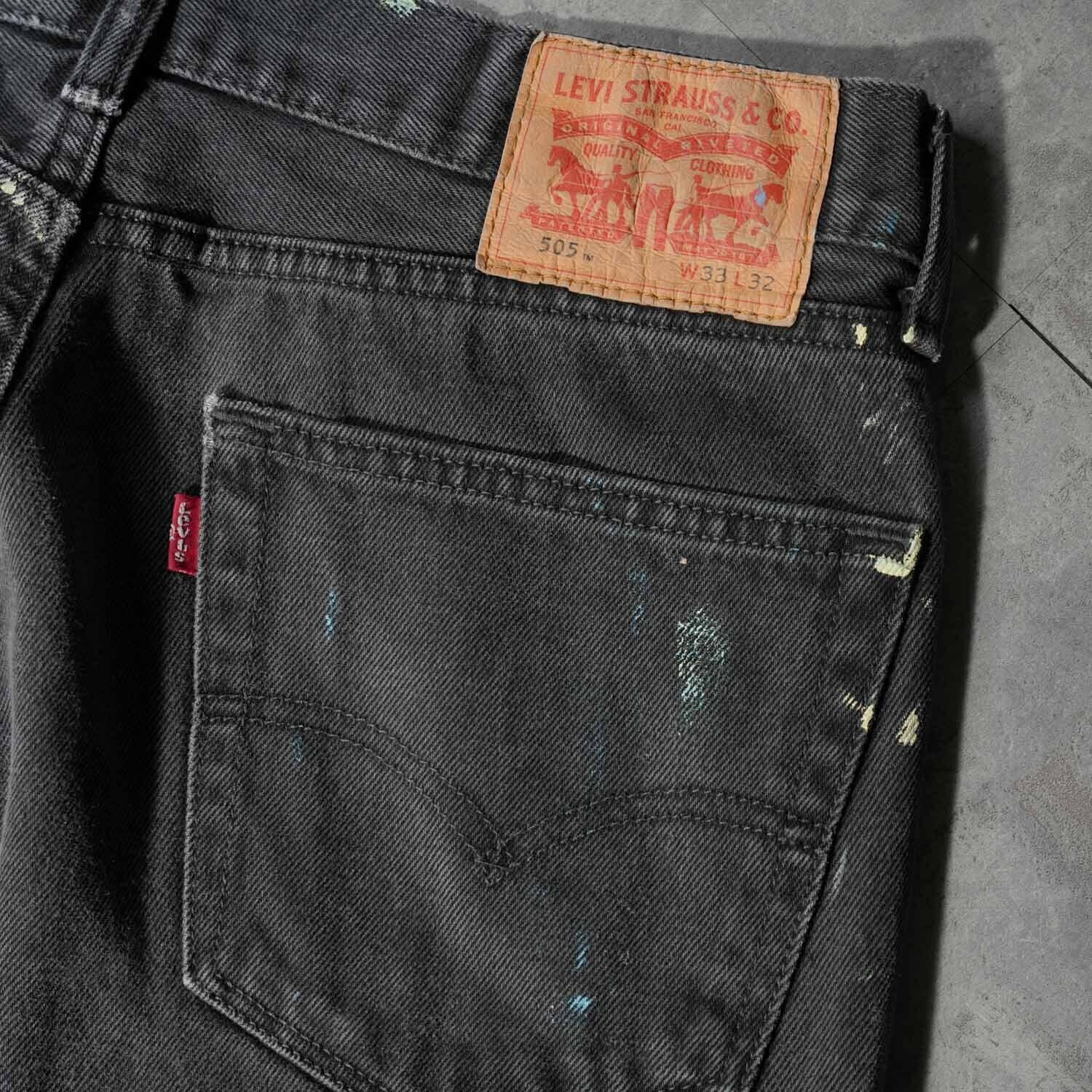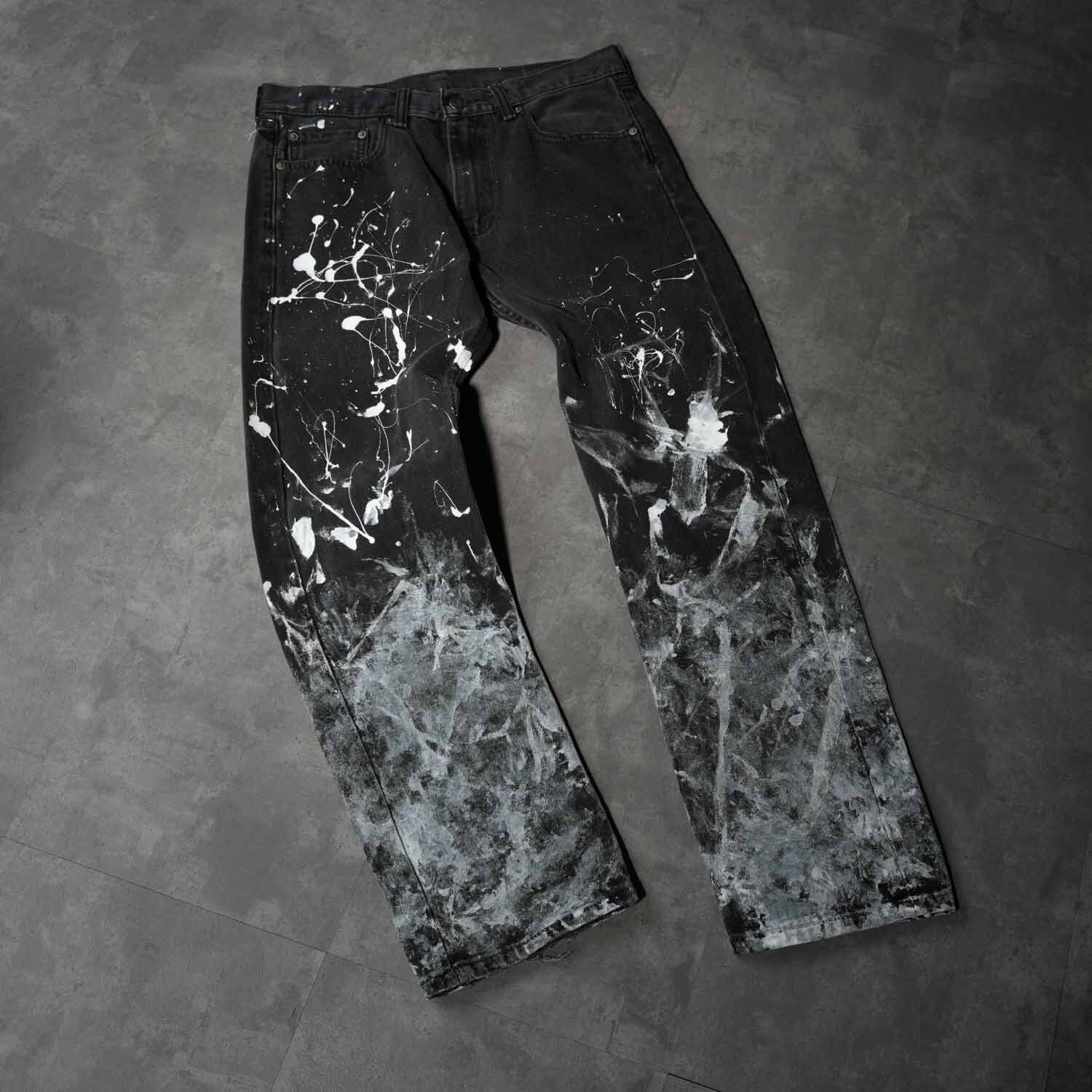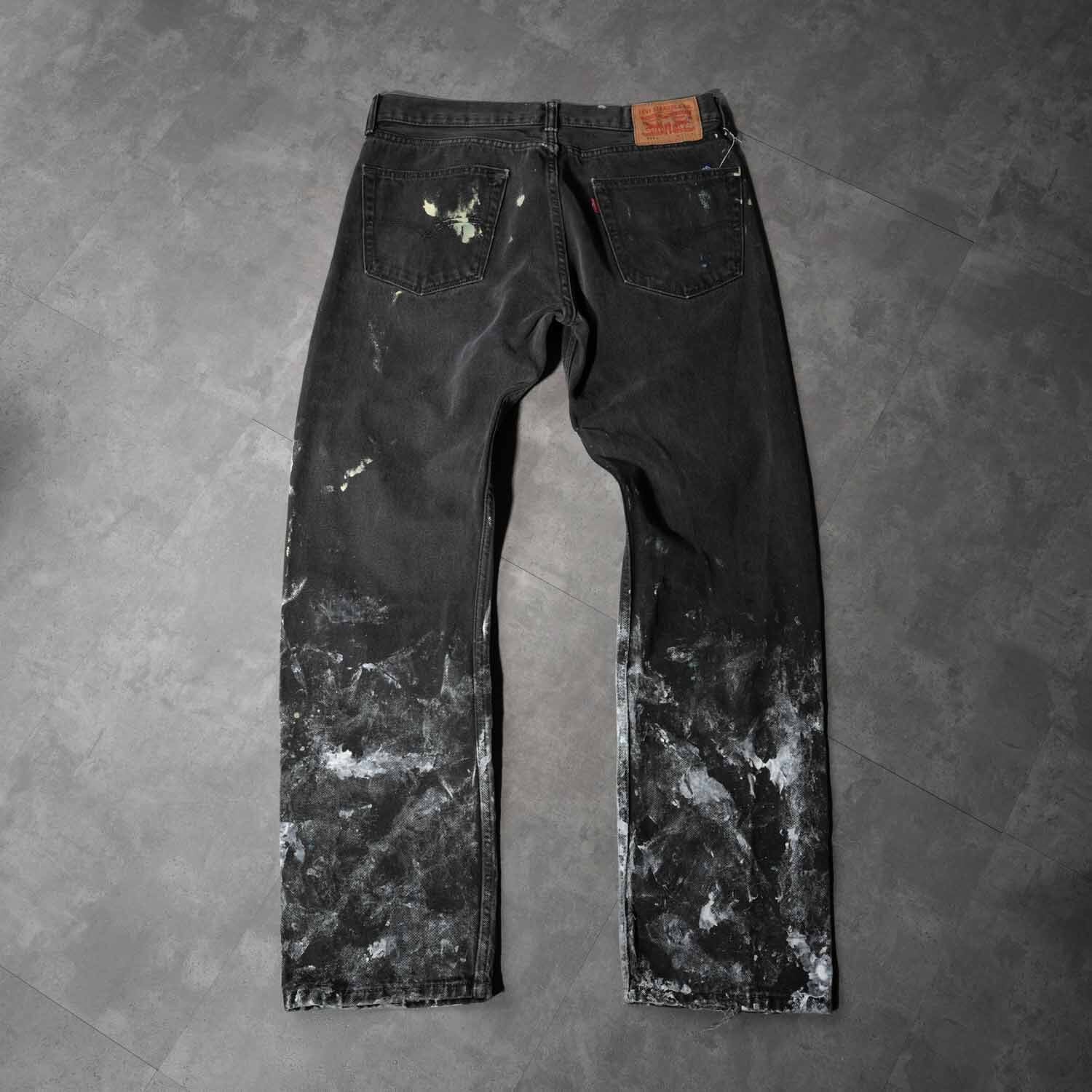 Levi's 505 W33×L32 Fade Black Denim Pants "Art Splatter Paint" リーバイス 505 ブラックデニム ペイントカスタム 墨黒 フェード ワーク モード アメカジ ストリート ボロ アート クラッシュ 音楽 パンク グランジ 古着【furugi-1998】