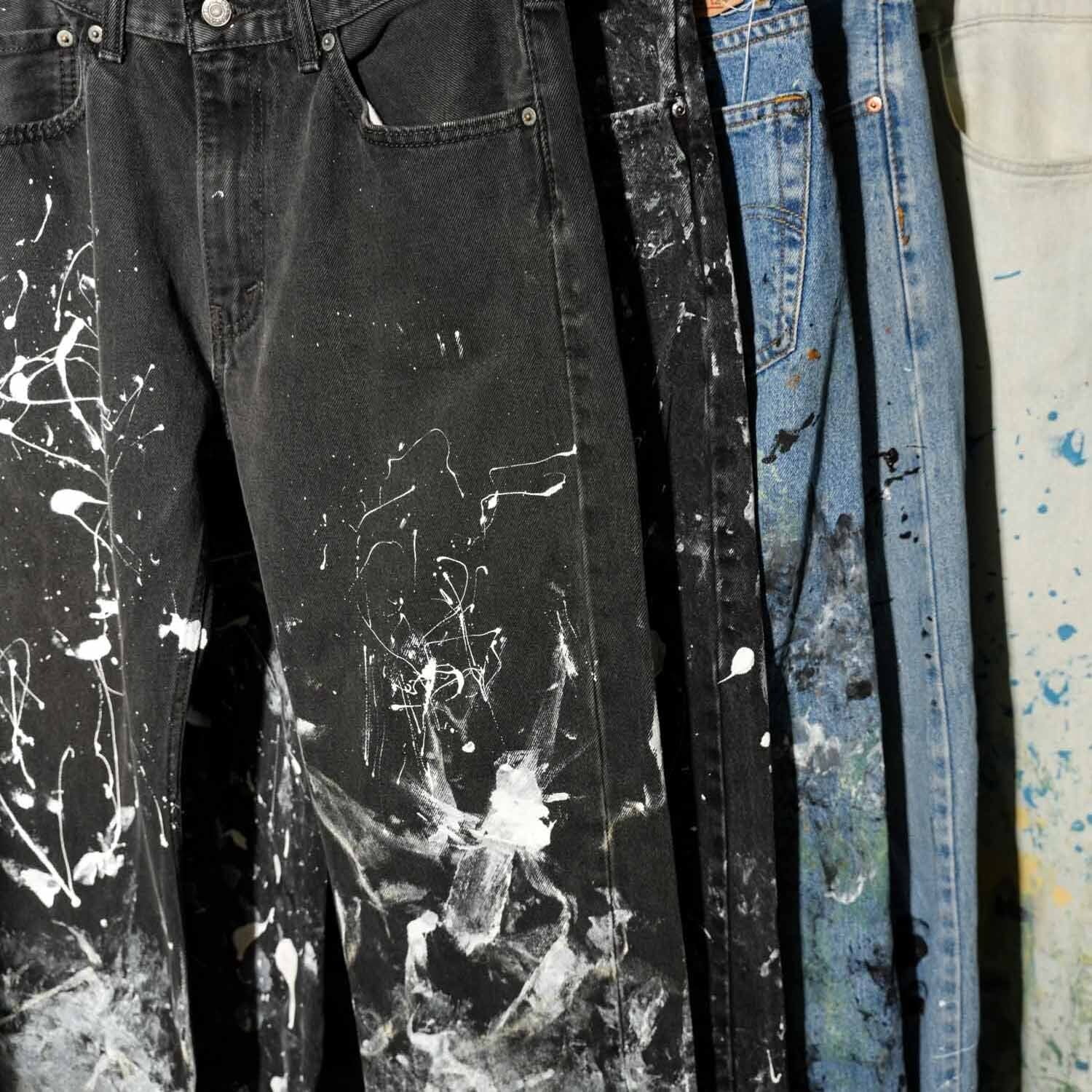 ボリュームのあるワークブーツで無骨に合わせるのはもちろん、綺麗なストレートシルエットを活かしてヒールブーツやレザーシューズでモードに振るのも。穿き潰すことで、ペイントがさらに剥がれ落ち、自分だけの完成形へと育てる楽しみを提案。