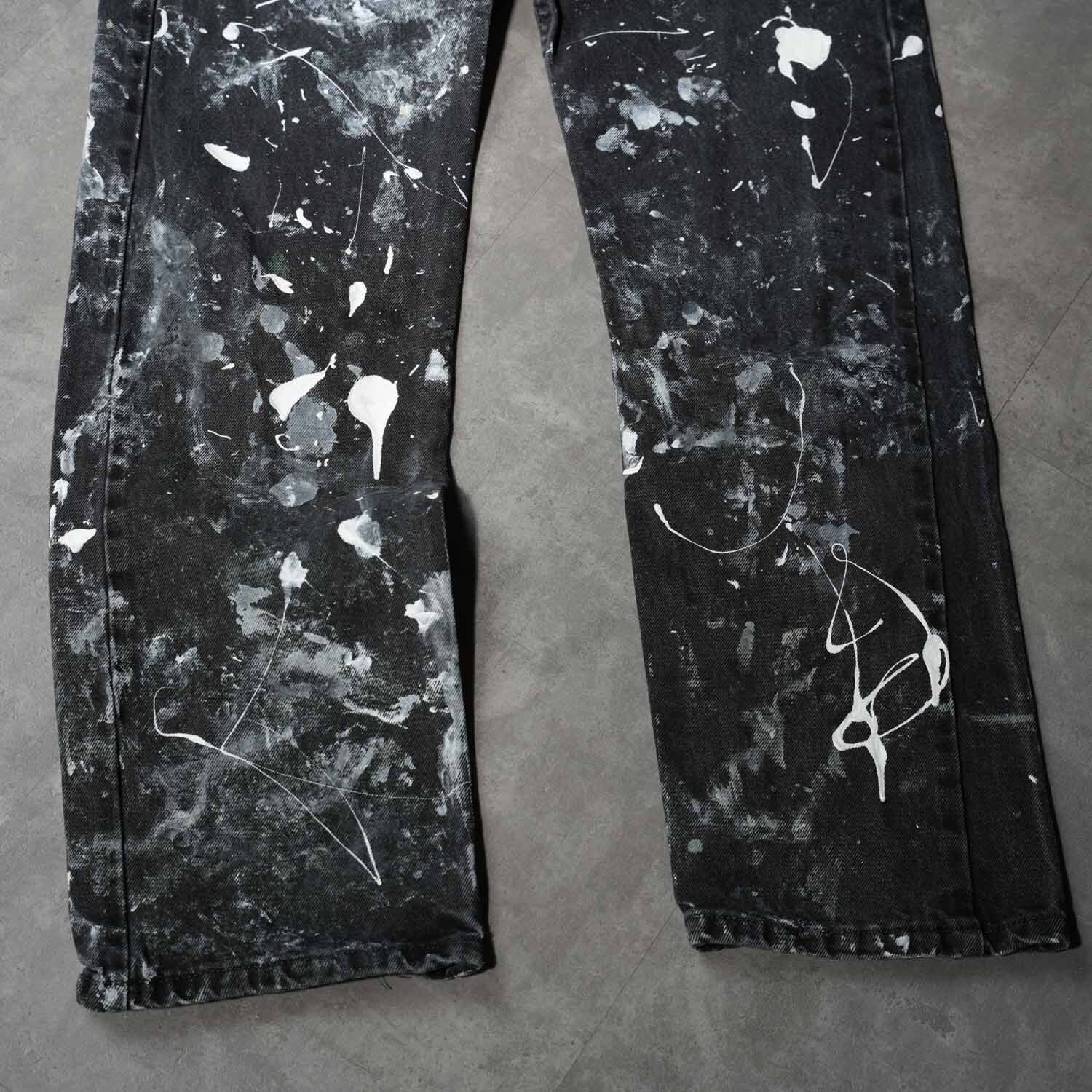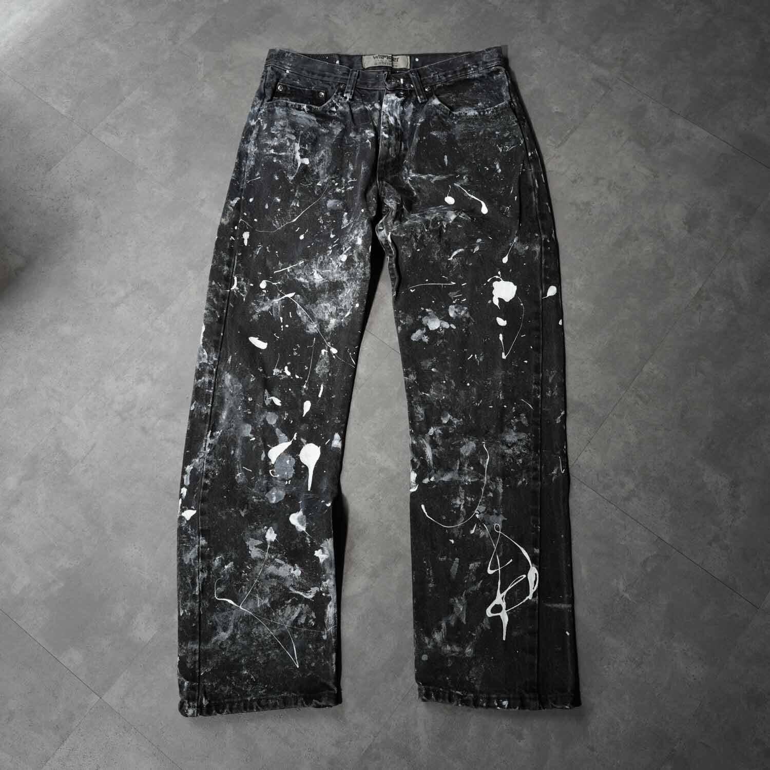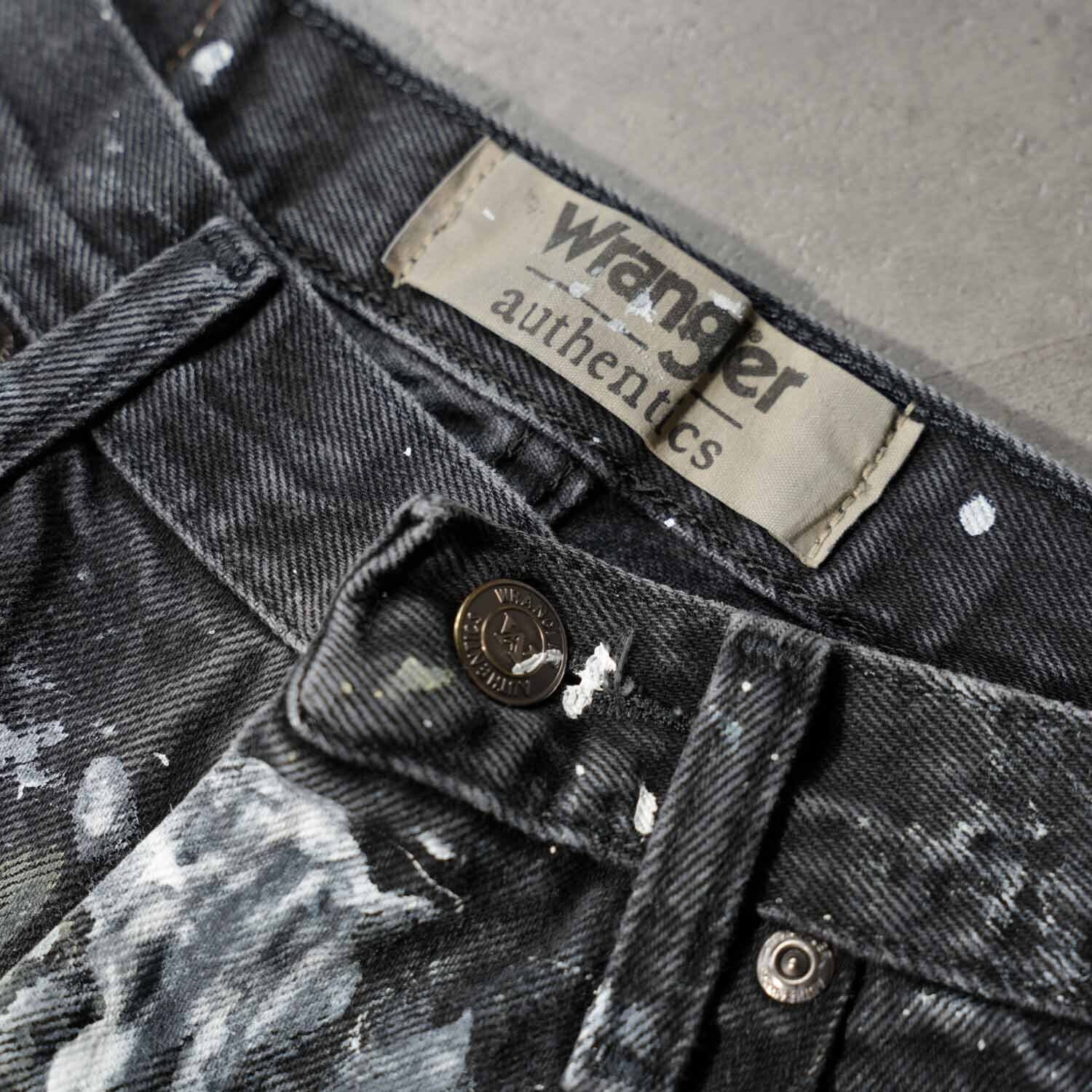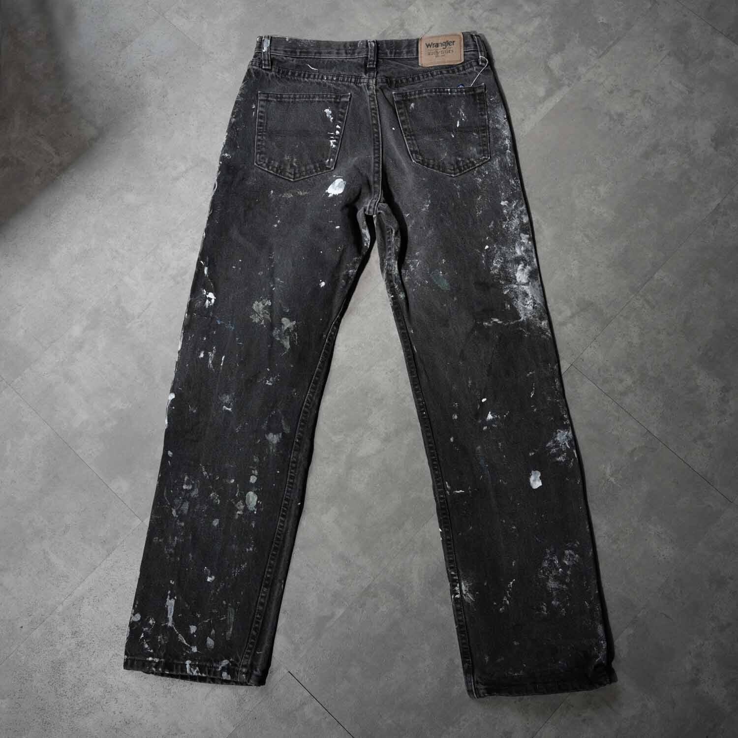 Wrangler w32×30 Black Denim Pants "Splatter Paint Custom" ラングラー ブラックデニム デニムパンツ ペイントカスタム 墨黒 14oz ヘビーウェイト ワーク ボロ アート クラッシュ 音楽 パンク グランジ 古着【furugi-2089】