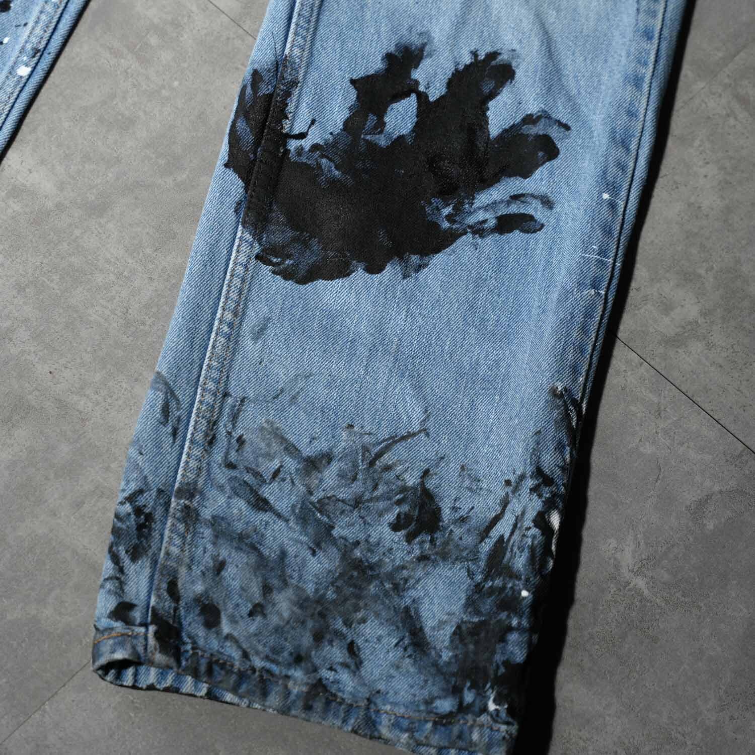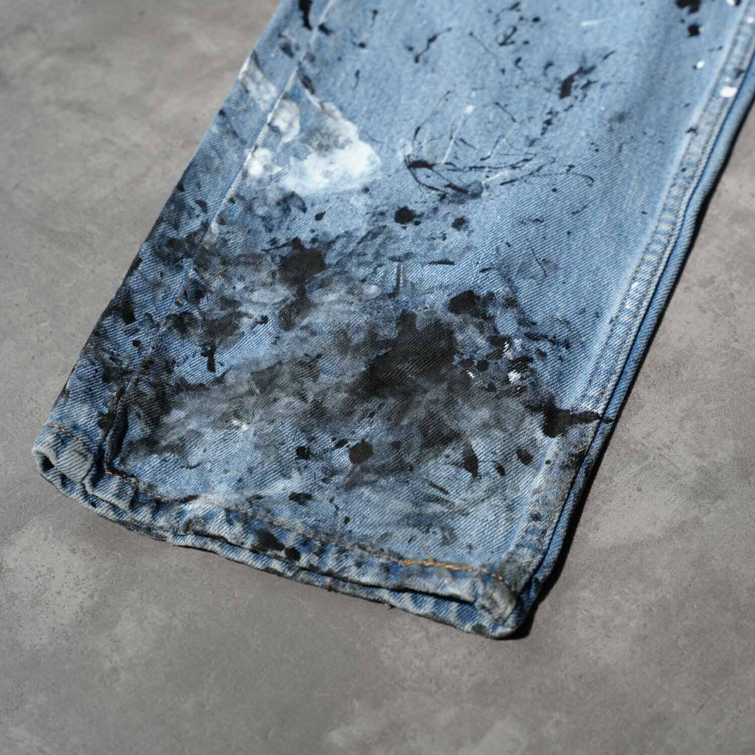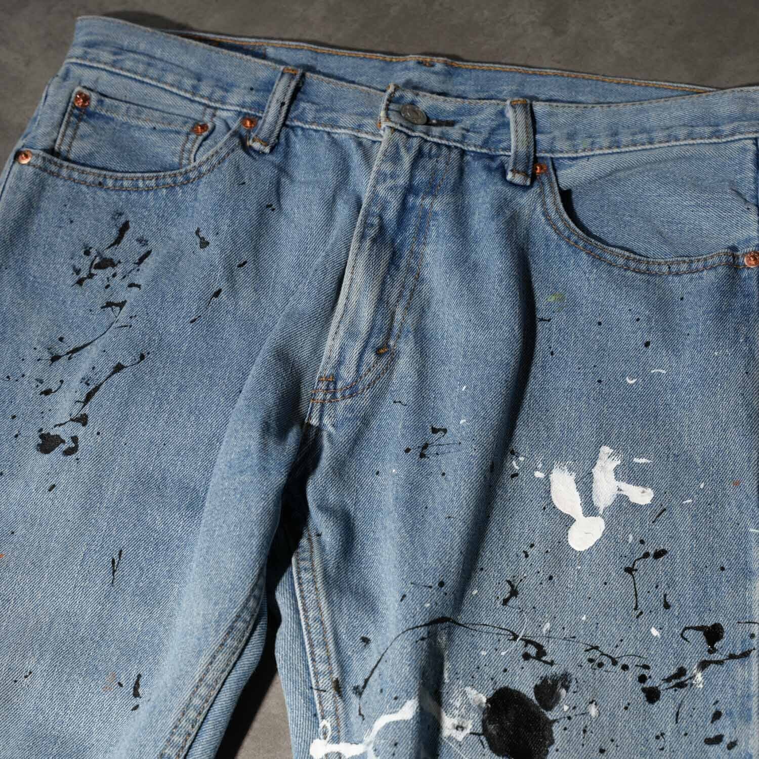 Levi's 505 W33×L30 Indigo Denim Pants "Monotone Splatter Paint" リーバイス 505 インディゴデニム ペイントカスタム ワーク モード ストリート ボロ ペンキ飛び アート クラッシュ 音楽 パンク グランジ 古着【furugi-2179】