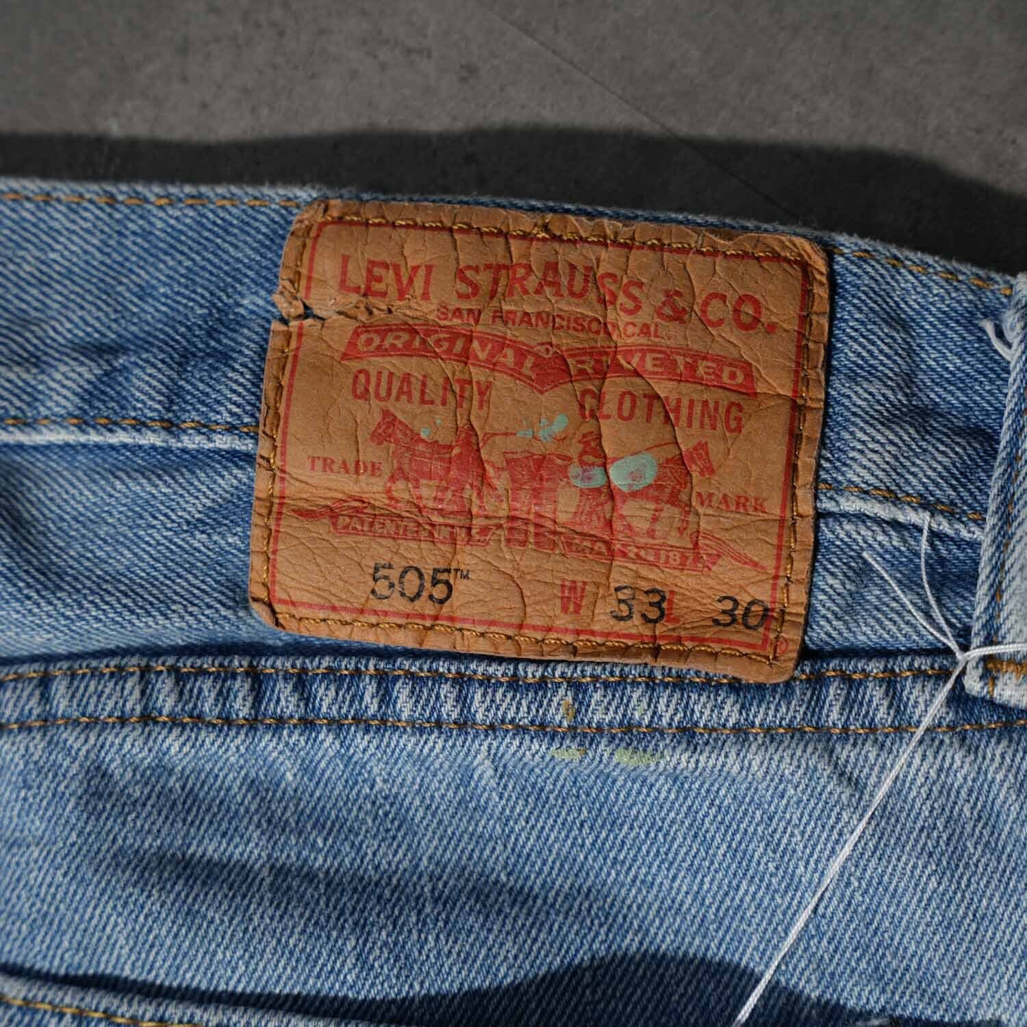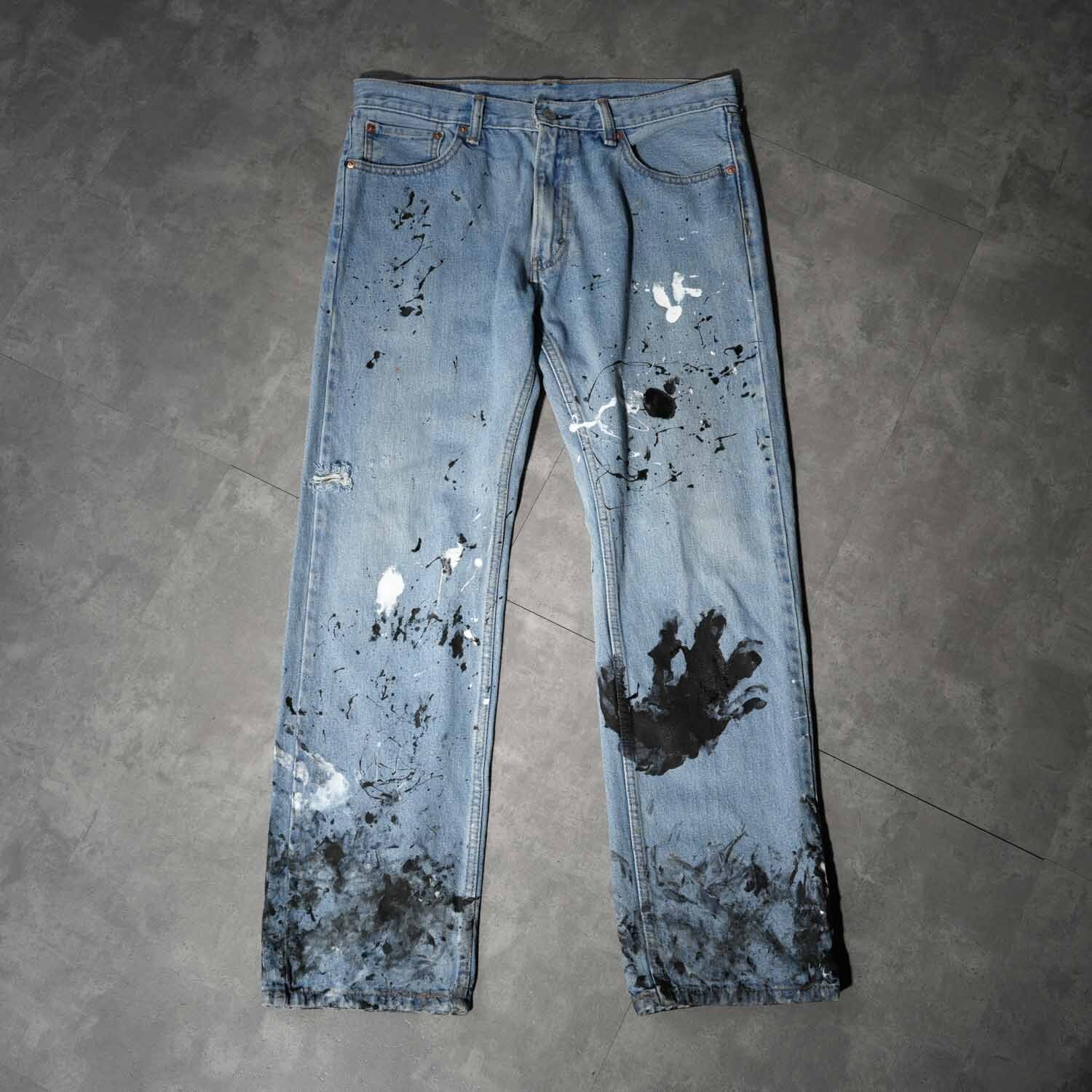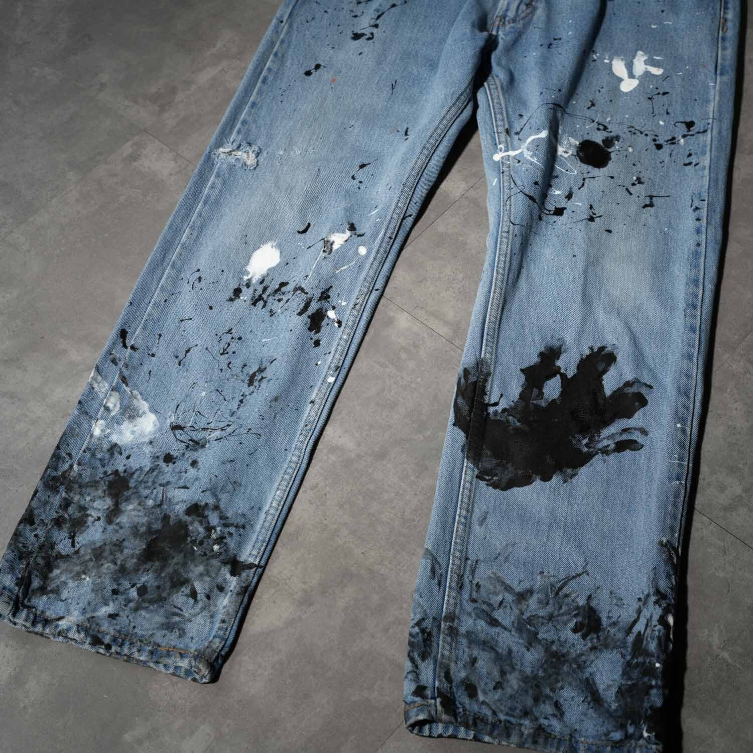 Levi's 505 W33×L30 Indigo Denim Pants "Monotone Splatter Paint" リーバイス 505 インディゴデニム ペイントカスタム ワーク モード ストリート ボロ ペンキ飛び アート クラッシュ 音楽 パンク グランジ 古着【furugi-2179】