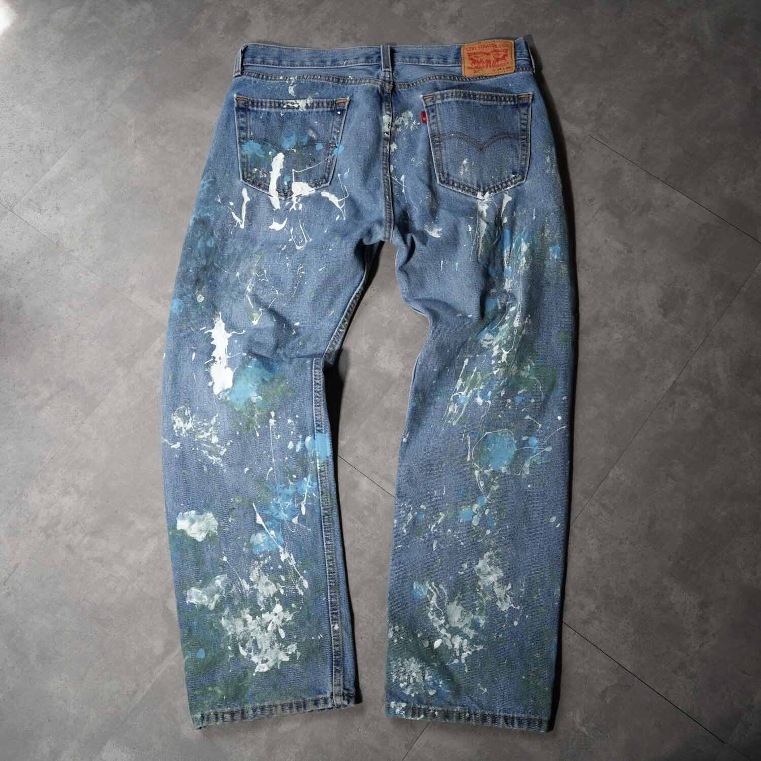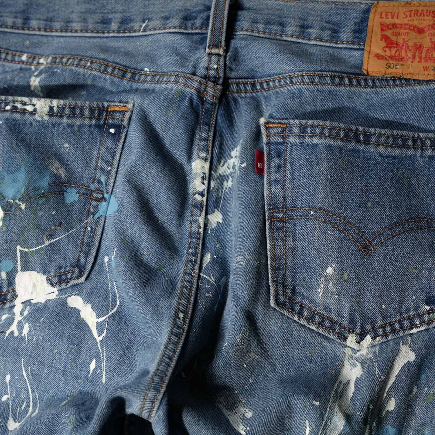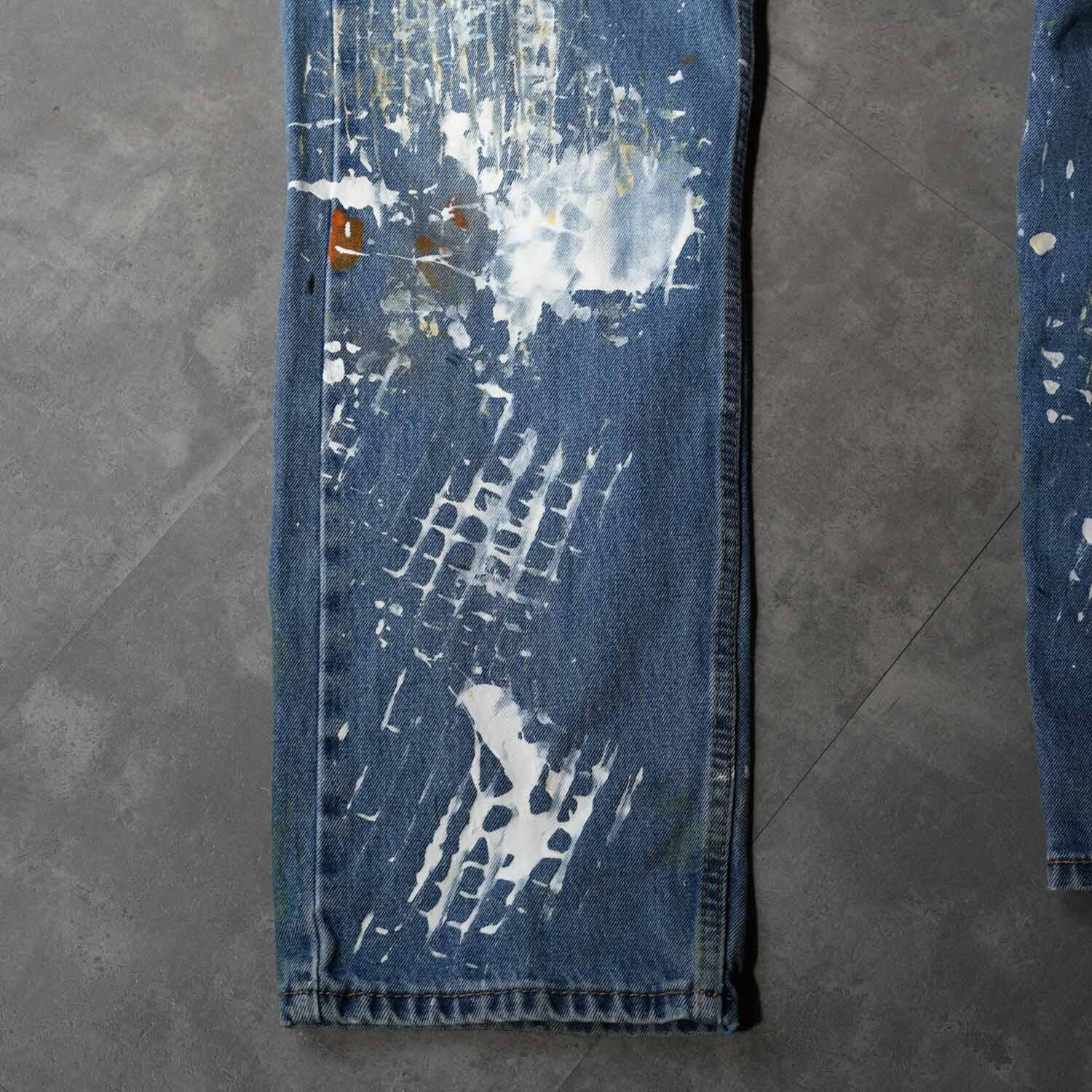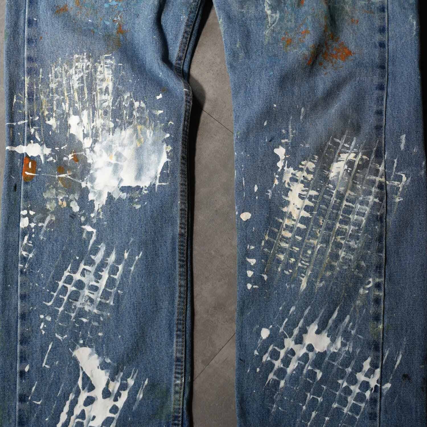 Levi's 505 W34×L29 Levi's 505 Indigo Denim Pants "Special Grid Paint Custom" リーバイス 505 インディゴデニム ペイントカスタム グリッド 網目 ワーク モード ストリート ボロ ペンキ飛び アート クラッシュ 音楽 パンク グランジ 古着【furugi-2184】