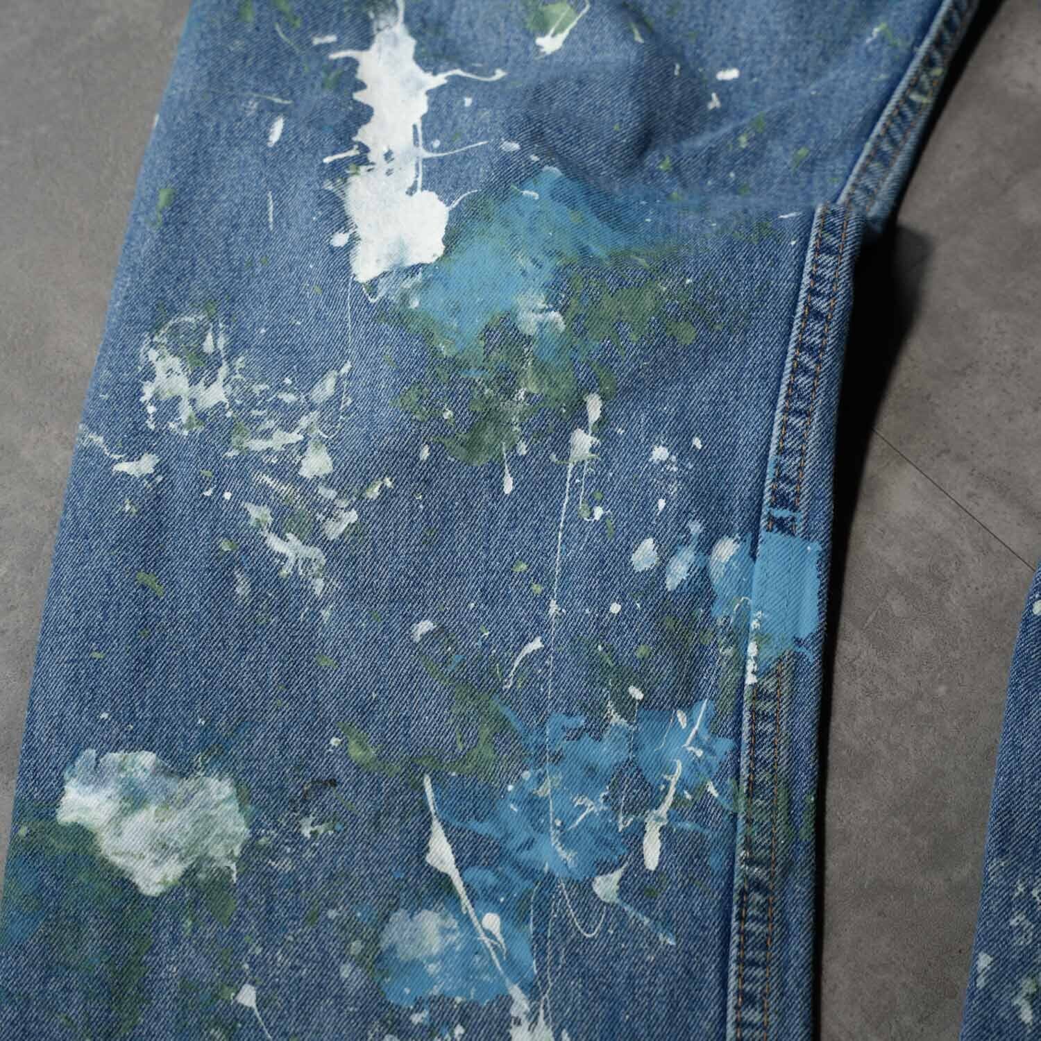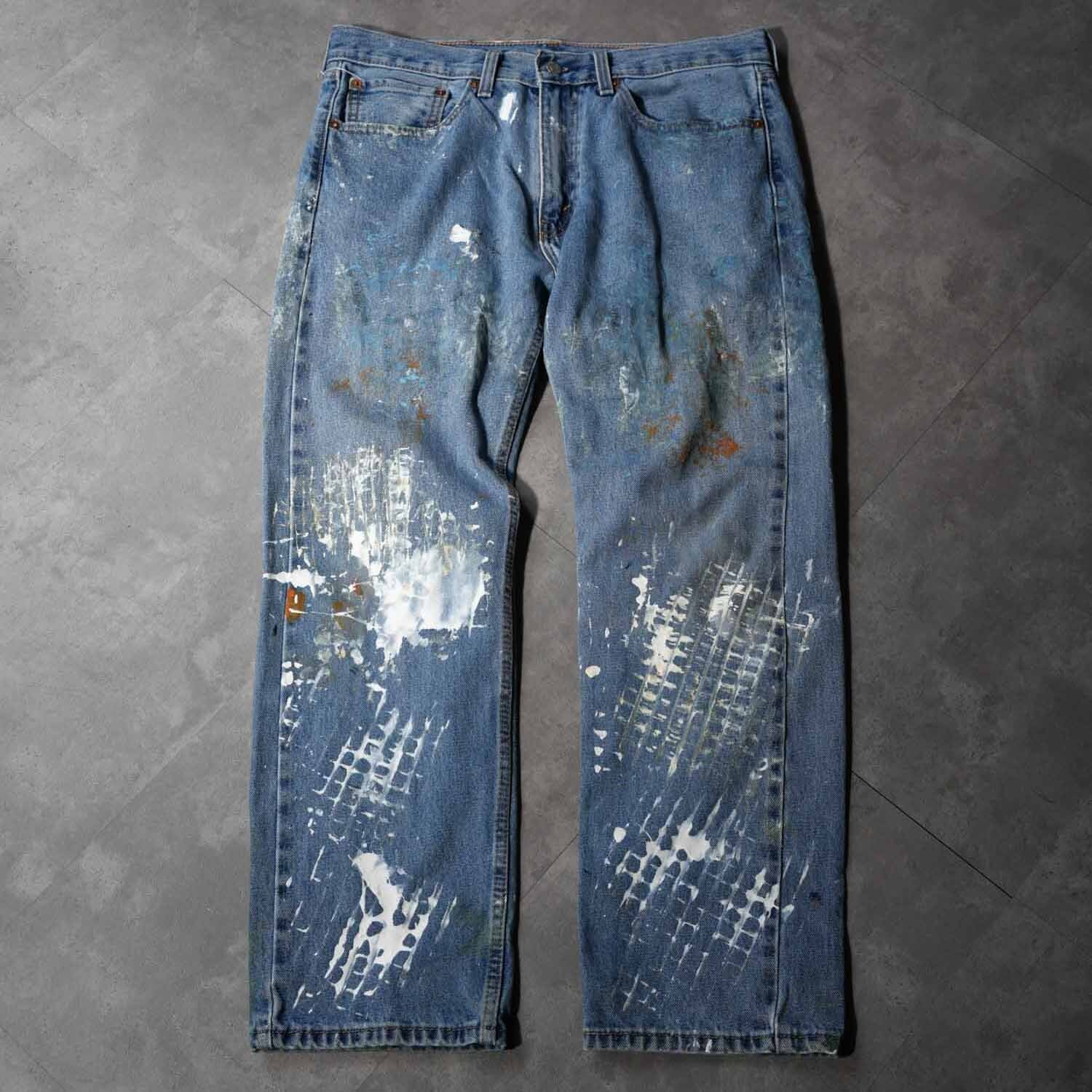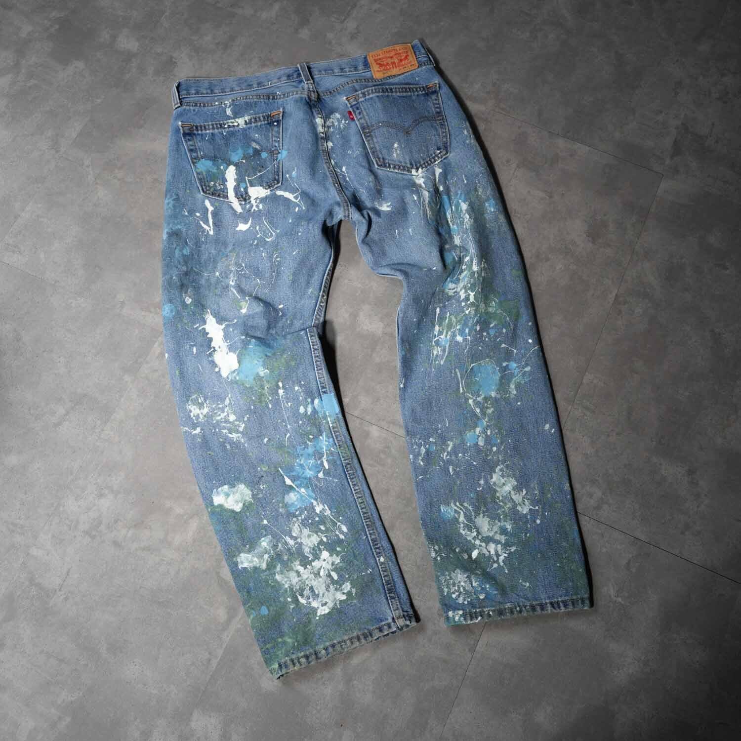 Levi's 505 W34×L29 Levi's 505 Indigo Denim Pants "Special Grid Paint Custom" リーバイス 505 インディゴデニム ペイントカスタム グリッド 網目 ワーク モード ストリート ボロ ペンキ飛び アート クラッシュ 音楽 パンク グランジ 古着【furugi-2184】