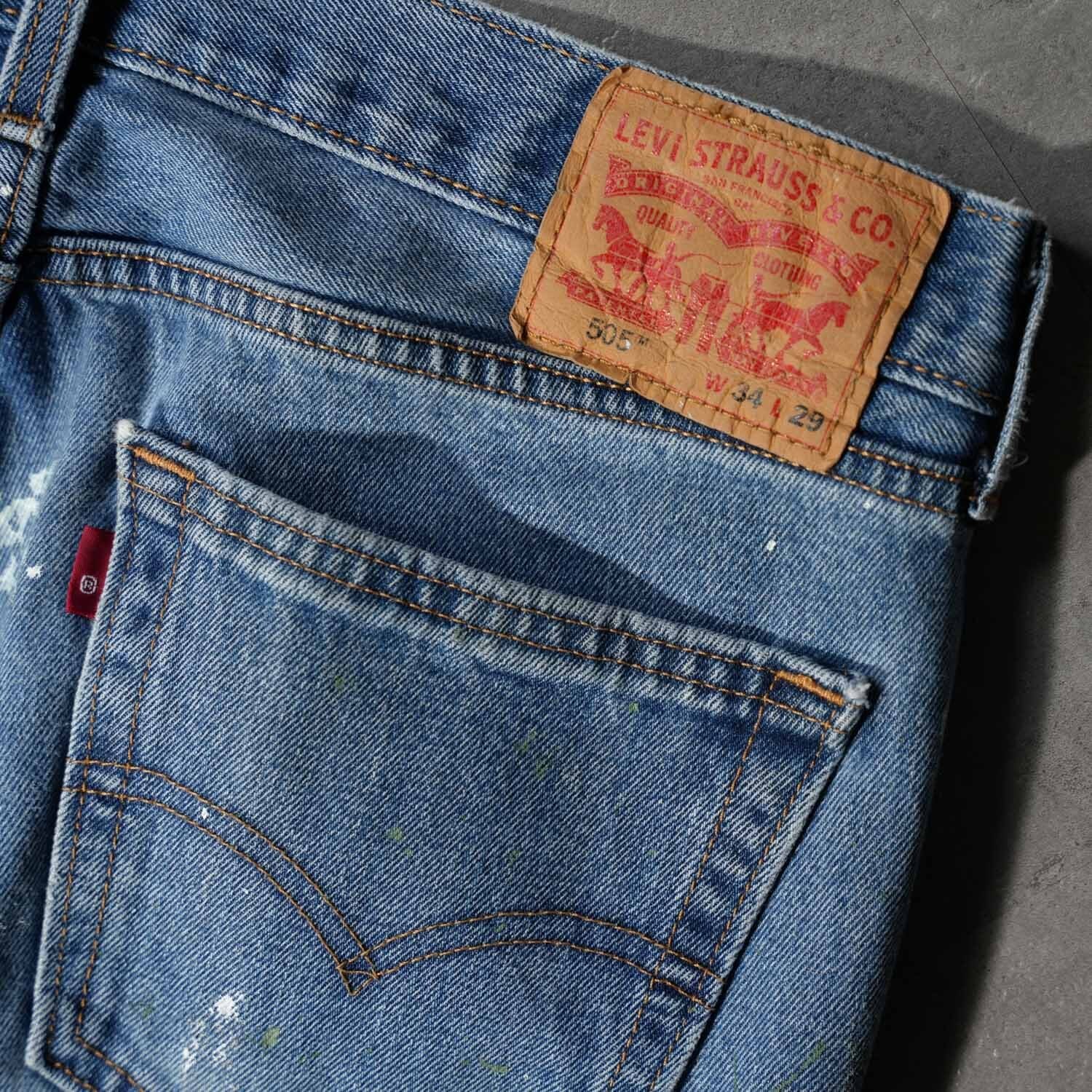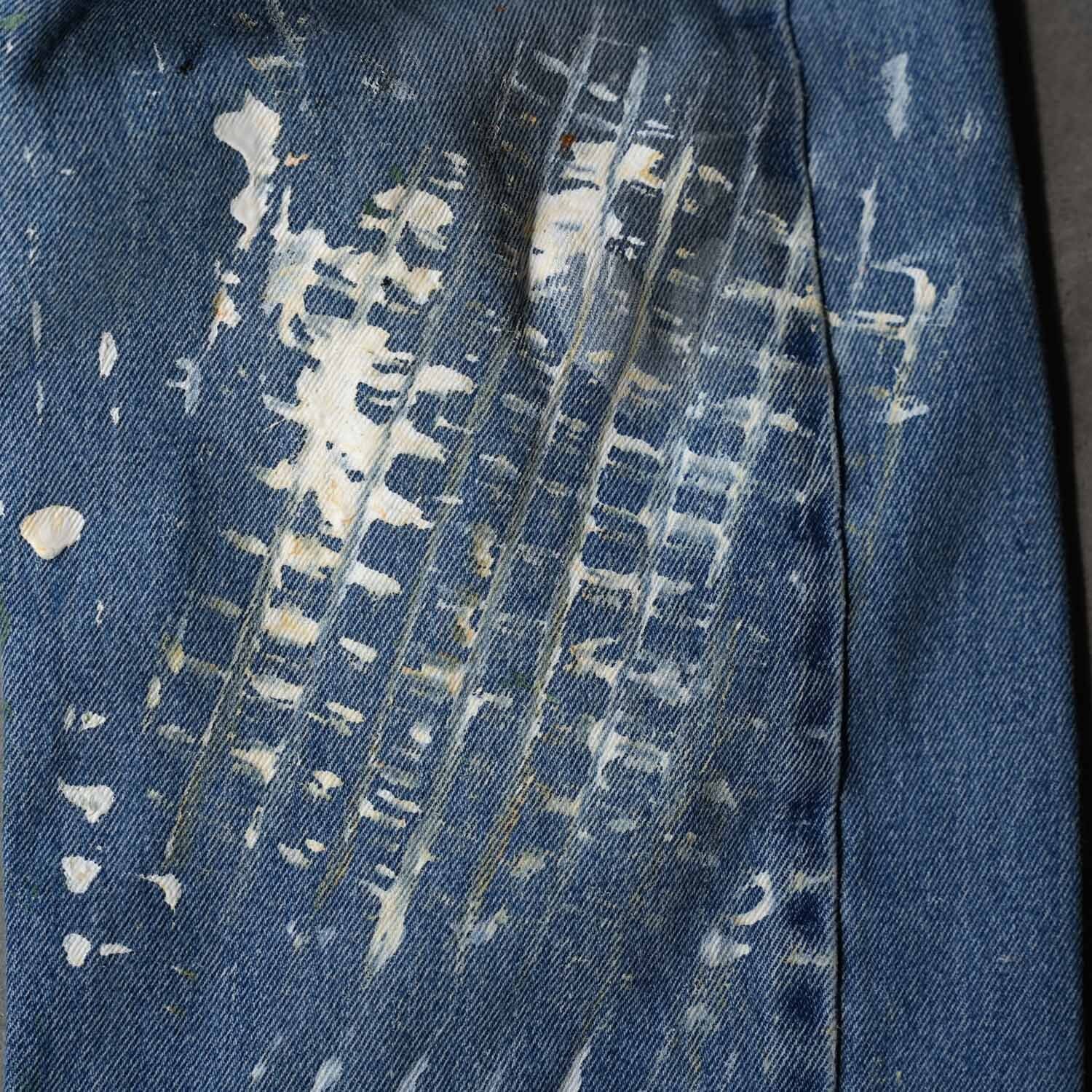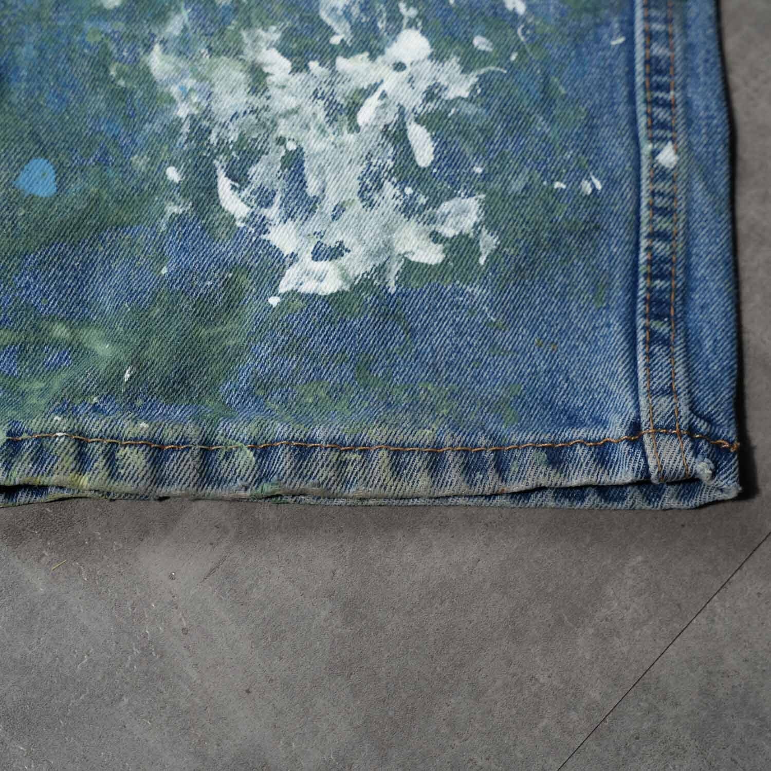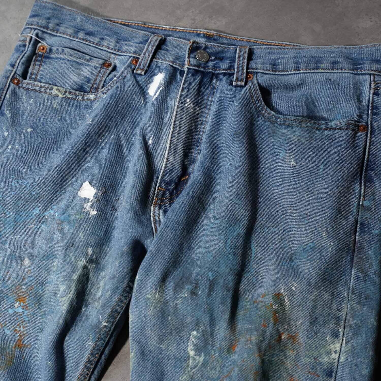 Levi's 505 W34×L29 Levi's 505 Indigo Denim Pants "Special Grid Paint Custom" リーバイス 505 インディゴデニム ペイントカスタム グリッド 網目 ワーク モード ストリート ボロ ペンキ飛び アート クラッシュ 音楽 パンク グランジ 古着【furugi-2184】