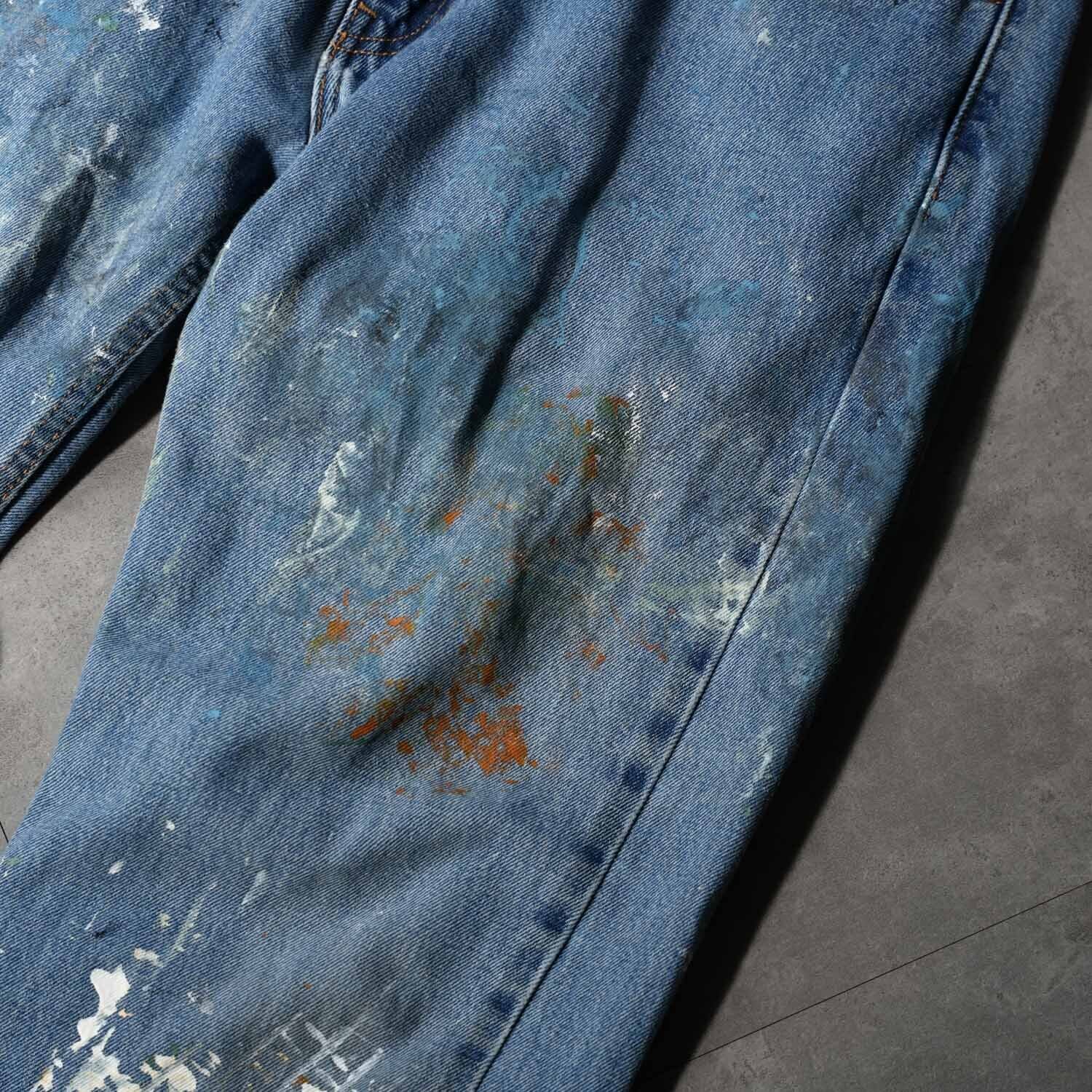 激しく、かつバランスよく配置されたペイントは、単なるワークウェアの枠を超え、アートな印象を与えます。デニムのブルーとペイントのコントラストが、コーディネートの主役として機能する一本です。