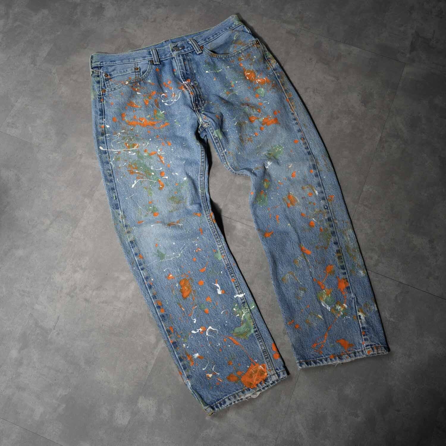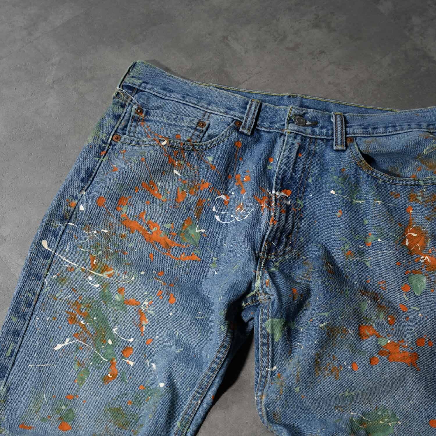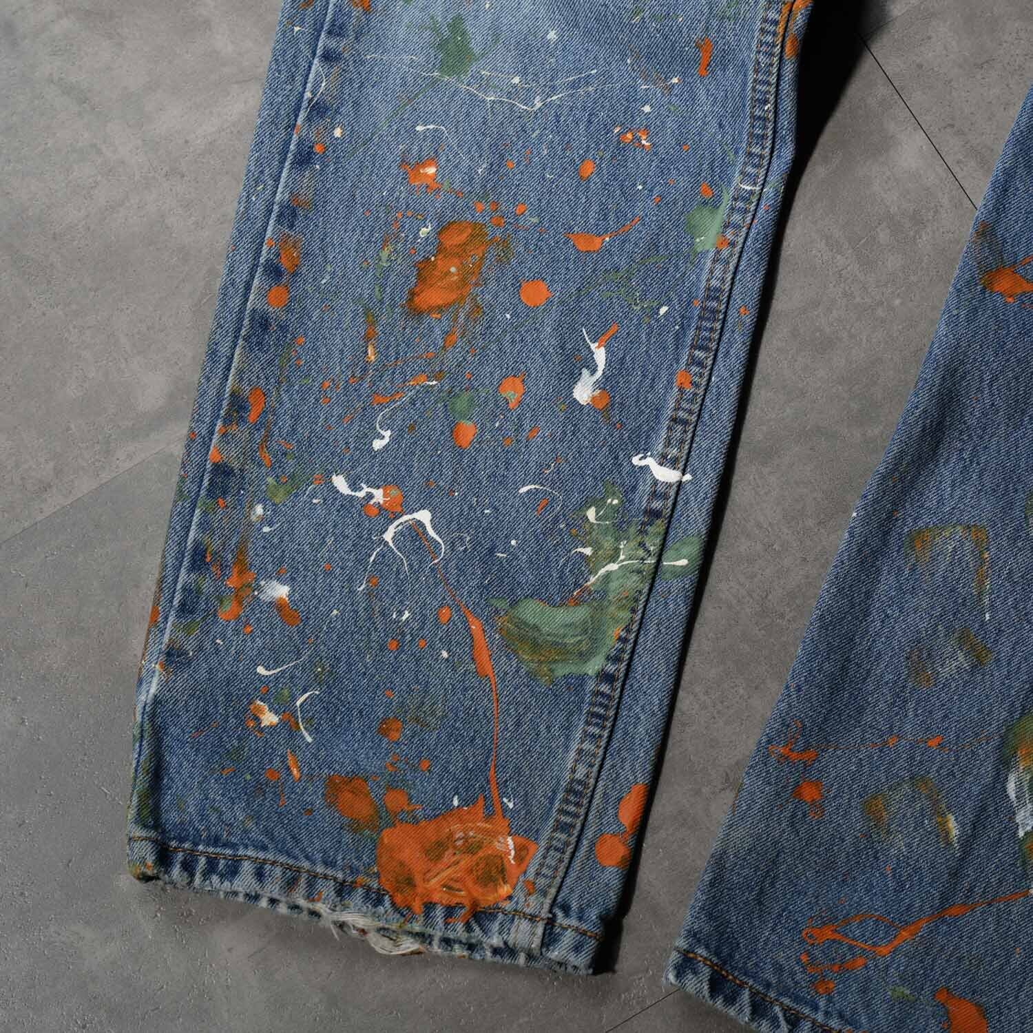 Levi's 505 W34×L29 Denim Pants "Multi Color Paint Custom" リーバイス 505 インディゴデニム デニムパンツ ペイントカスタム マルチカラー ワーク モード ストリート ボロ ペンキ飛び アート クラッシュ 音楽 パンク グランジ 古着【furugi-2185】