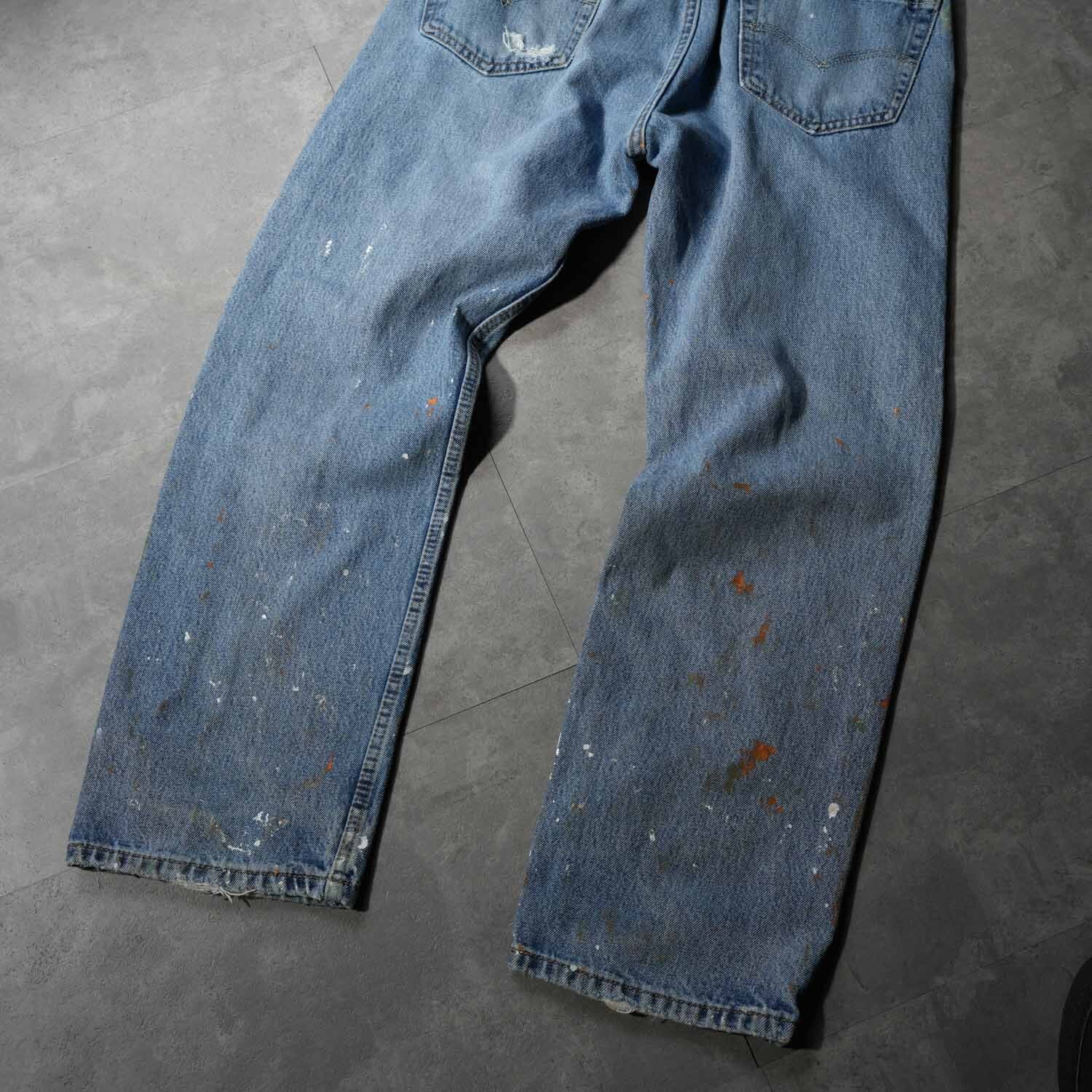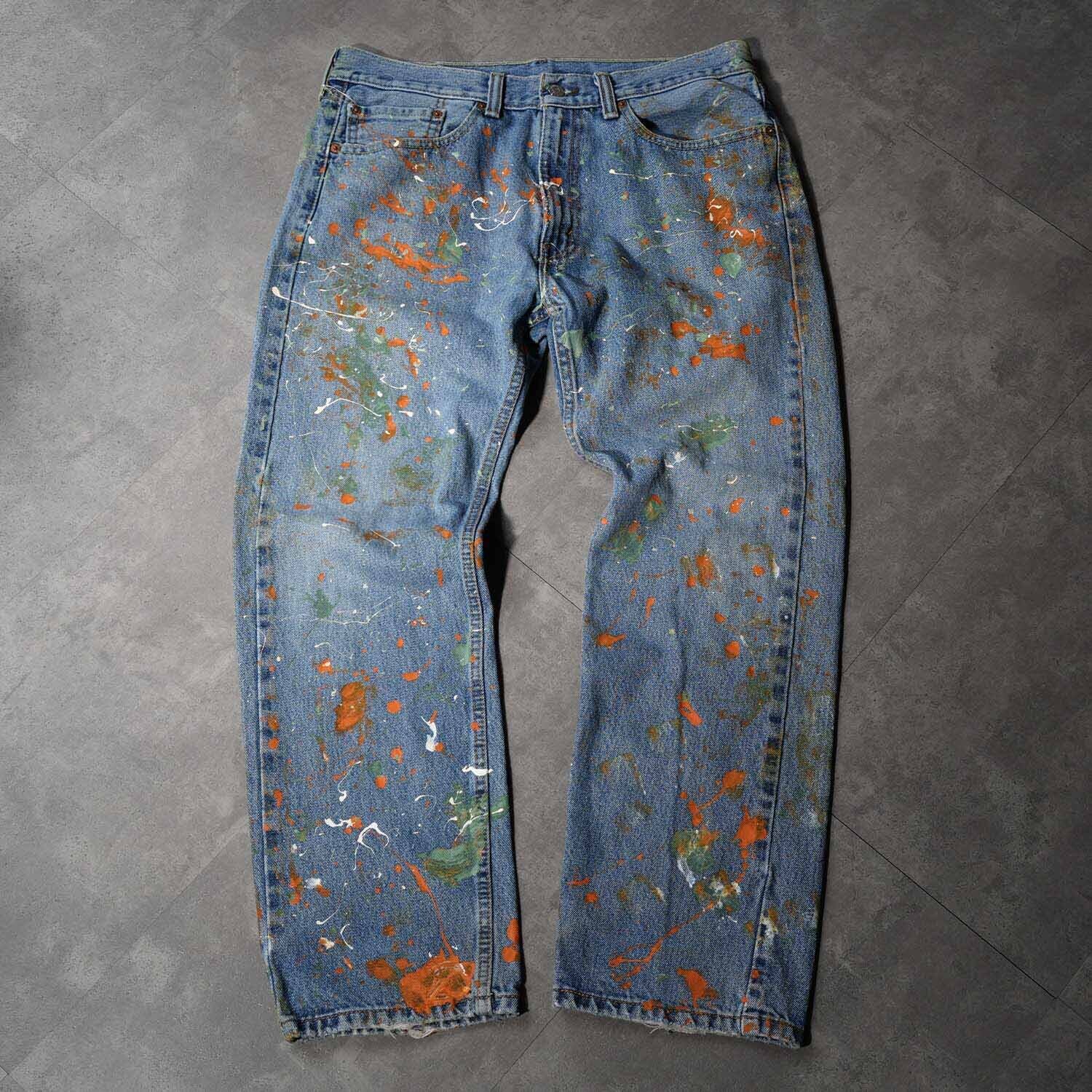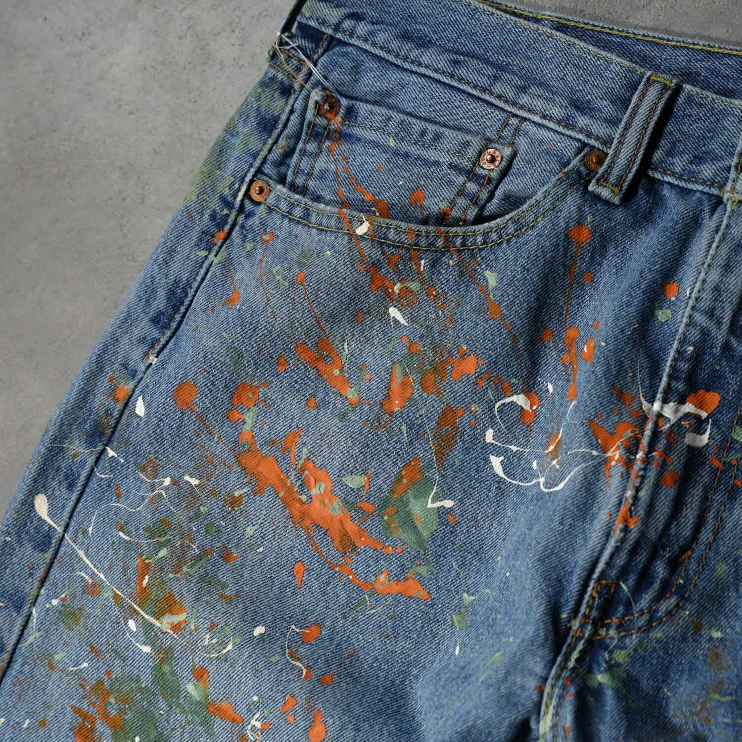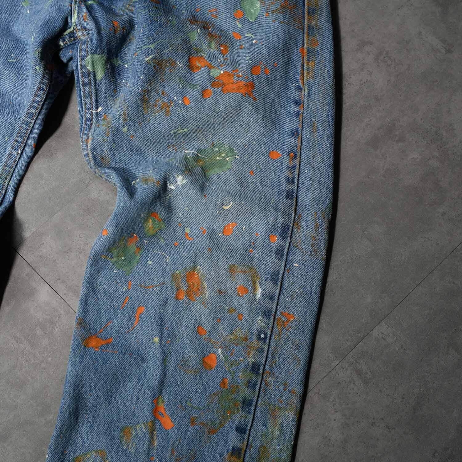 Levi's 505 W34×L29 Denim Pants "Multi Color Paint Custom" リーバイス 505 インディゴデニム デニムパンツ ペイントカスタム マルチカラー ワーク モード ストリート ボロ ペンキ飛び アート クラッシュ 音楽 パンク グランジ 古着【furugi-2185】