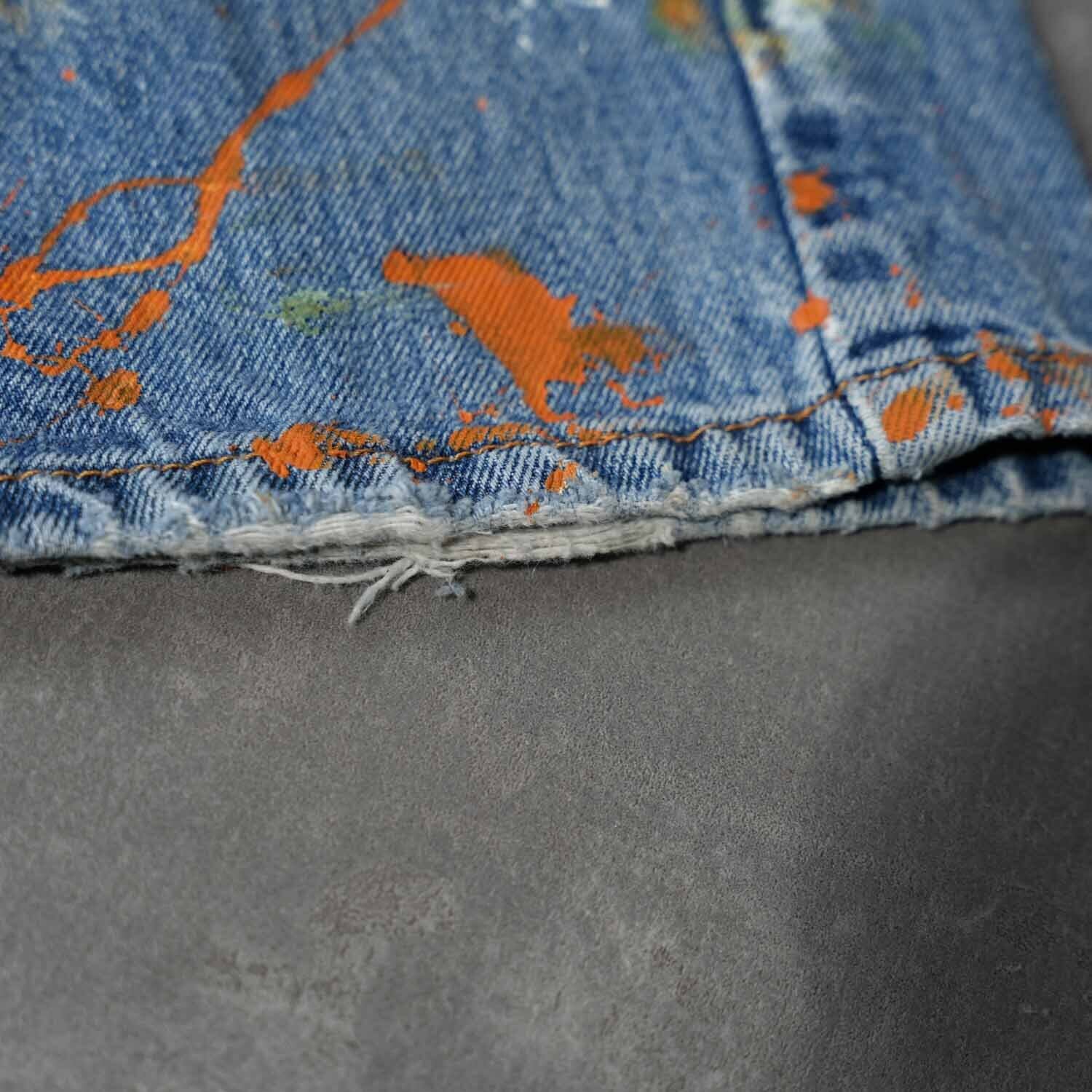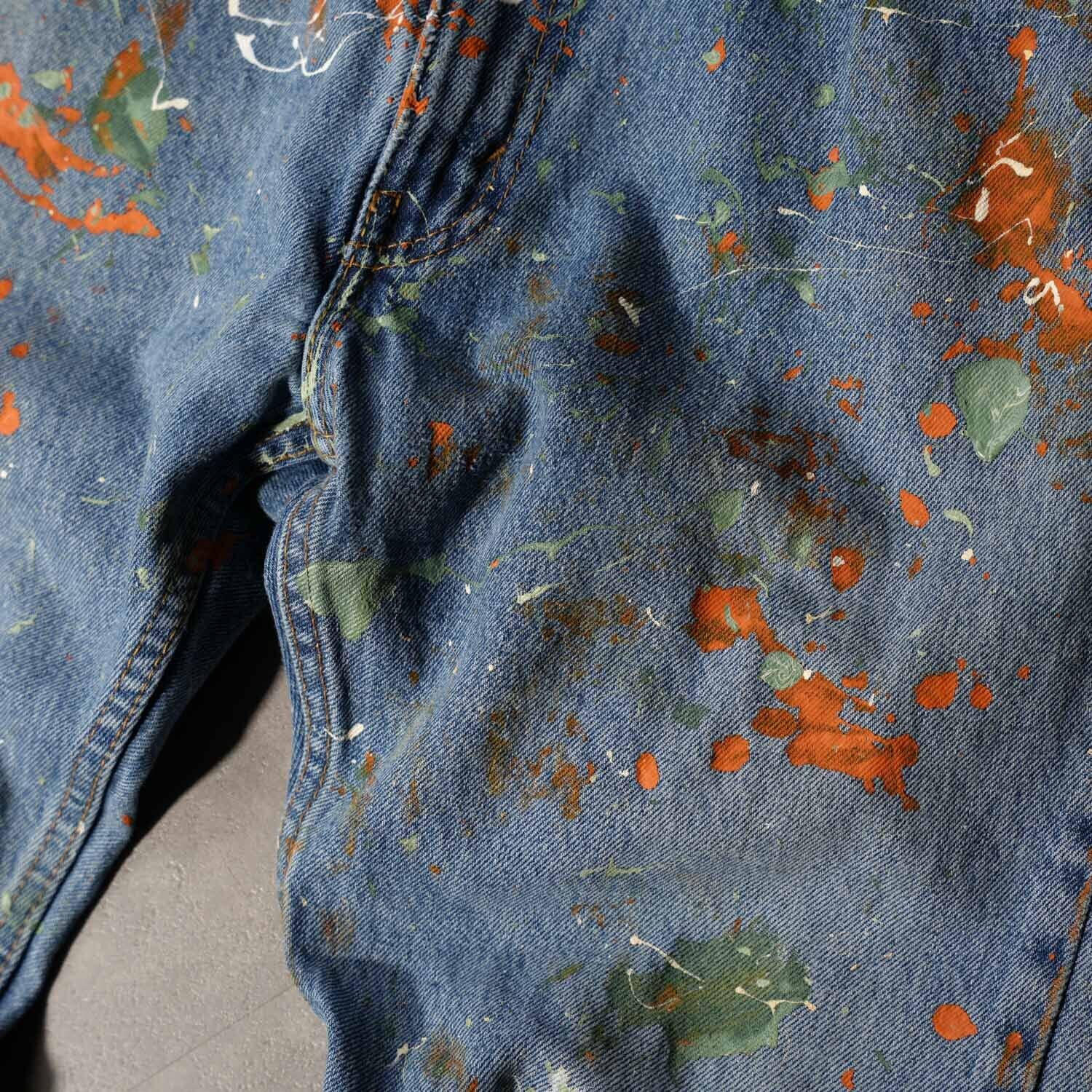 オレンジやグリーンを中心としたマルチカラーのスプラッターペイントが、デニム全体にリズムを生み出しています。
