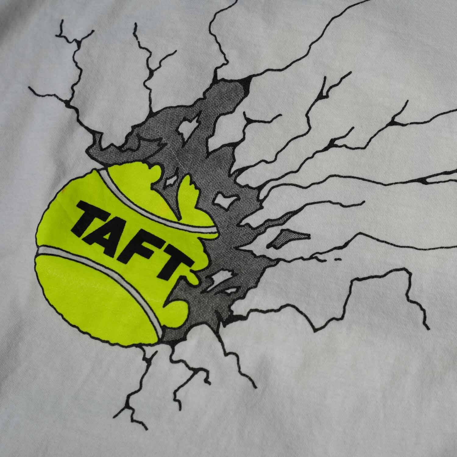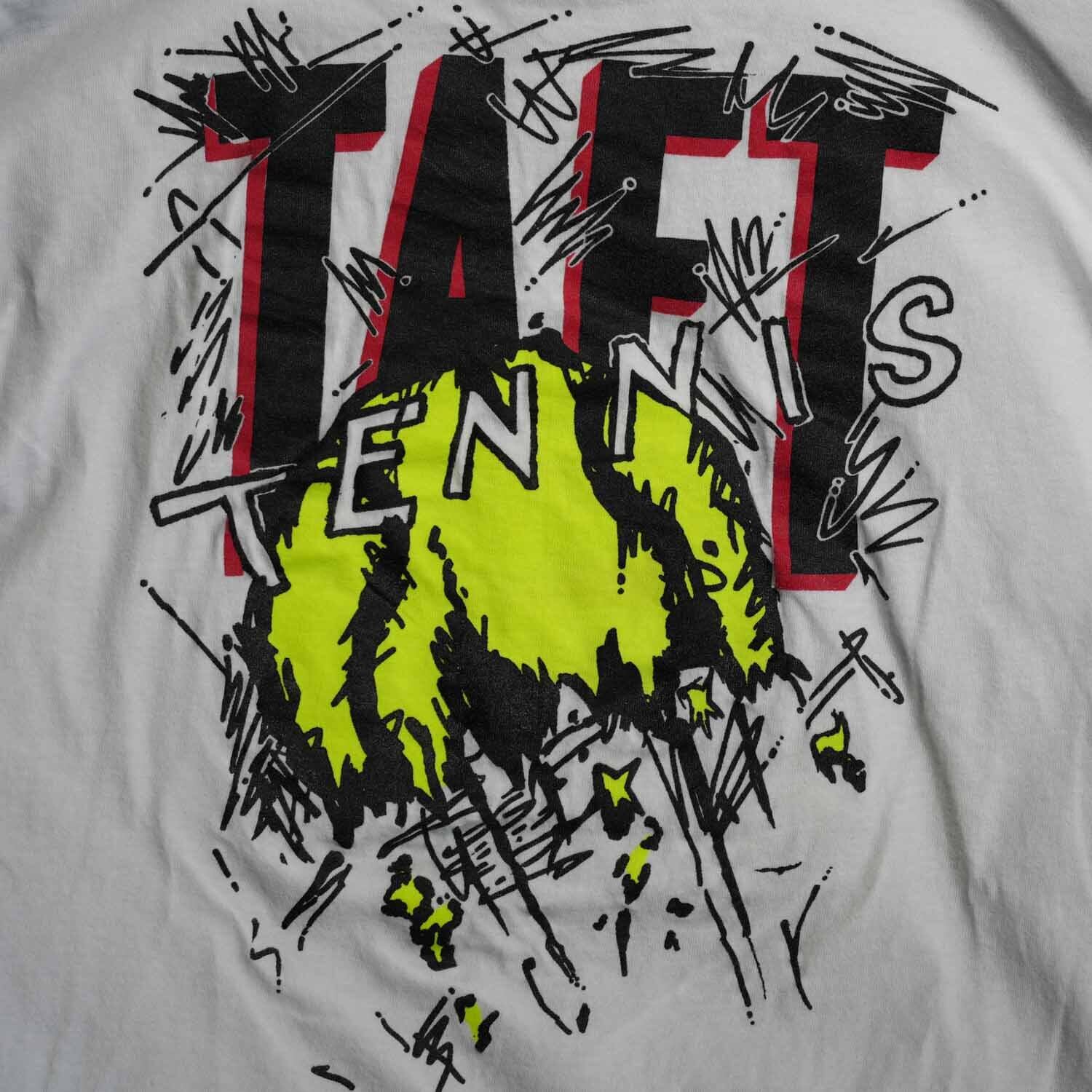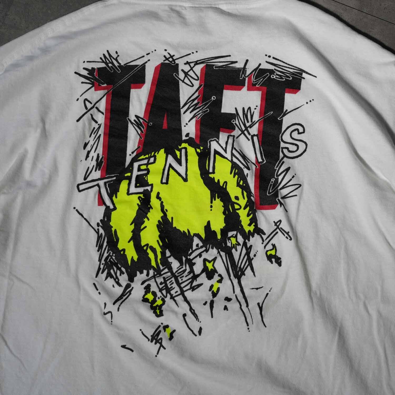 フロントには壁を突き破るような勢いのテニスボール、バックには力強い「TAFT TENNIS」のタイポグラフィとネオンイエローのボールが大胆にプリントされています。
