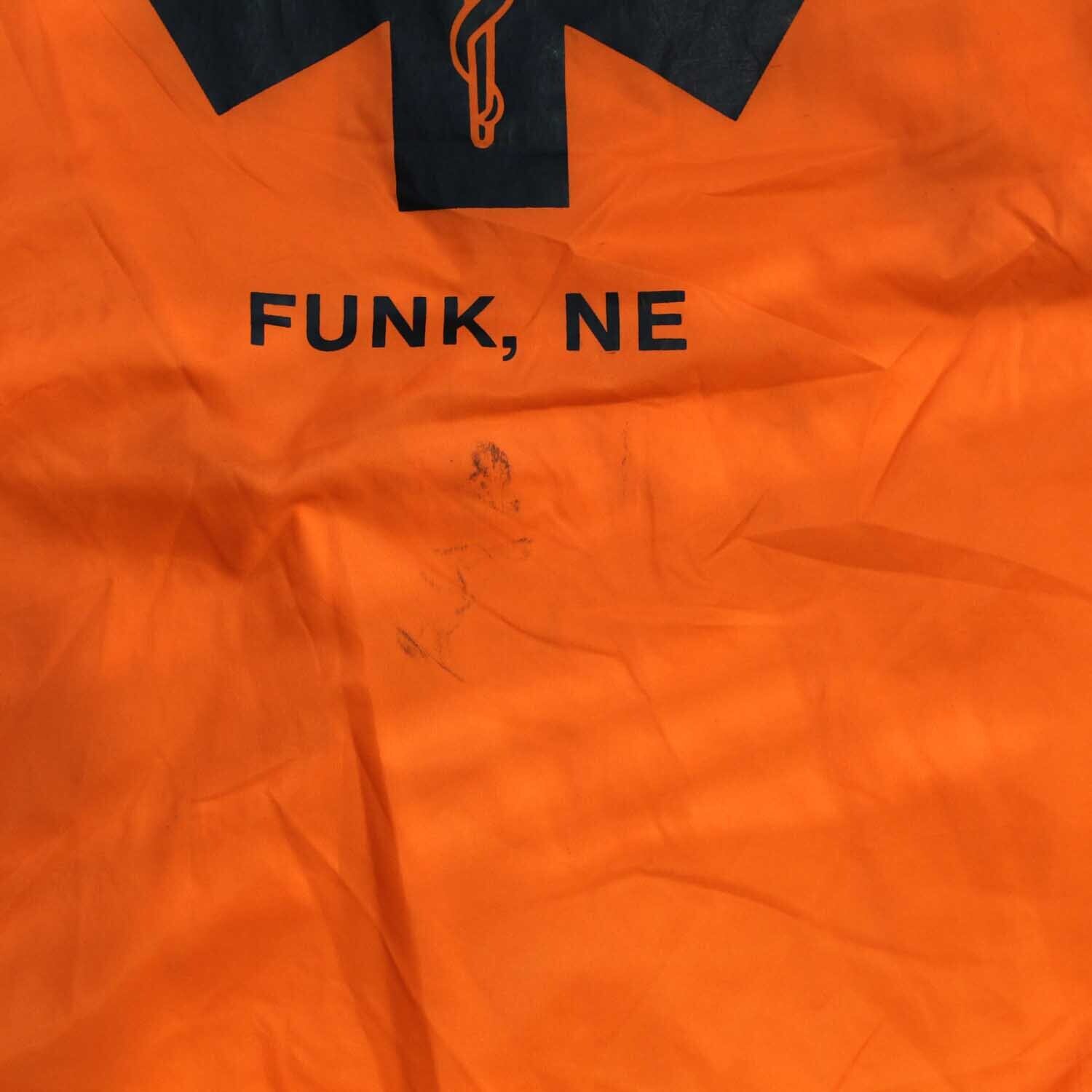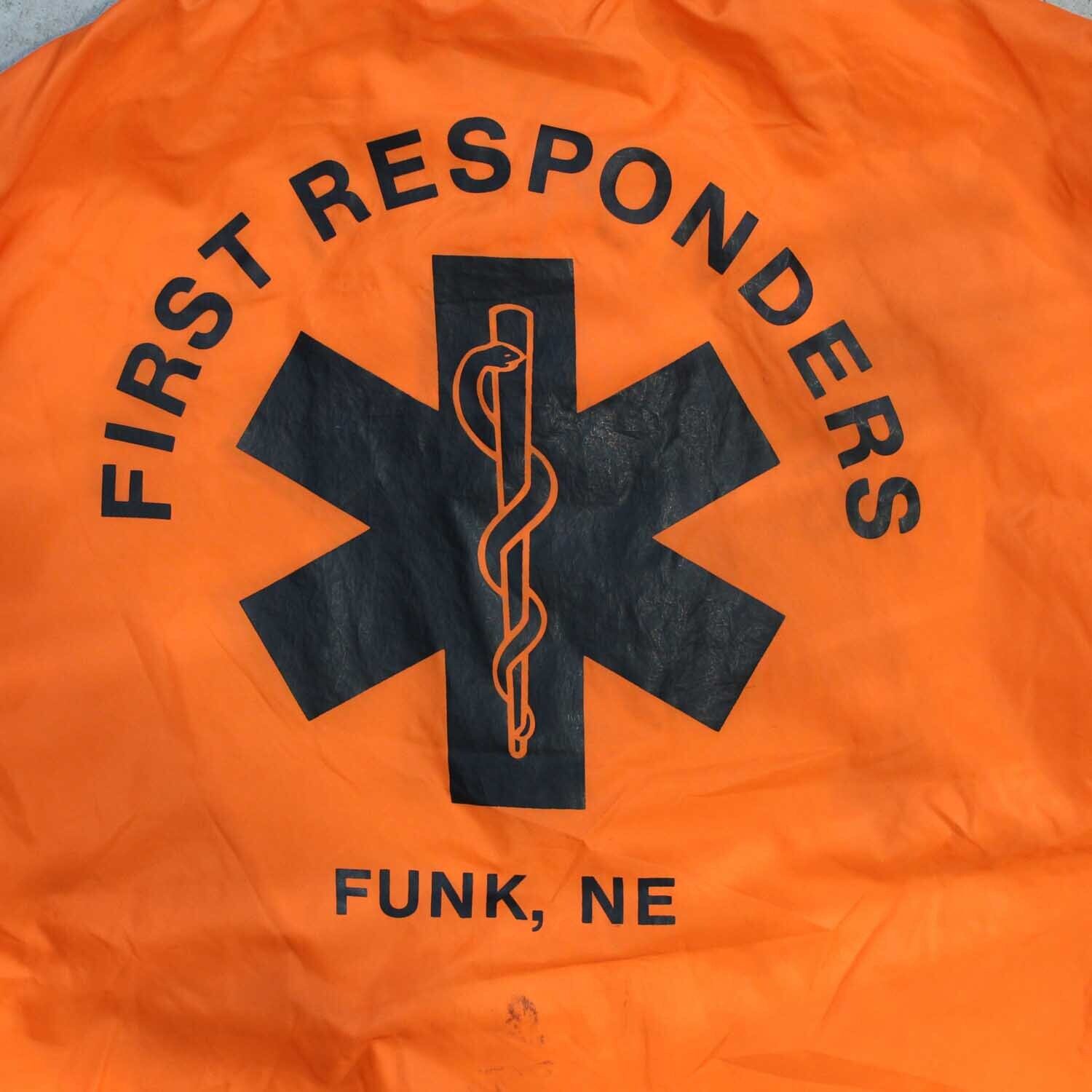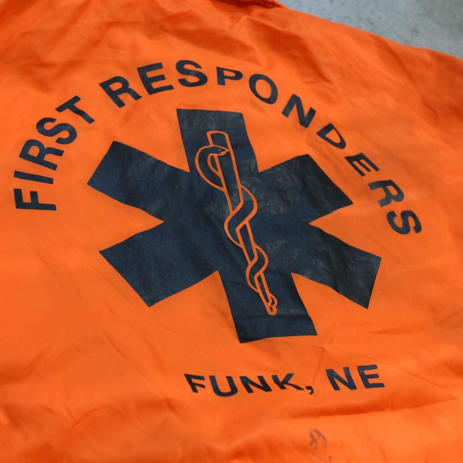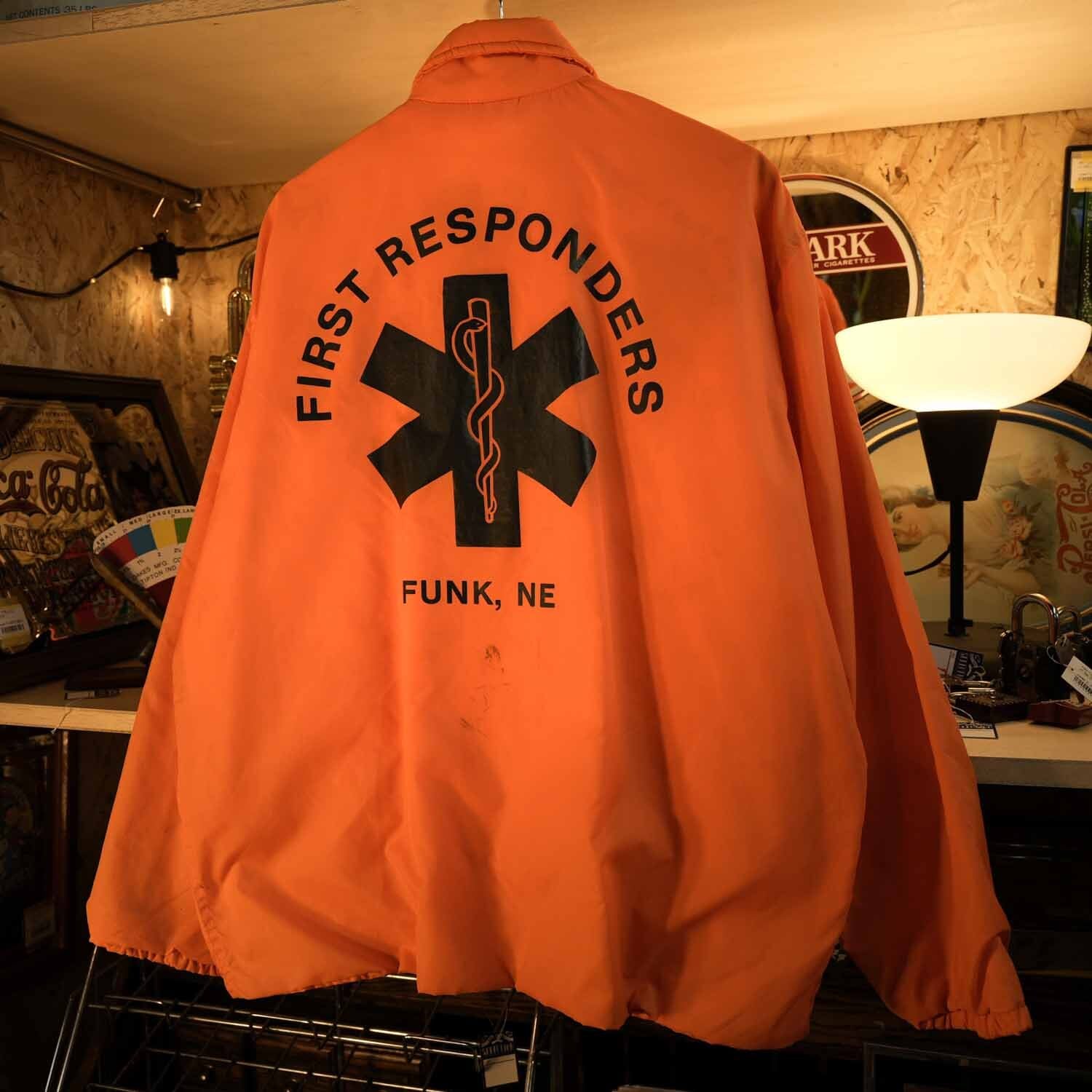 背面には、医療系救助部隊を示す “FIRST RESPONDERS” のビッグプリントと、緊急救命を象徴する“スター・オブ・ライフ”マークを大胆にレイアウト。背面のプリントから読み取れる “FUNK, NE(ネブラスカ州ファンク)” は、実在する小さな町の地域救助隊のユニフォームと思われ、アメカジ古着らしい“リアルワーク”の背景が、他にはないストーリー性を生んでいます。