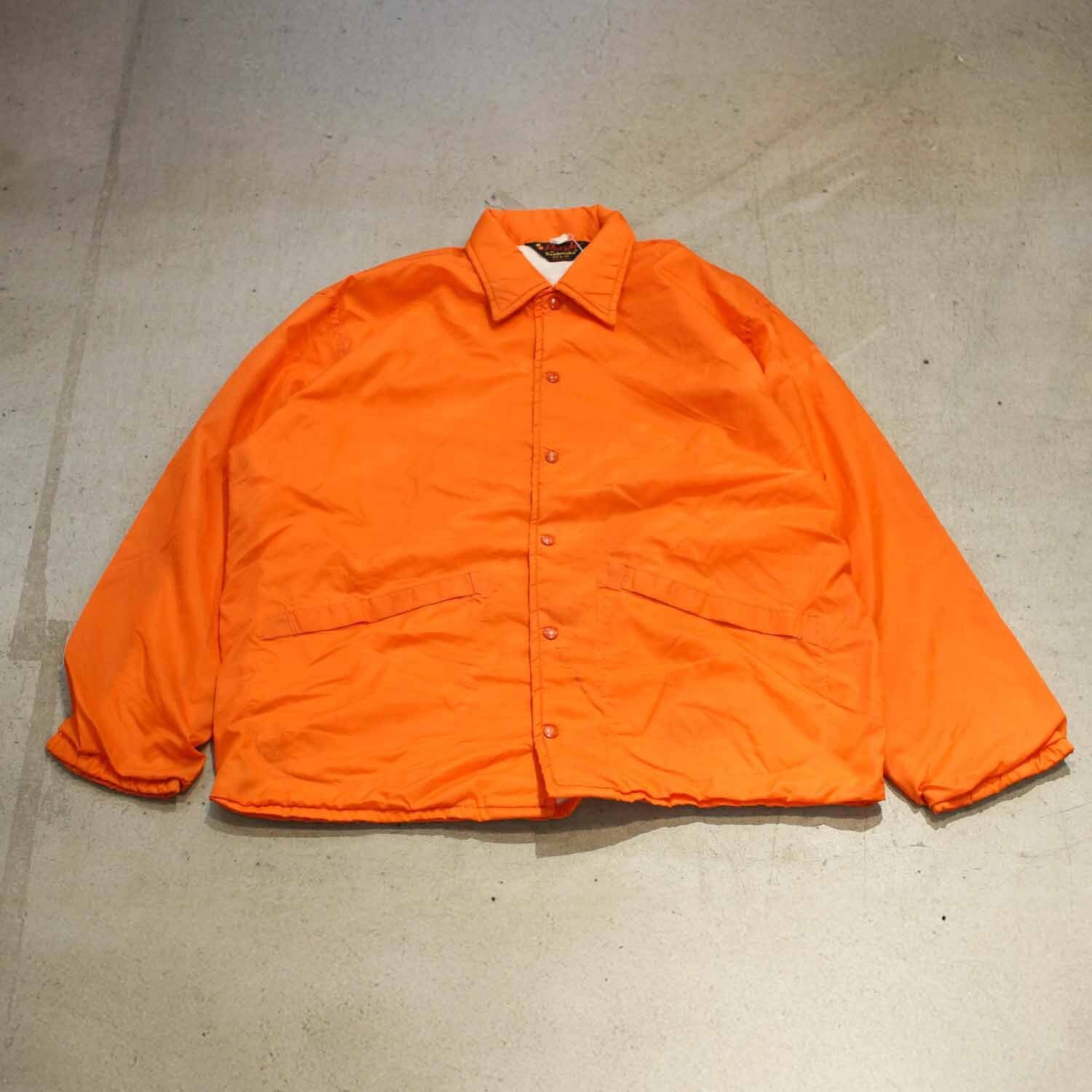 70s 80s プラジャック コーチジャケット オレンジ Lサイズ程度 ファーストレスポンダー FIRST RESPONDERS プリント アメリカ ライトアウター Dunbrooke Pla-Jac 古着【furugi-1286】